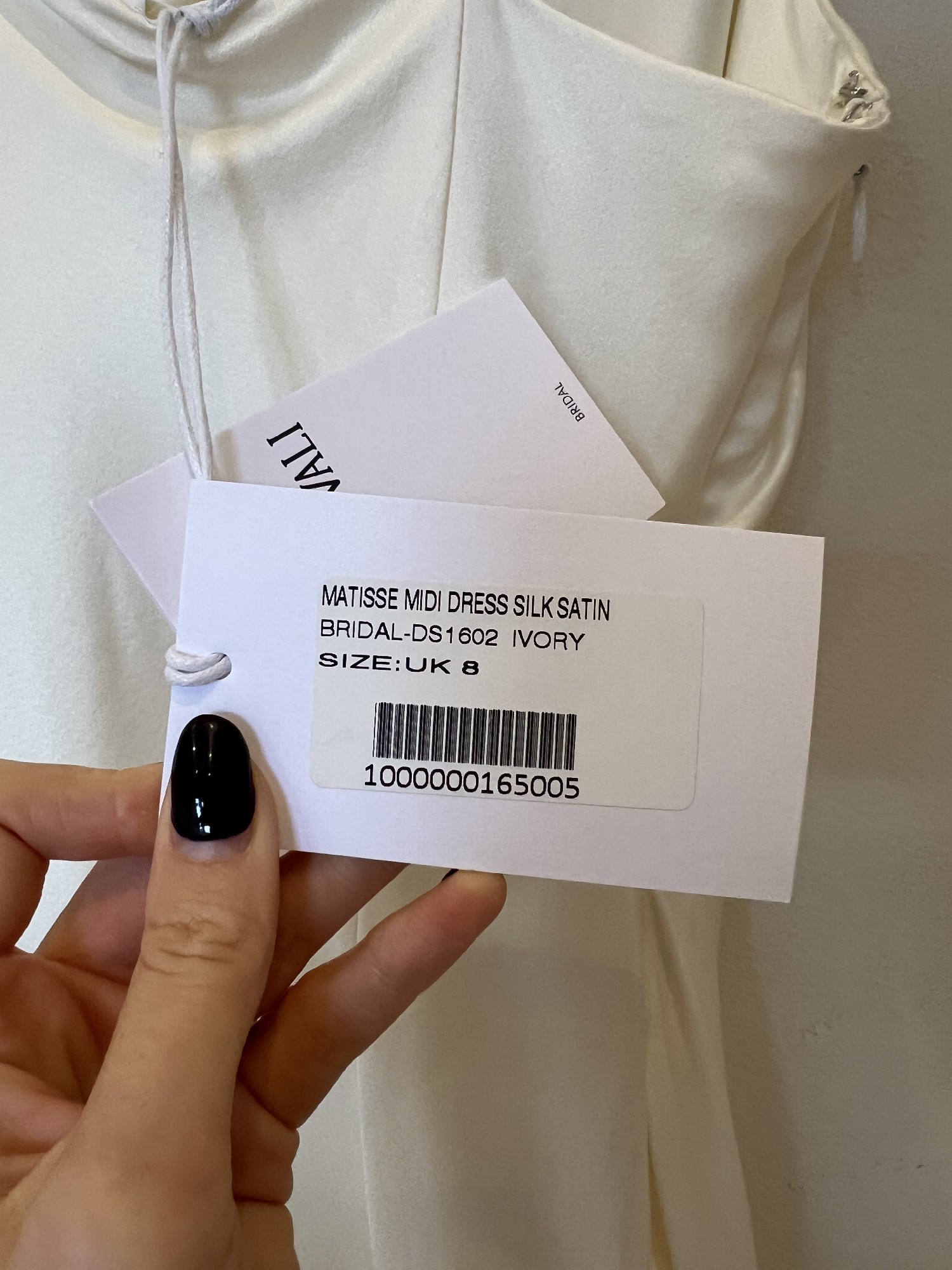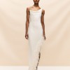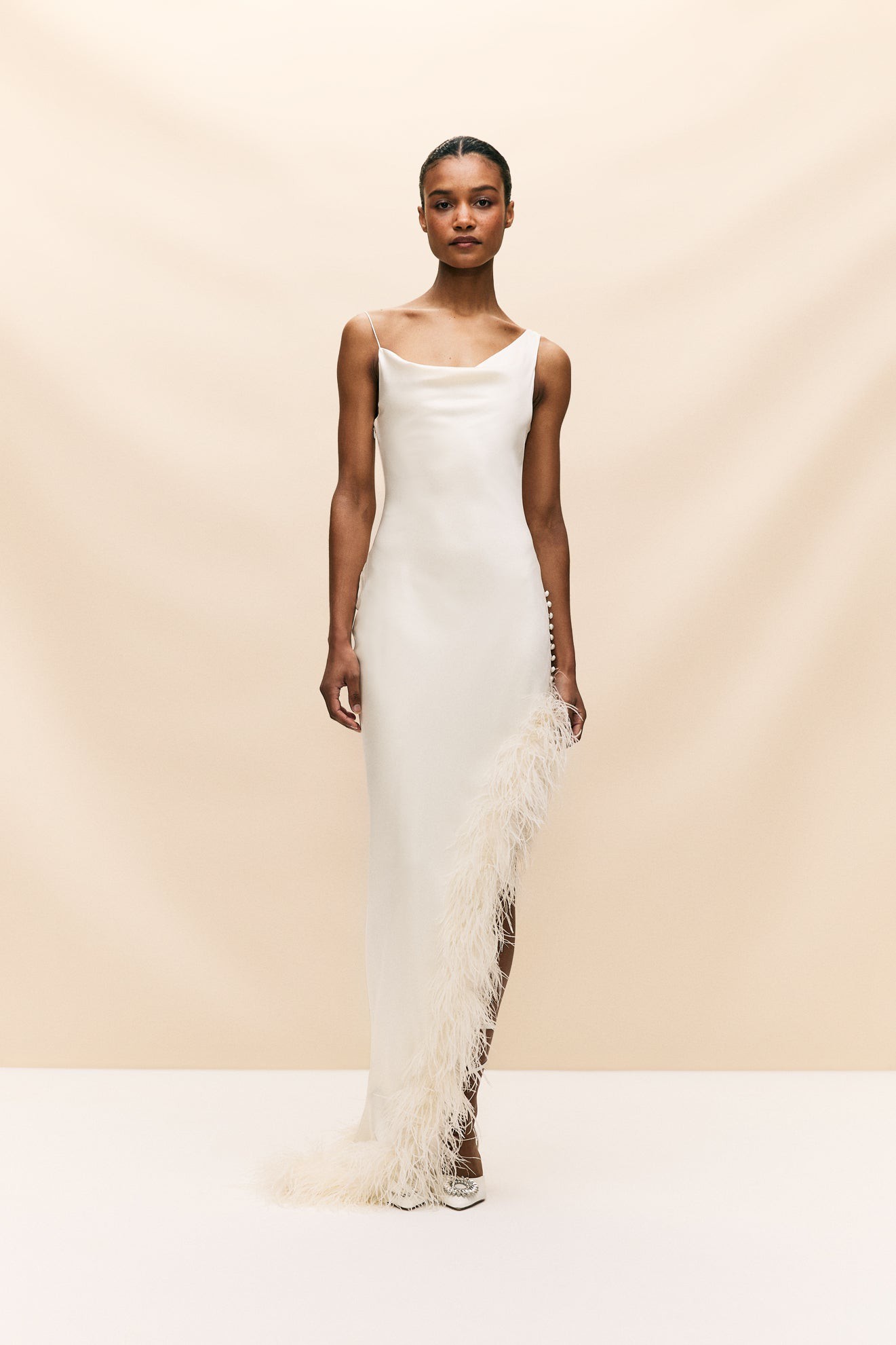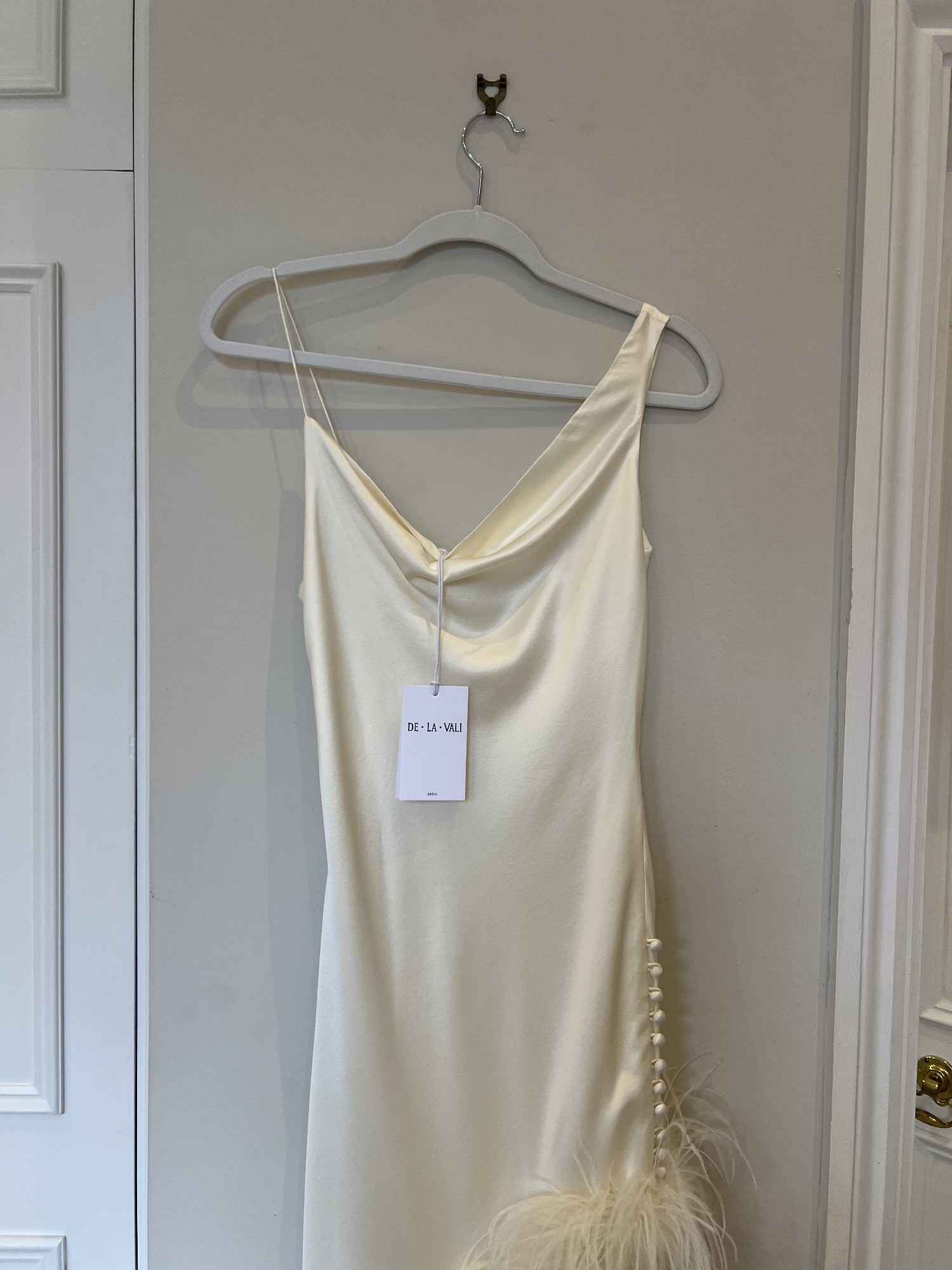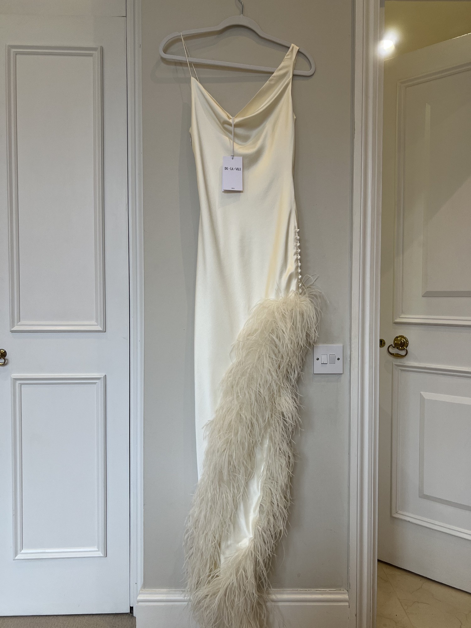 An event worthy and captivating signature style perfect for any bridal occasion, this De La Vali showstopper is guaranteed to make the desired entrance. Discover this bias-cut slinky silhouette with asymmetric lustrous feather trim detailing in opulent ivory silk that truly embodies the brands Ibizan heritage.