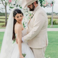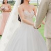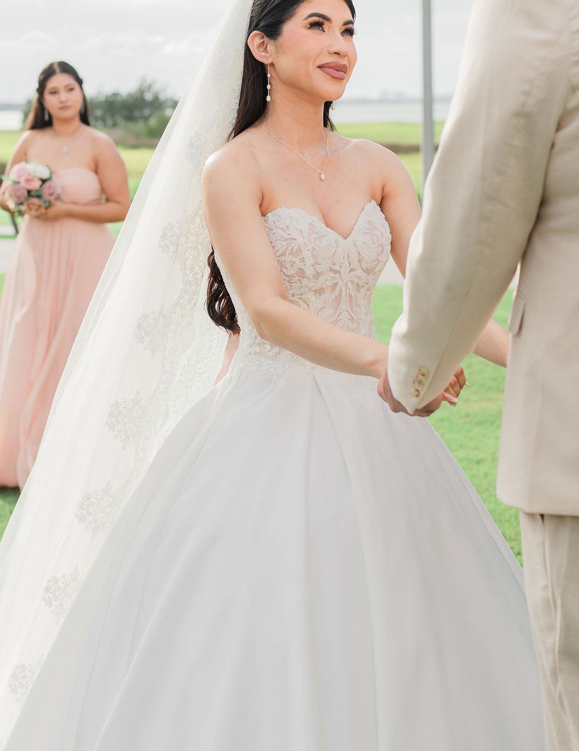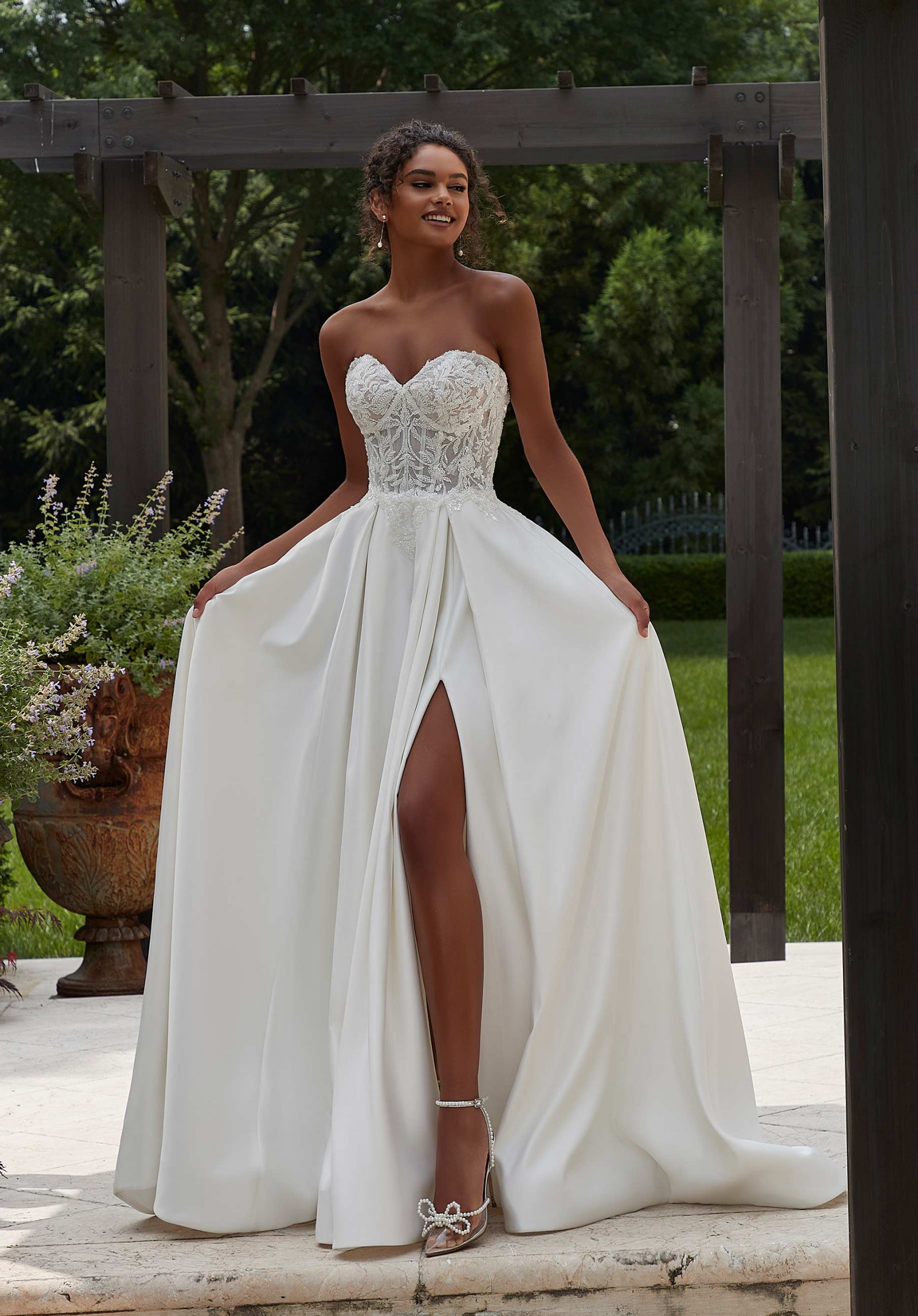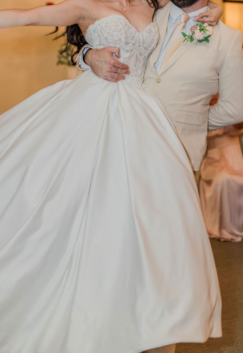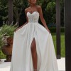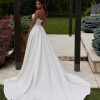 This wedding dress is an elegant A-line with classic details. The strapless sweetheart bodice features intricate frosted, embroidery with boning for added structure and support. The sleek, pleated satin skirt creates a lovely contrast, floating off the body in an A-line silhouette. The front skirt slit shows off some skin and we love the fun addition of pockets to the gown. Color is Ivory.