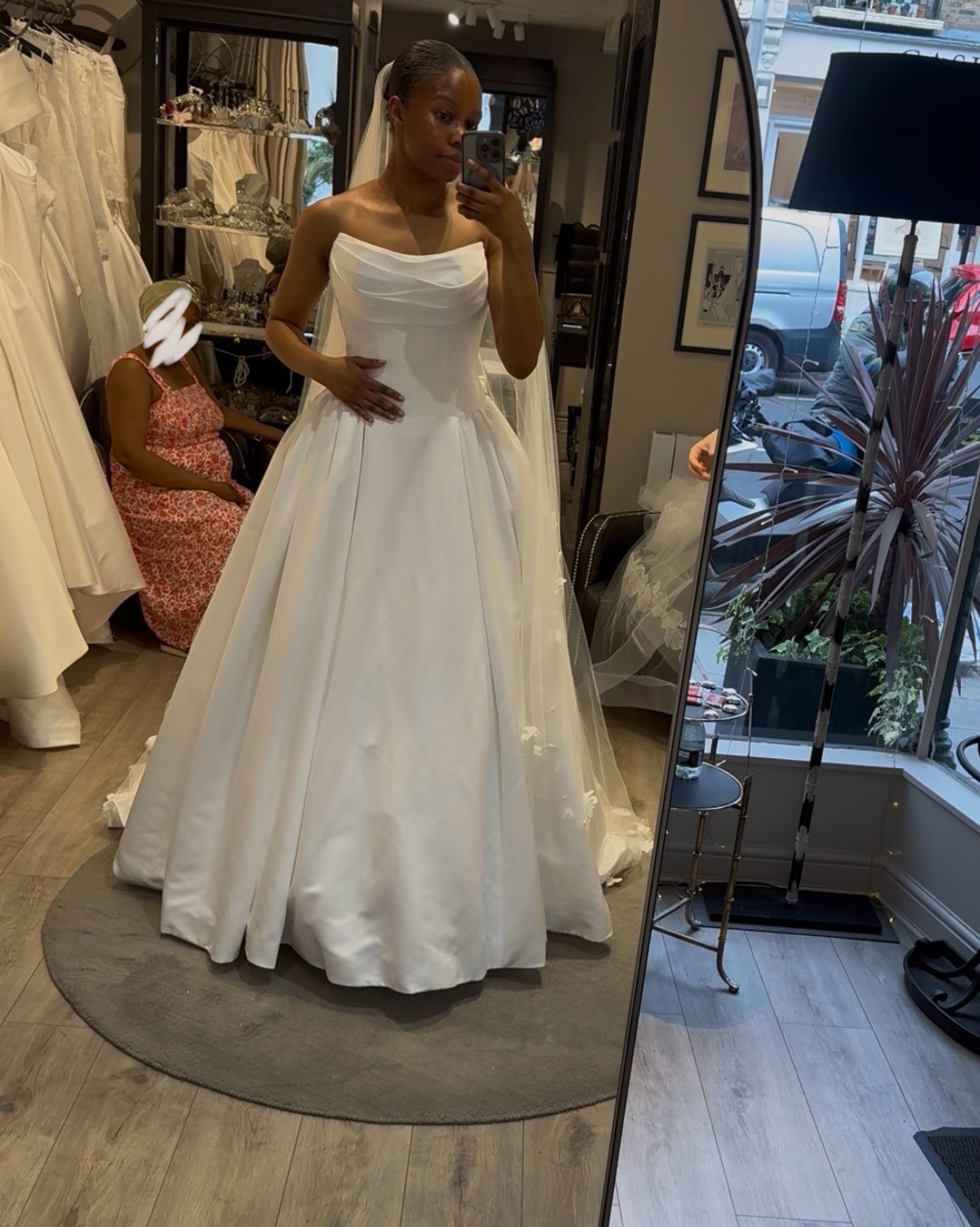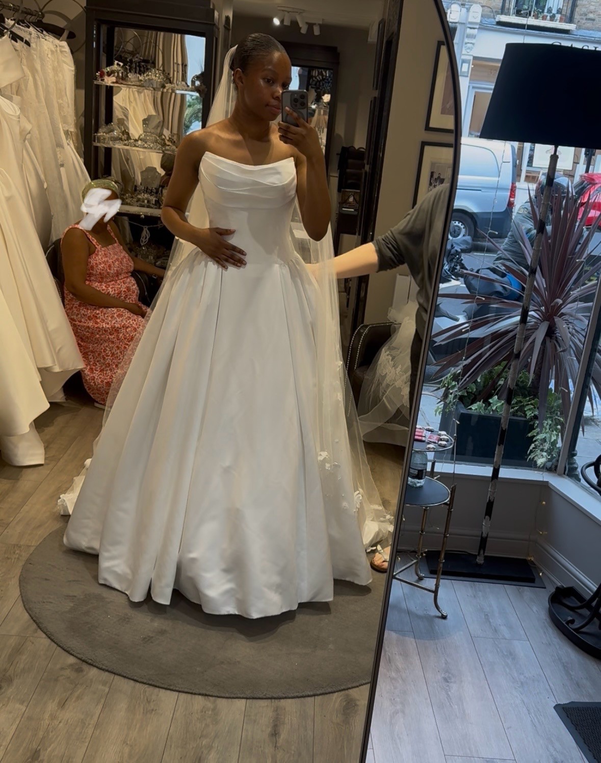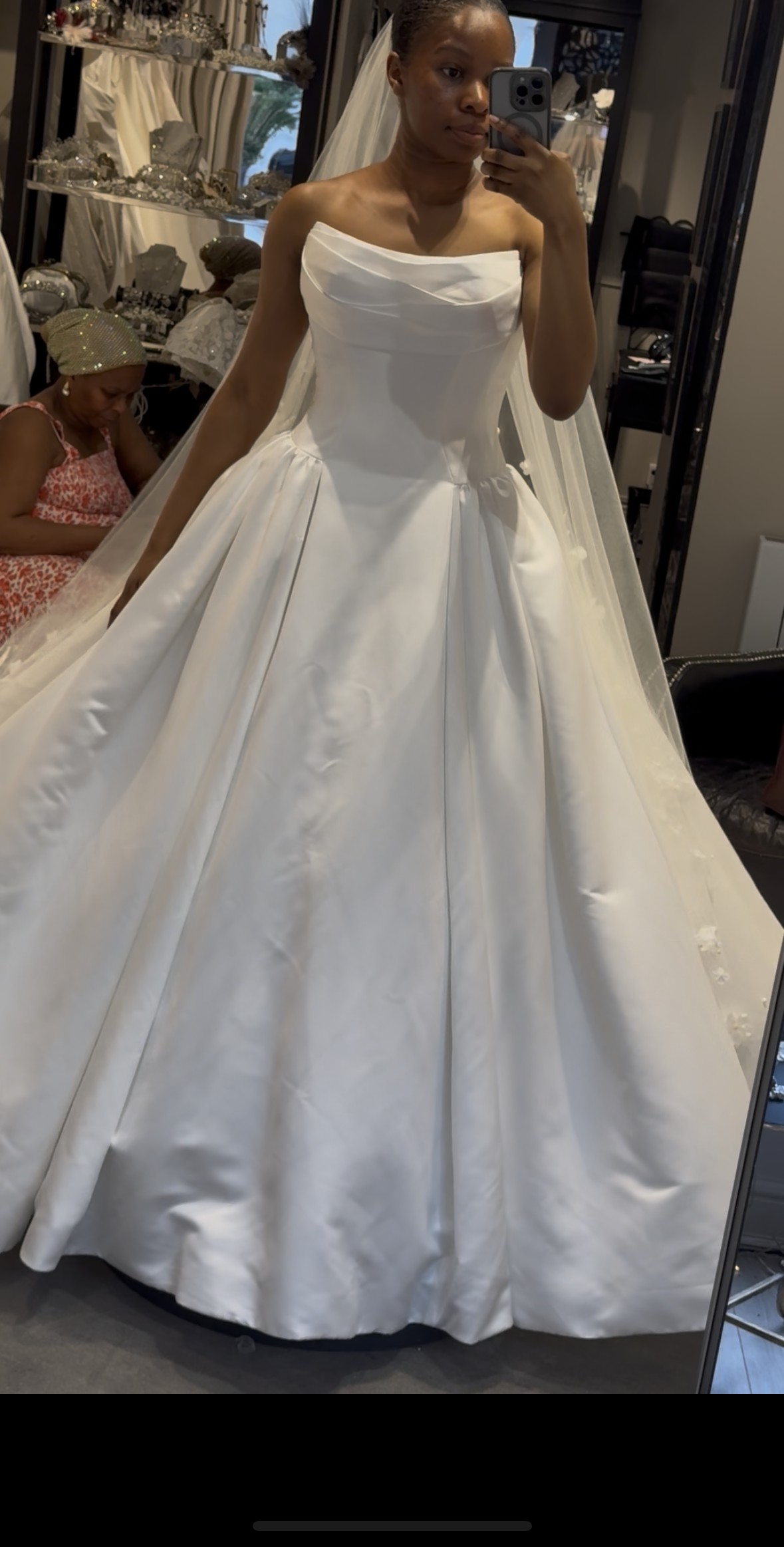 Princess gown with a dramatic ballgown shape, crafted from white satin. Including a cathedral length lace veil (Not the veil shown in the pictures)