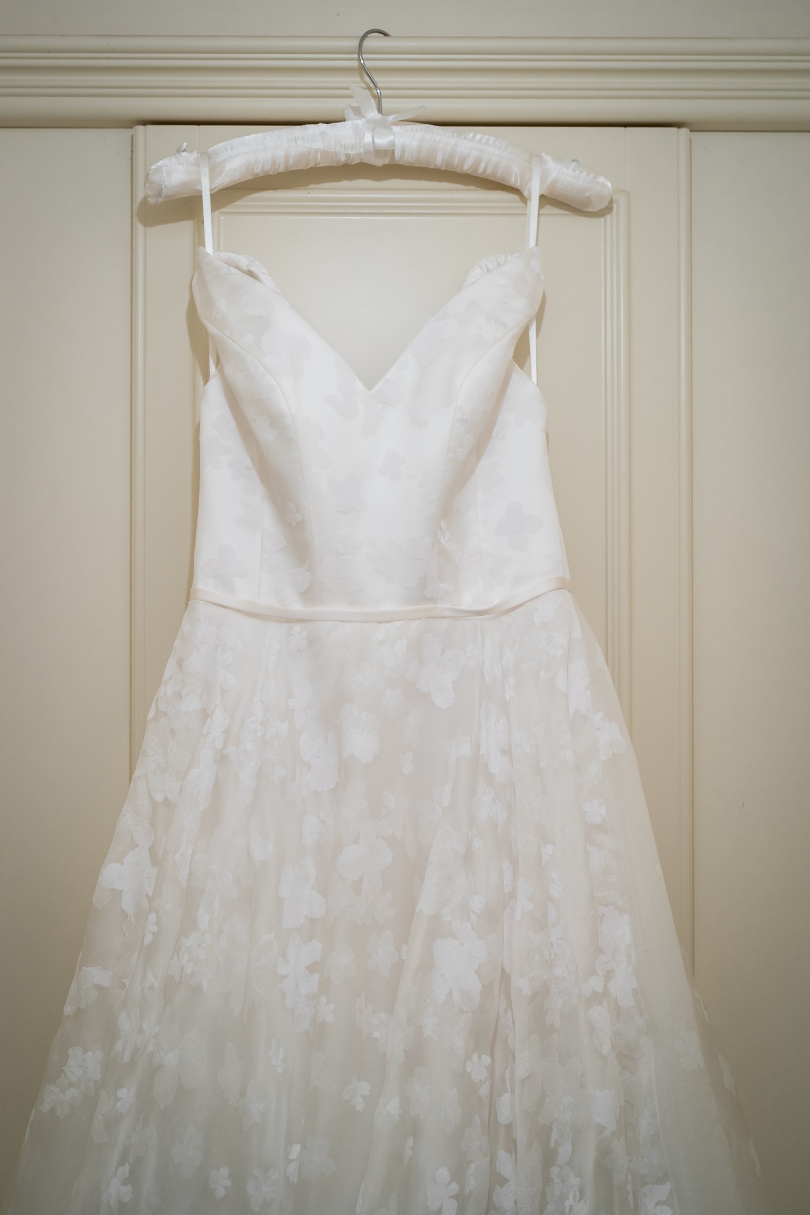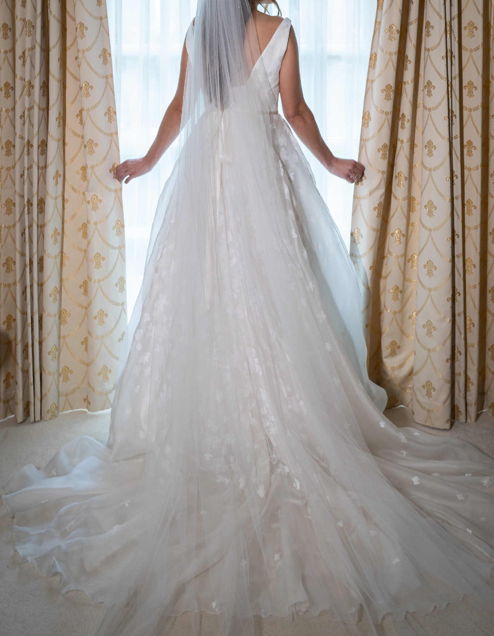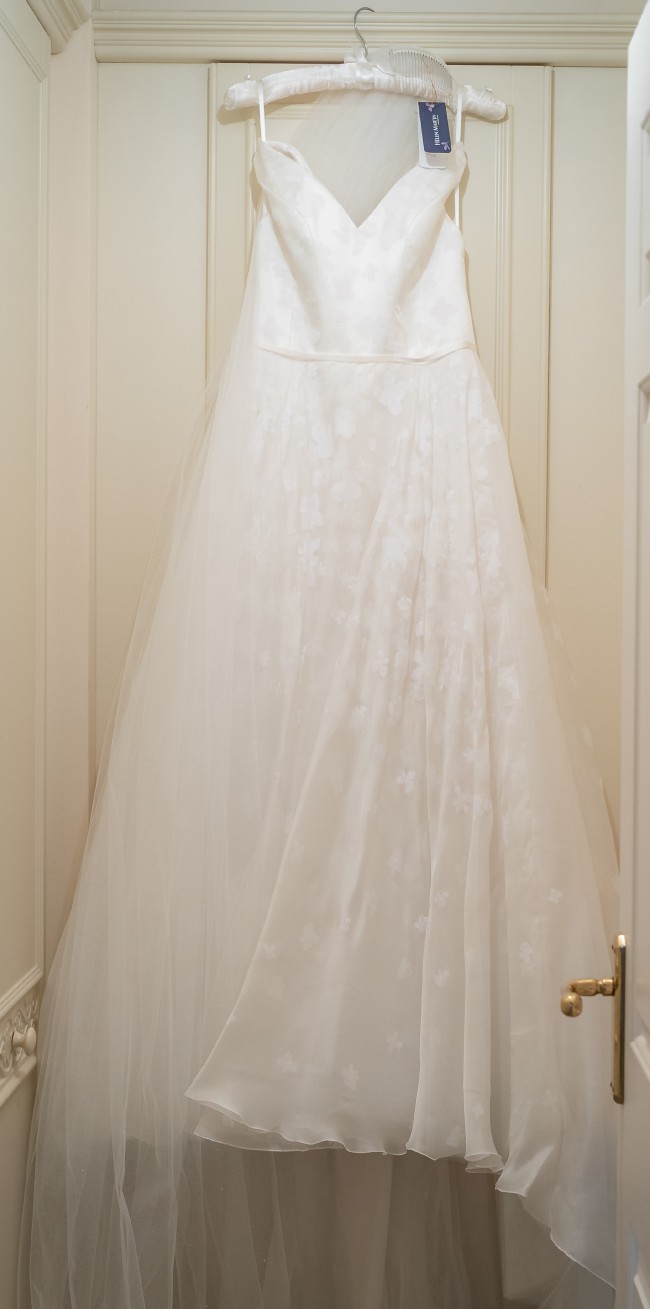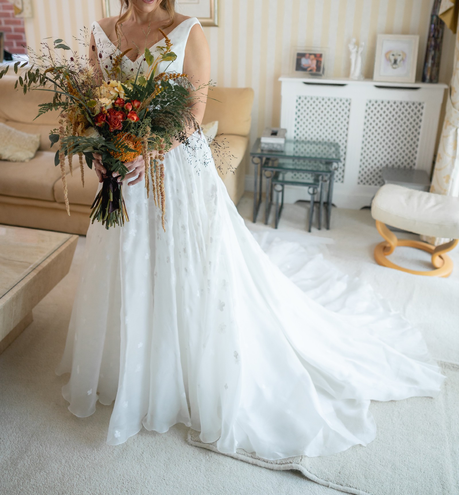This stunning designer 'Summer' wedding dress is a true statement piece. Crafted from luxurious fabrics with exquisite attention to detail, it offers an effortlessly elegant. Organza silk and hand painted flowers.