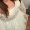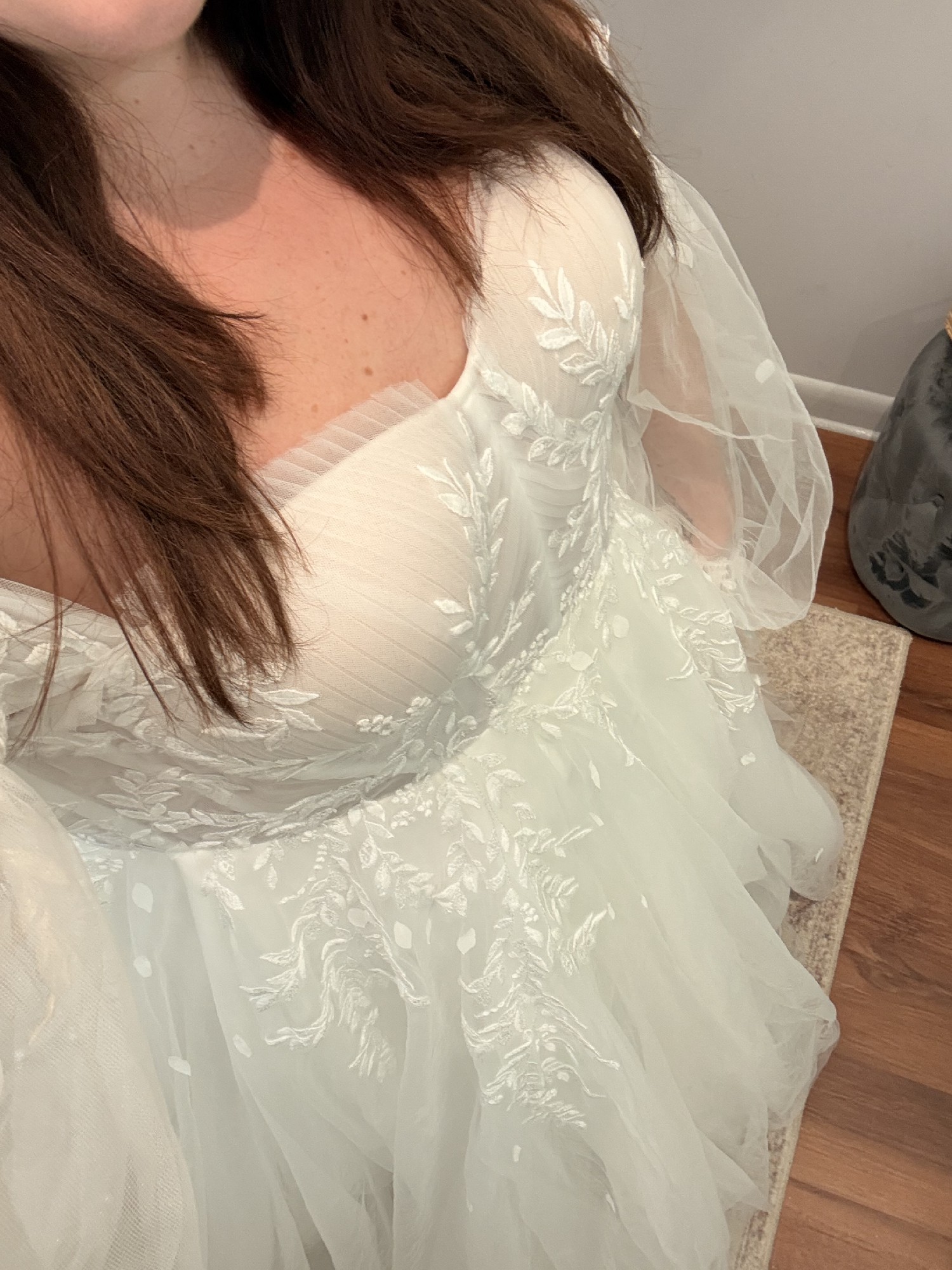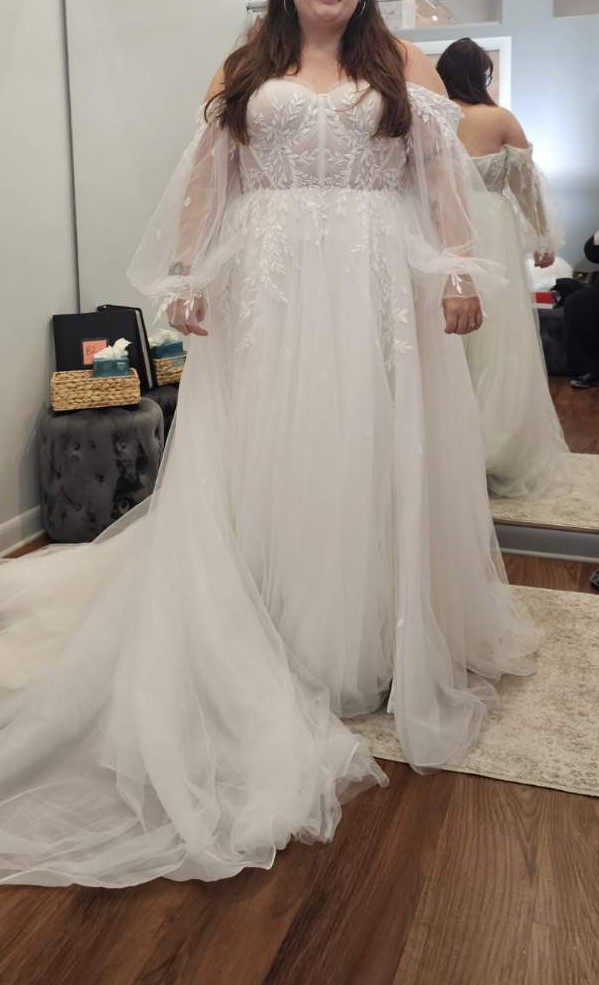 Step into a fairytale romance with Style D3787ís elevated designer boho style. Detachable, sheer off-the-shoulder blouson sleeves add volume and movement, gathering at the wrist to highlight the high-fashion raw tulle edge. The translucent strapless sweetheart bodice reveals the intricate corset construction underneath with a small row of fabric-covered buttons in the back. From the waist, a gauzy sea of layered tulle accented by leafy lace billows into a romantic soft A-line skirt, opening in the front for a high side-slit that adds movement and allure to this modern boho wedding gown. This beautiful gown was bought from Vows in Boston, MA and a receipt of purchase price and Vows bag comes with the dress. It has never been worn or altered. The dress is a size 20 and can be altered up or down.