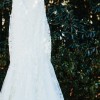 This was worn for a few hours on my wedding day and never had any stains get on it and it has been dry cleaned. It’s a US size 4 altered in the bust/waist to a size 2 (measures at 24.5” in the waist). In the photos I was a size 2 in dresses, 32B, size 4 in pants, around 120 lbs, and 5’5” with 2 inch heels for size reference. The dress has a nice sweetheart neckline with a low rise v-cut back with buttons down the back. The dress is strapless in a mermaid/fit & flare style with lace all over and a beautiful train that can be bustled in the back for dancing and moving around.