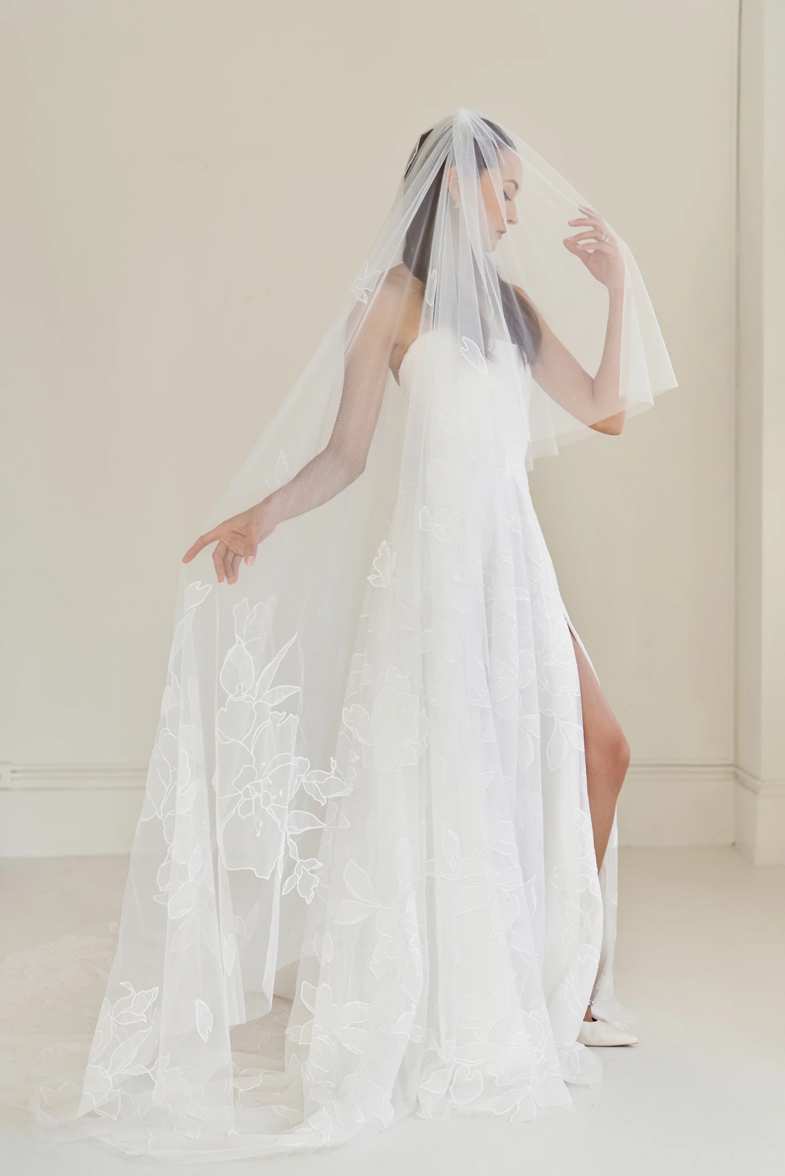Included is the Simone Veil (90" with 28" blusher) to complete the look.