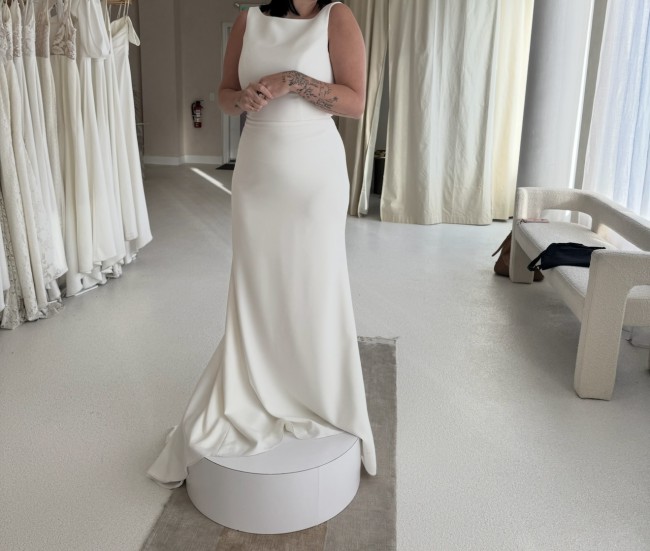 A beautiful Aesling Adele dress in soft crepe, brand new and never worn—only tried on at pickup. It features a detachable cowl and delicate buttons along the zipper, adding a subtle, elegant detail.