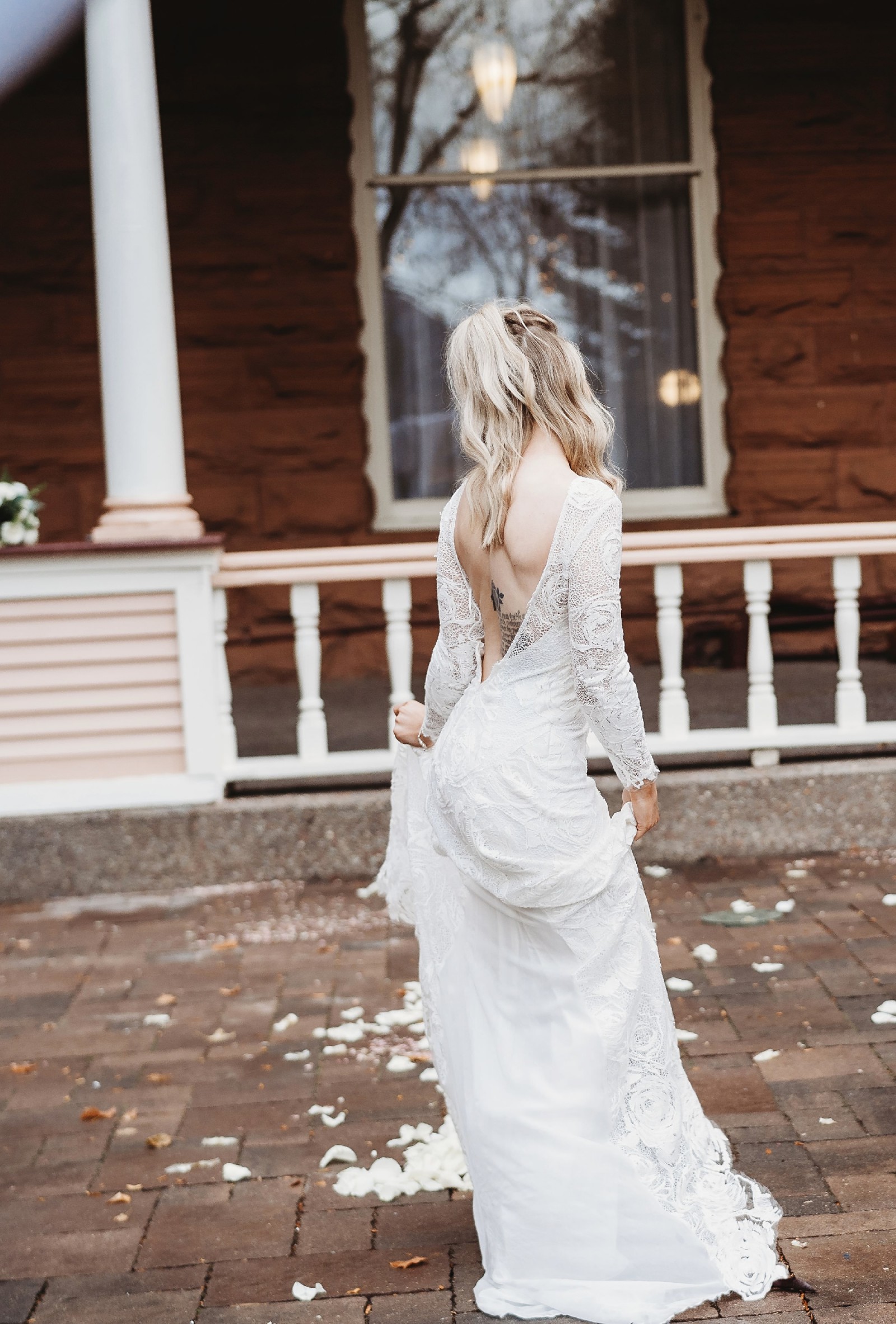 The entire gown from top to bottom is lace. Hand sown lacey roses.
