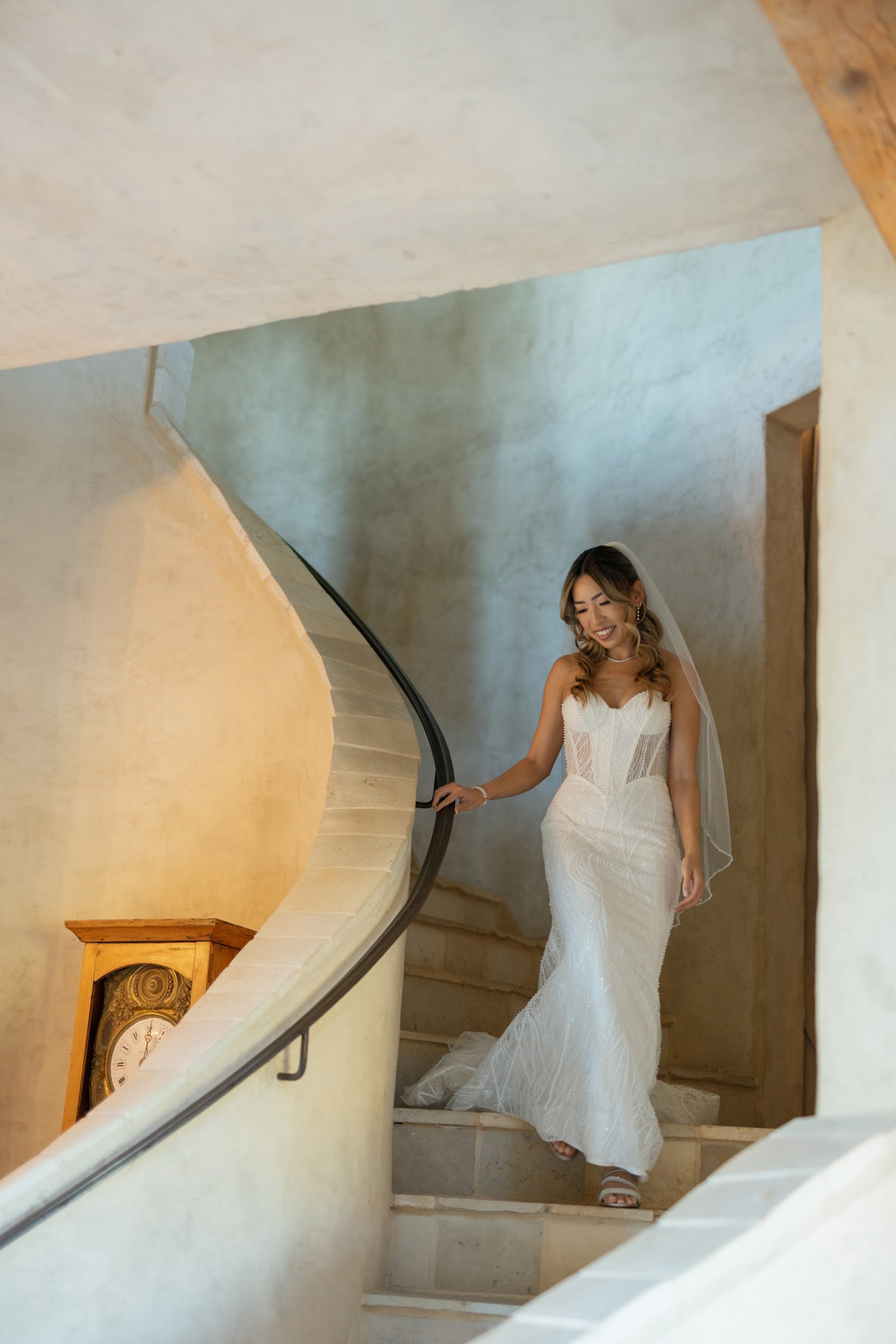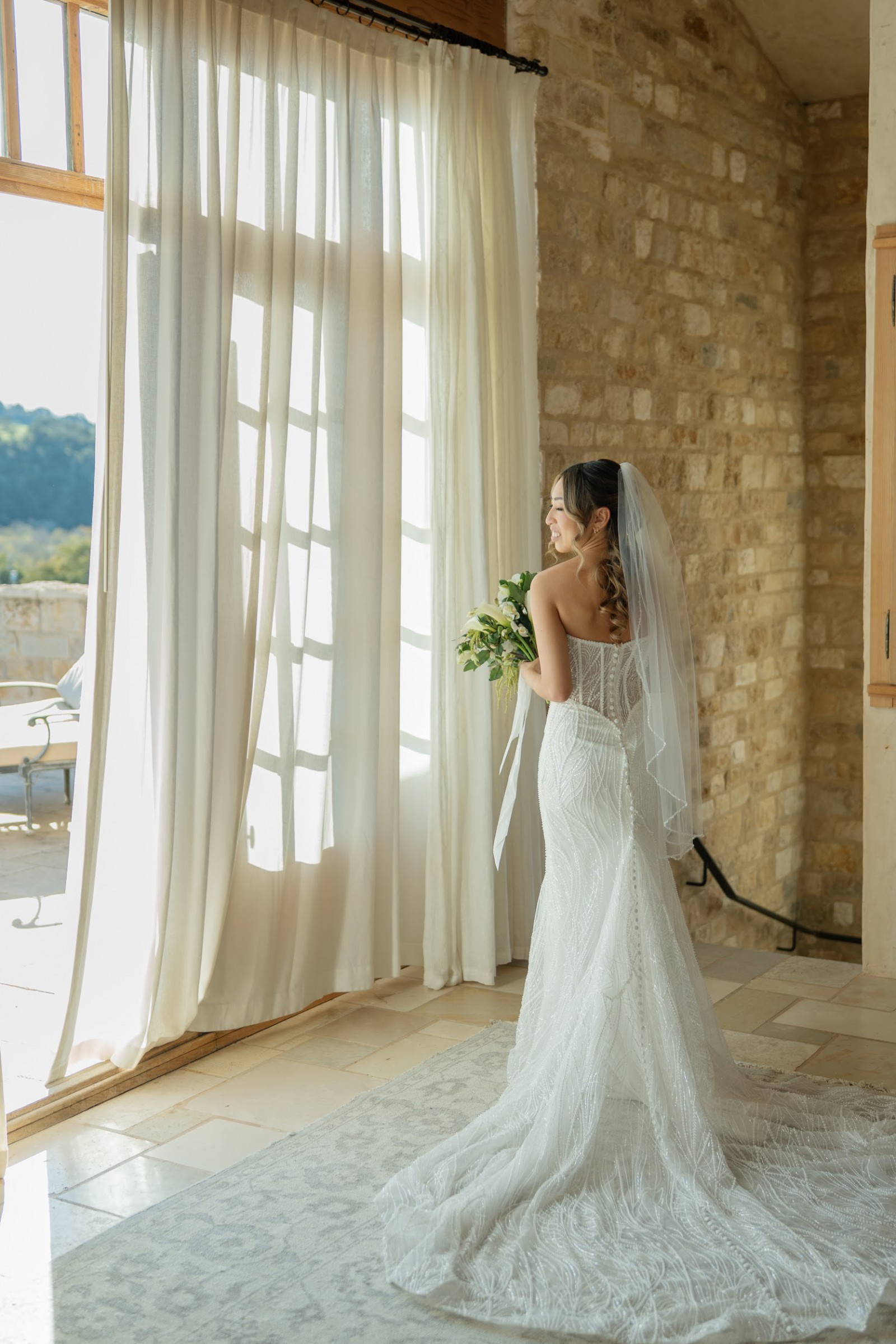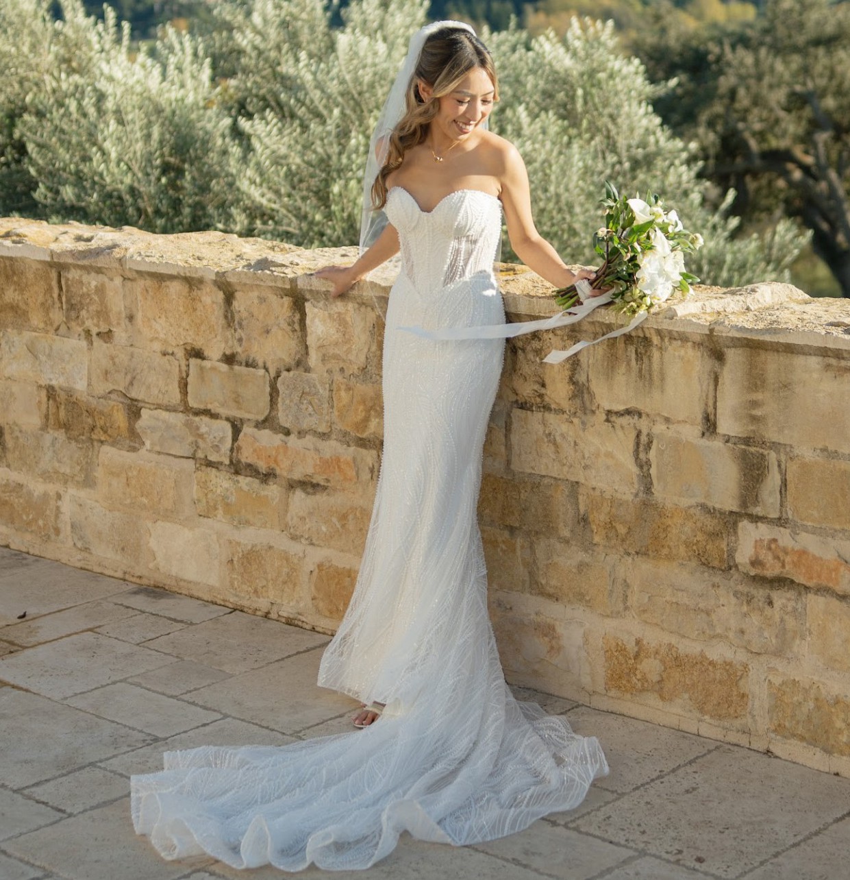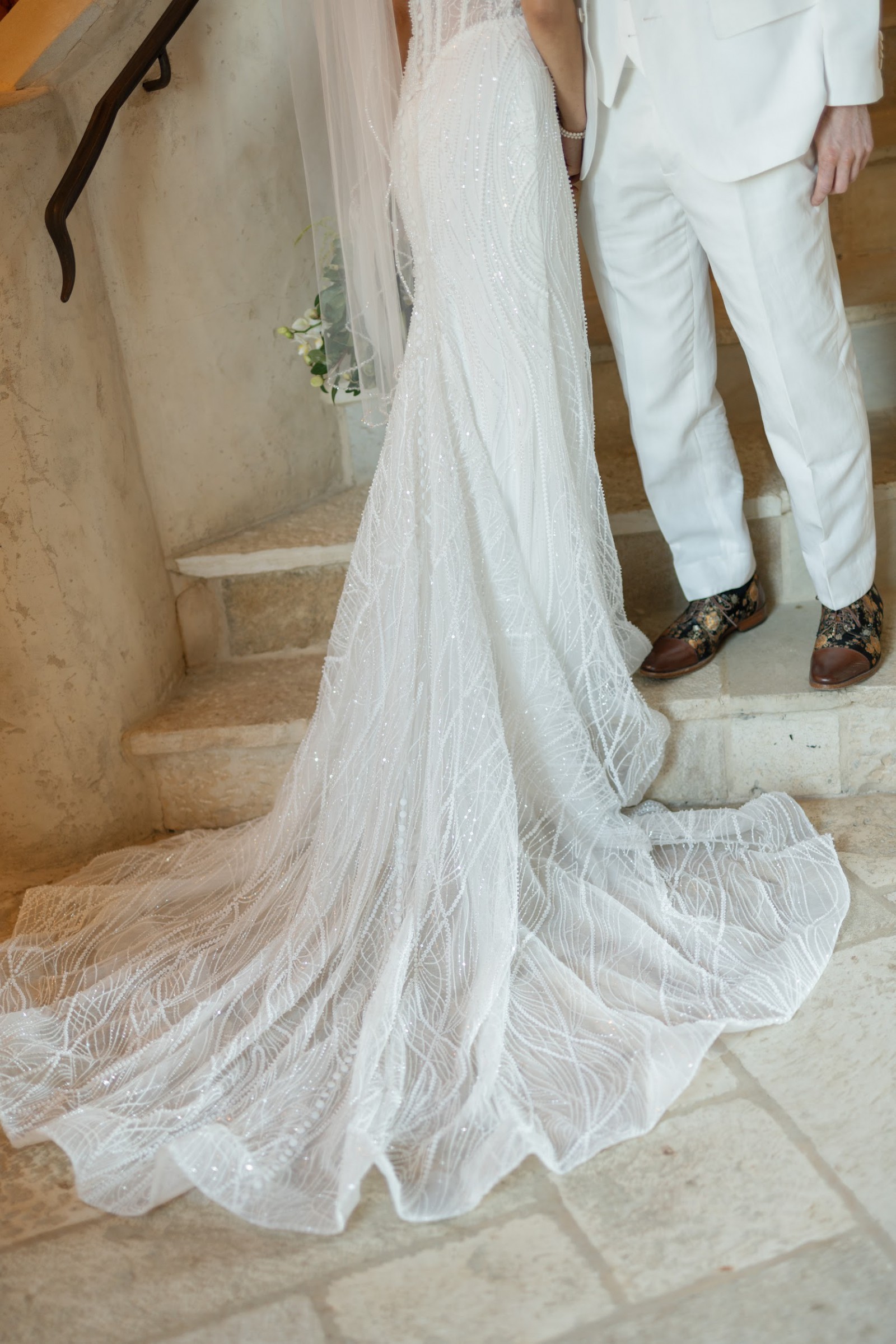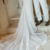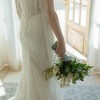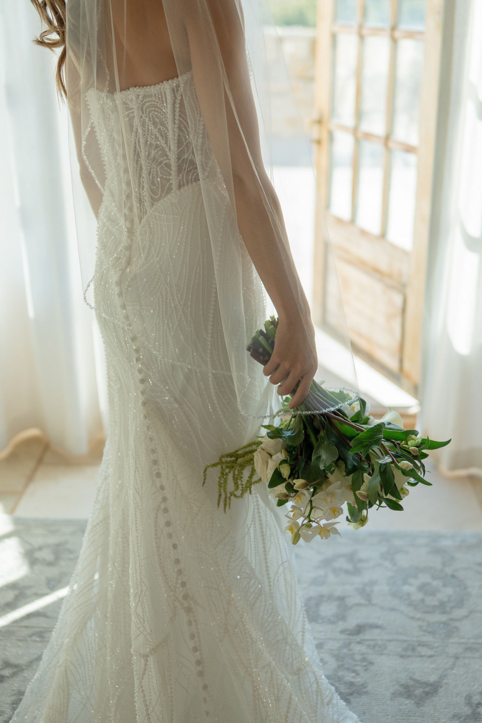 Adorned with exquisite beading, sparkling crystals, and delicate pearls, this dress captures the light beautifully, creating a magical twinkle as you walk down the aisle. Its mid-back design adds a touch of sophistication, ensuring you’ll feel as gorgeous from behind as you do from the front.