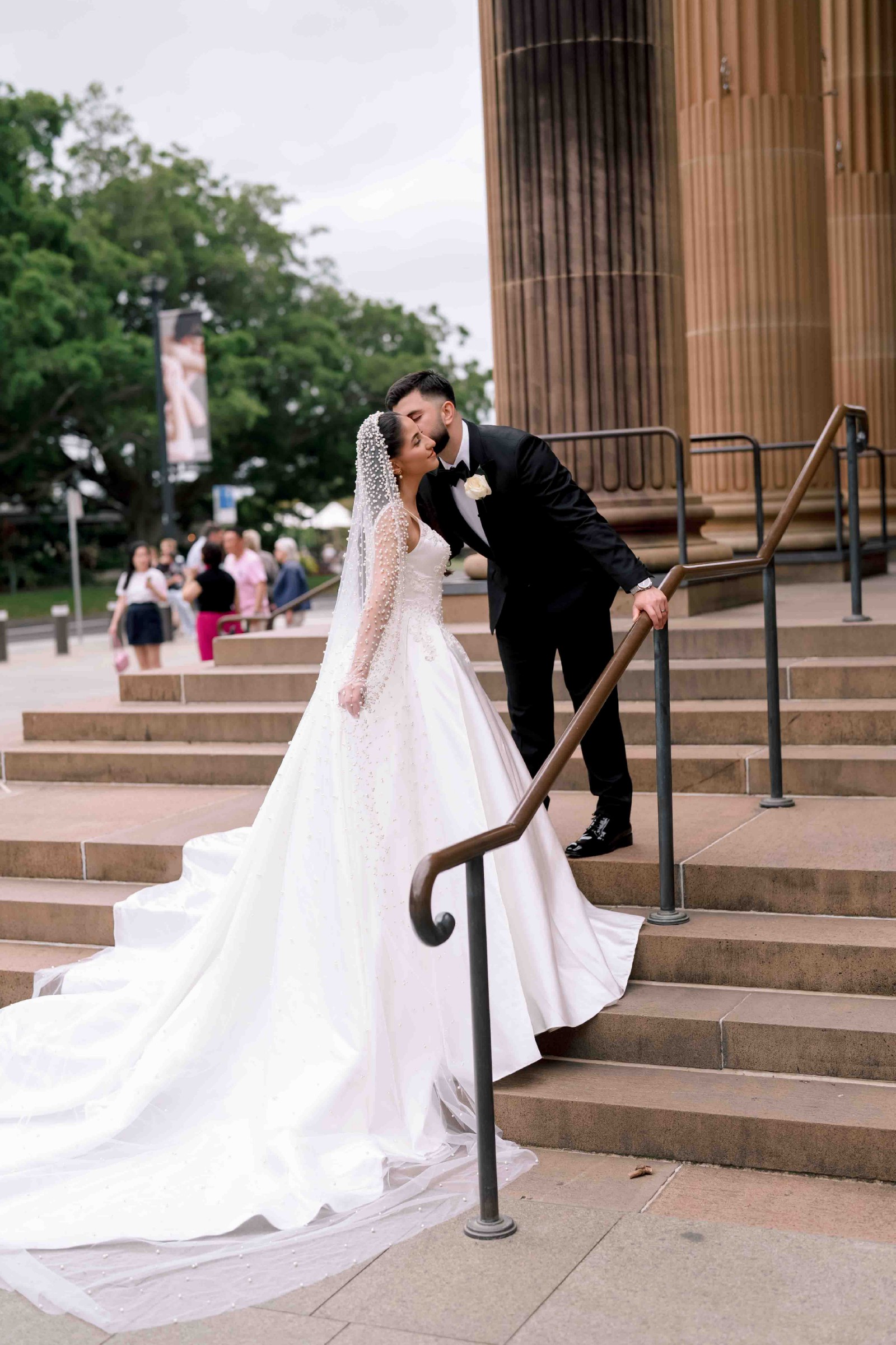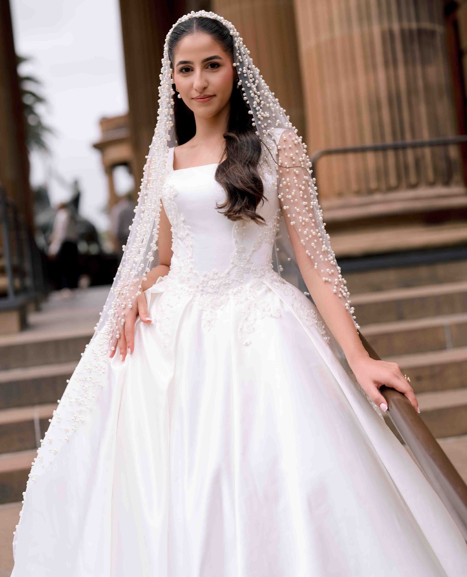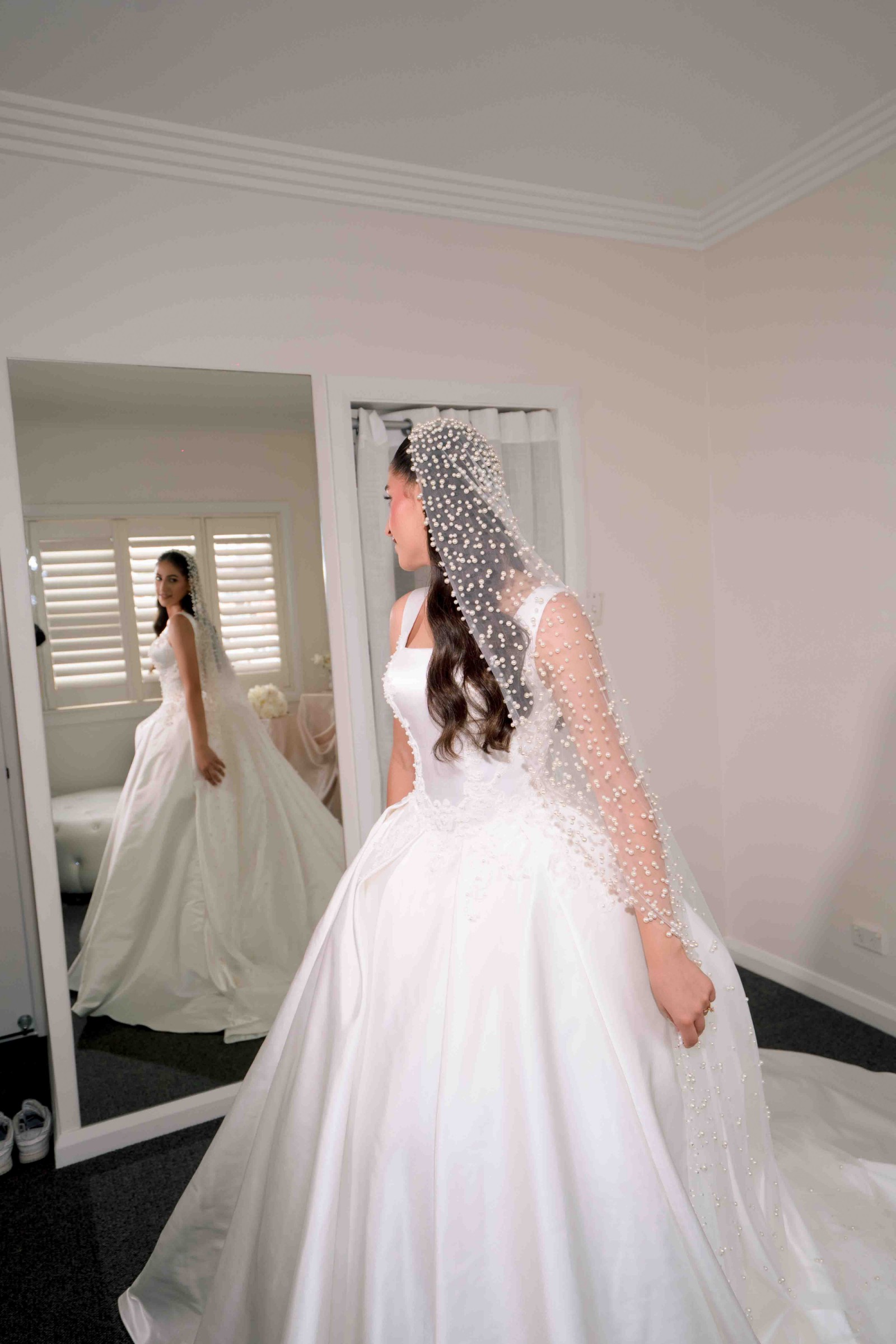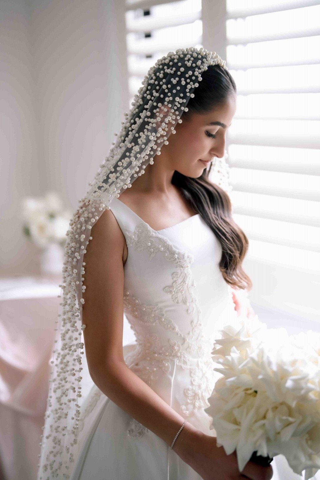 Heavily pearl beaded veil included.