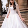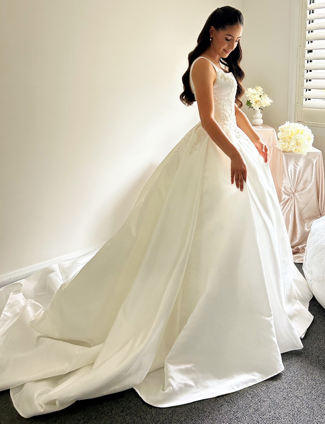 Custom made satin wedding dress with lace and pearl embroidery.