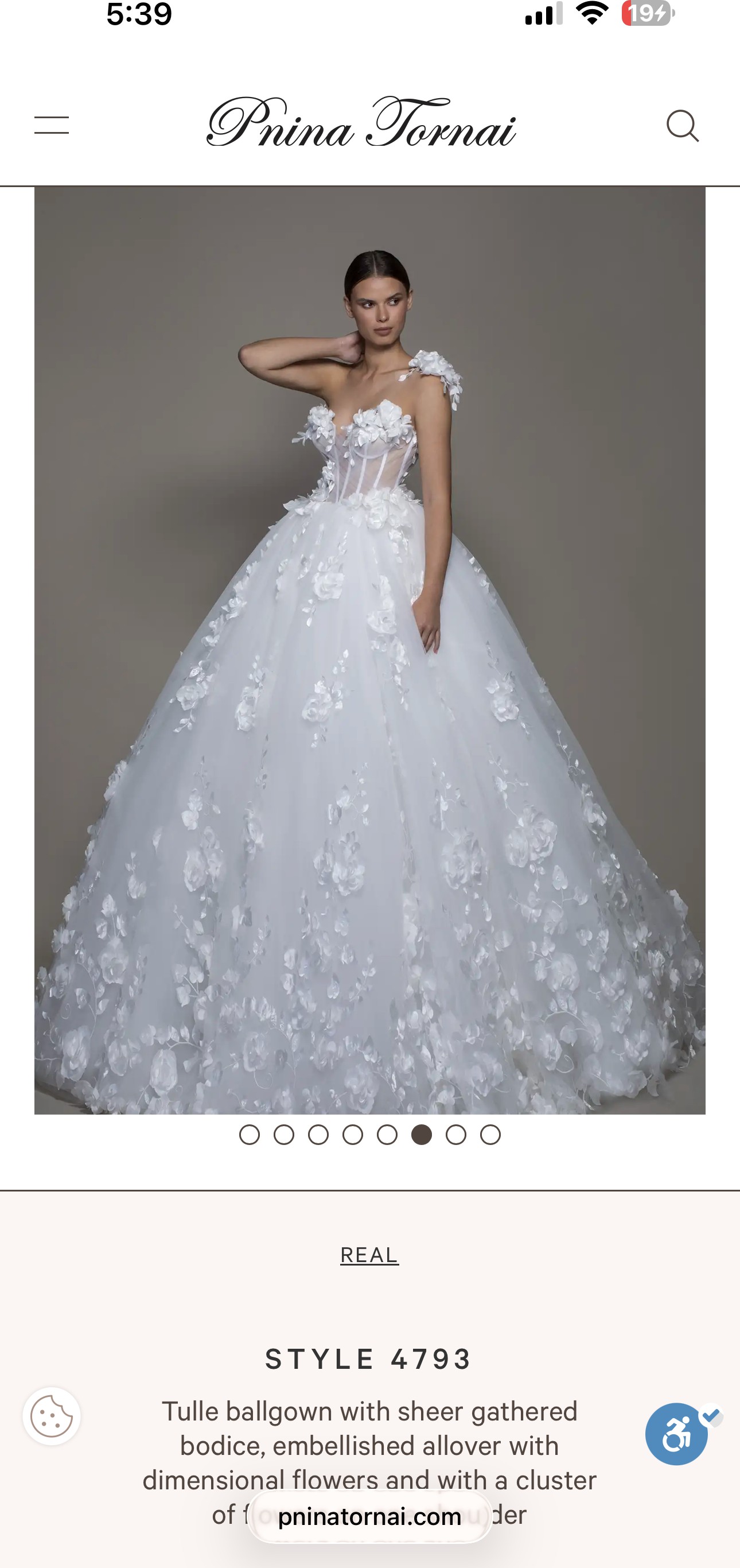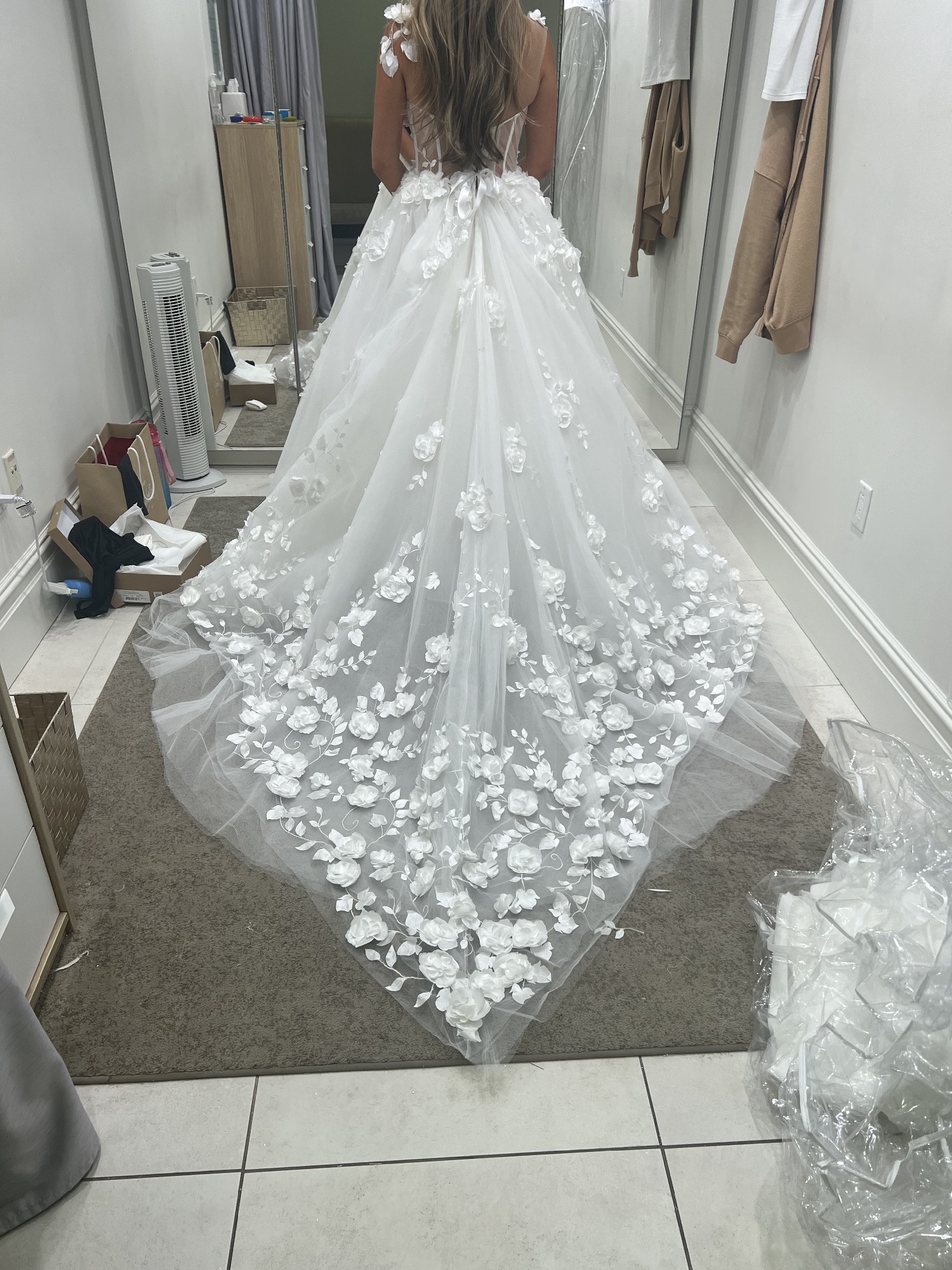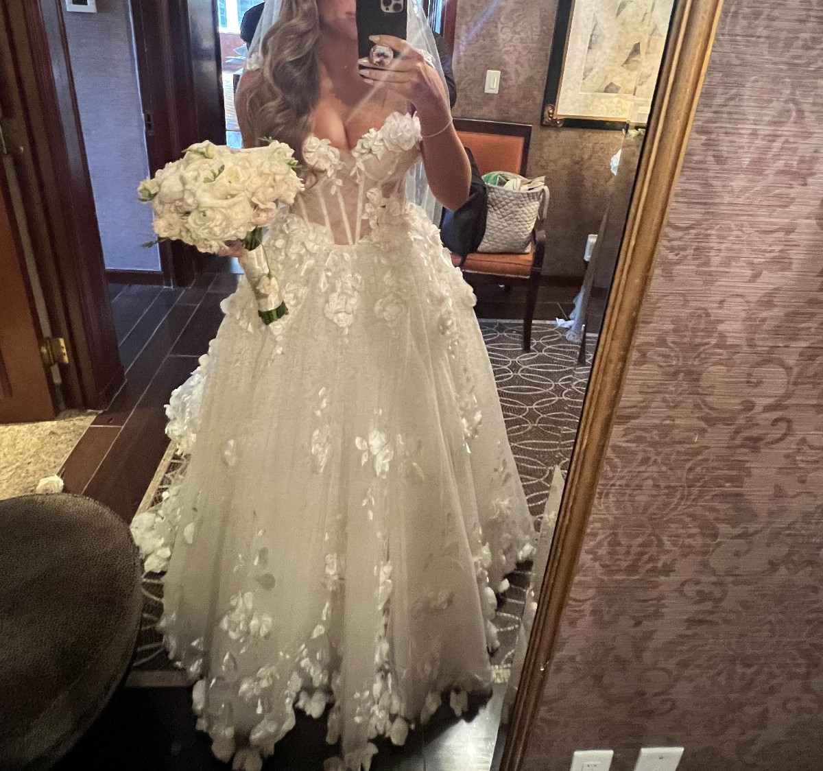 Pnina tornia ball gown with corset top. 3D flowers all about the tulle skirt and corset as well as sheer straps. has a very sexy but appropriate sheerness to it. I am 5’6 with a 34 D cup around 140 lbs. it is a corset top so can truly fit any chest and size girl beautifully. Extra 3D flowers added for additional coverage. Pnina Tornai was there in person assisting and custom designing any changes made at Kleinfeld. Please message me with any questions. Dress was worn for church ceremony only and immediately cleaned/ perserved. Have store receipt reflecting price and proof of purchase.