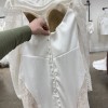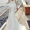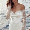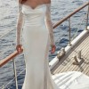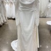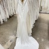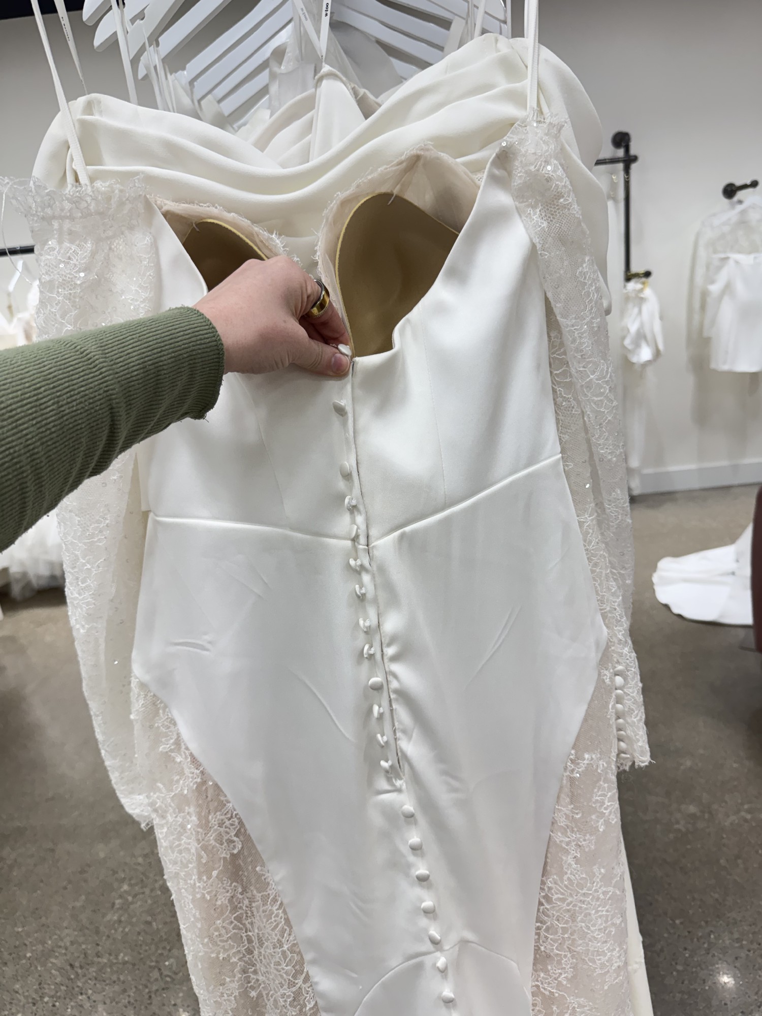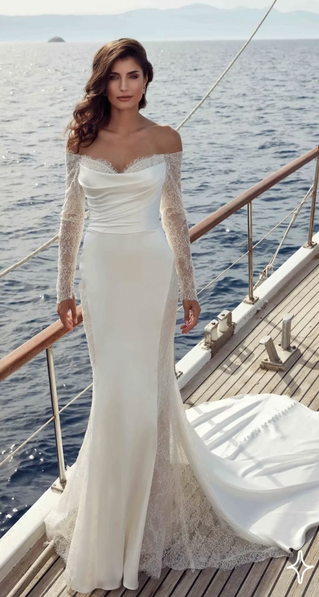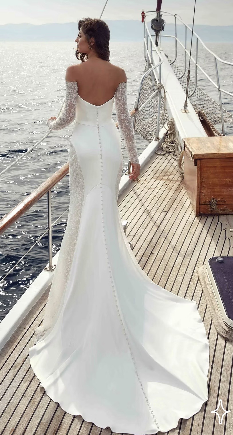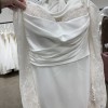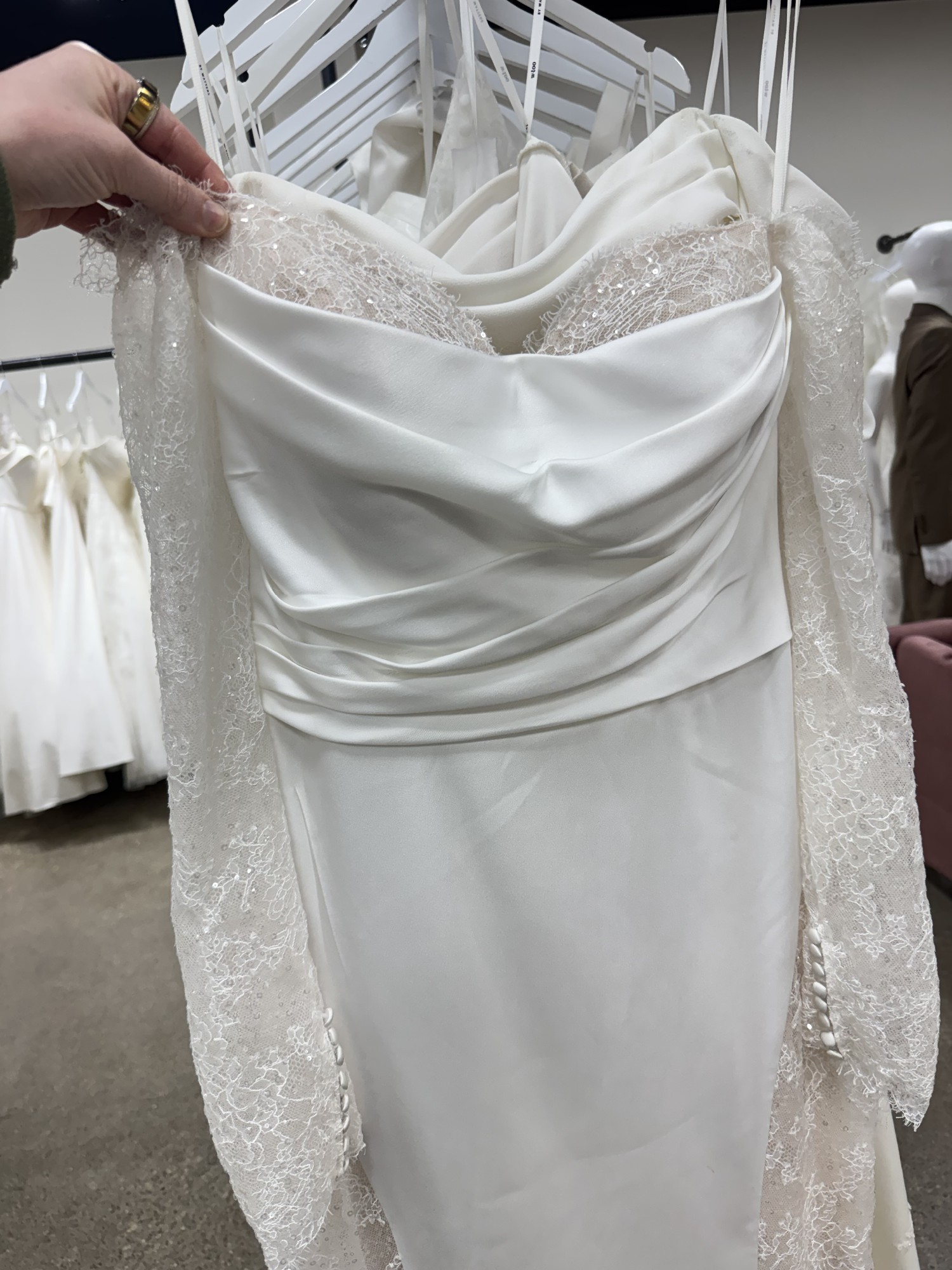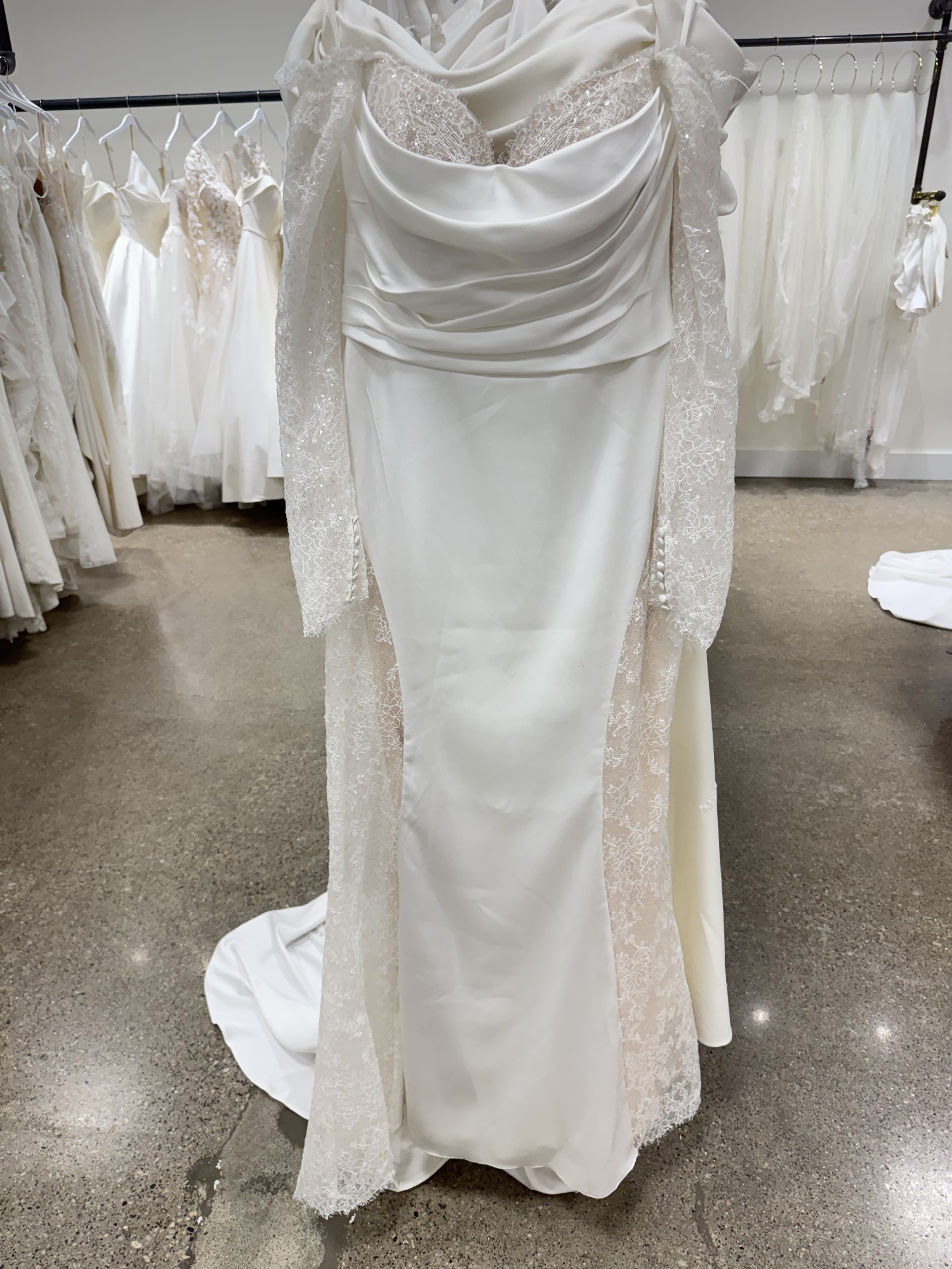 Fit-n-Flare satin charmeuse gown with side train cut-outs with heavily sequin embroidered Chantilly lace over champagne tulle, ivory and almond stretchy lining, long sleeves, Chantilly lace bust detail, buttons to end of train.