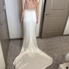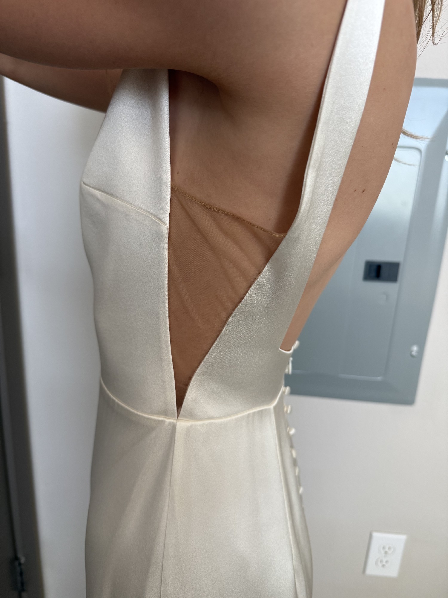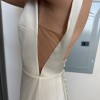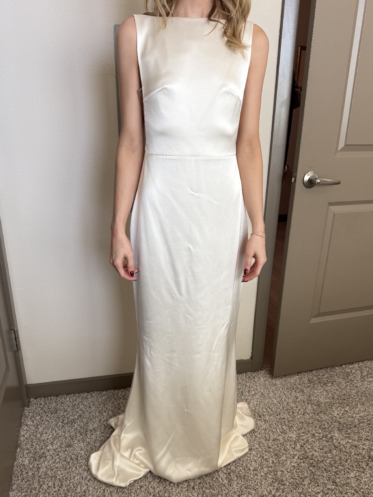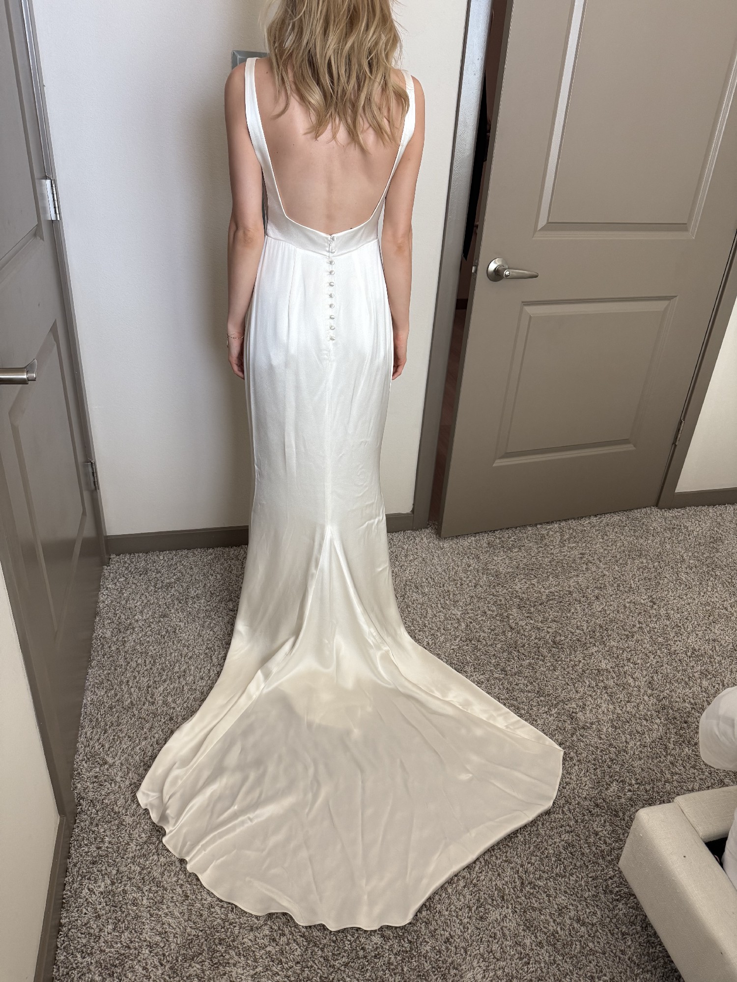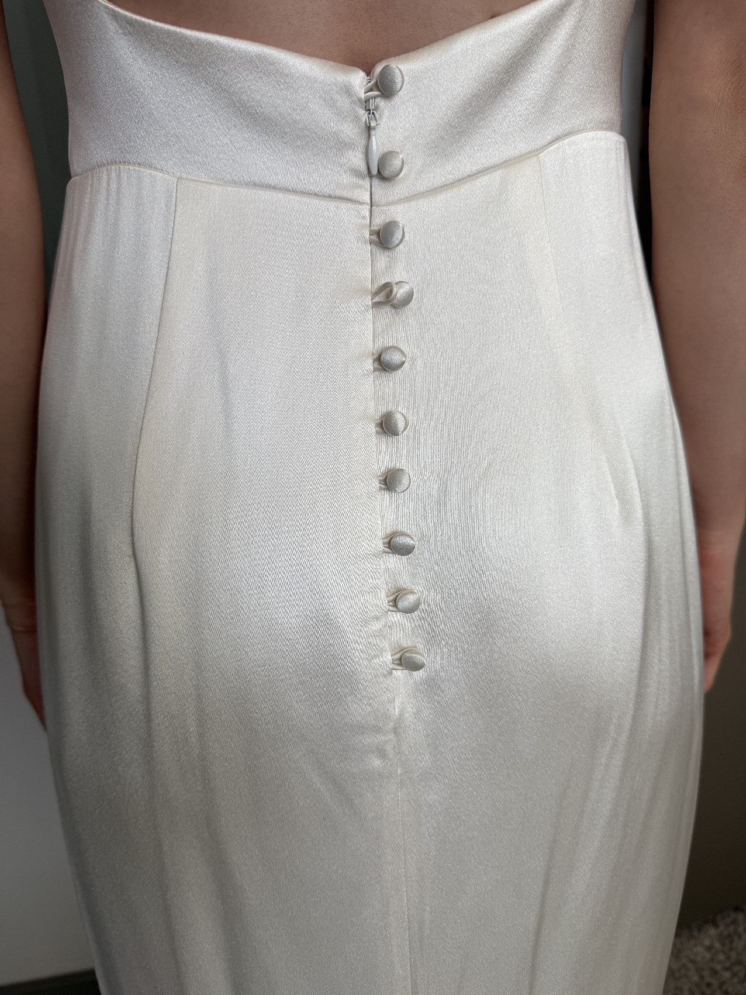 Sleek, minimalist satin bridal gown in white designed by Alexandra Greco. Features a clean bateau neckline, dramatic open back with delicate covered buttons, structured fitted bodice, and a cathedral train.