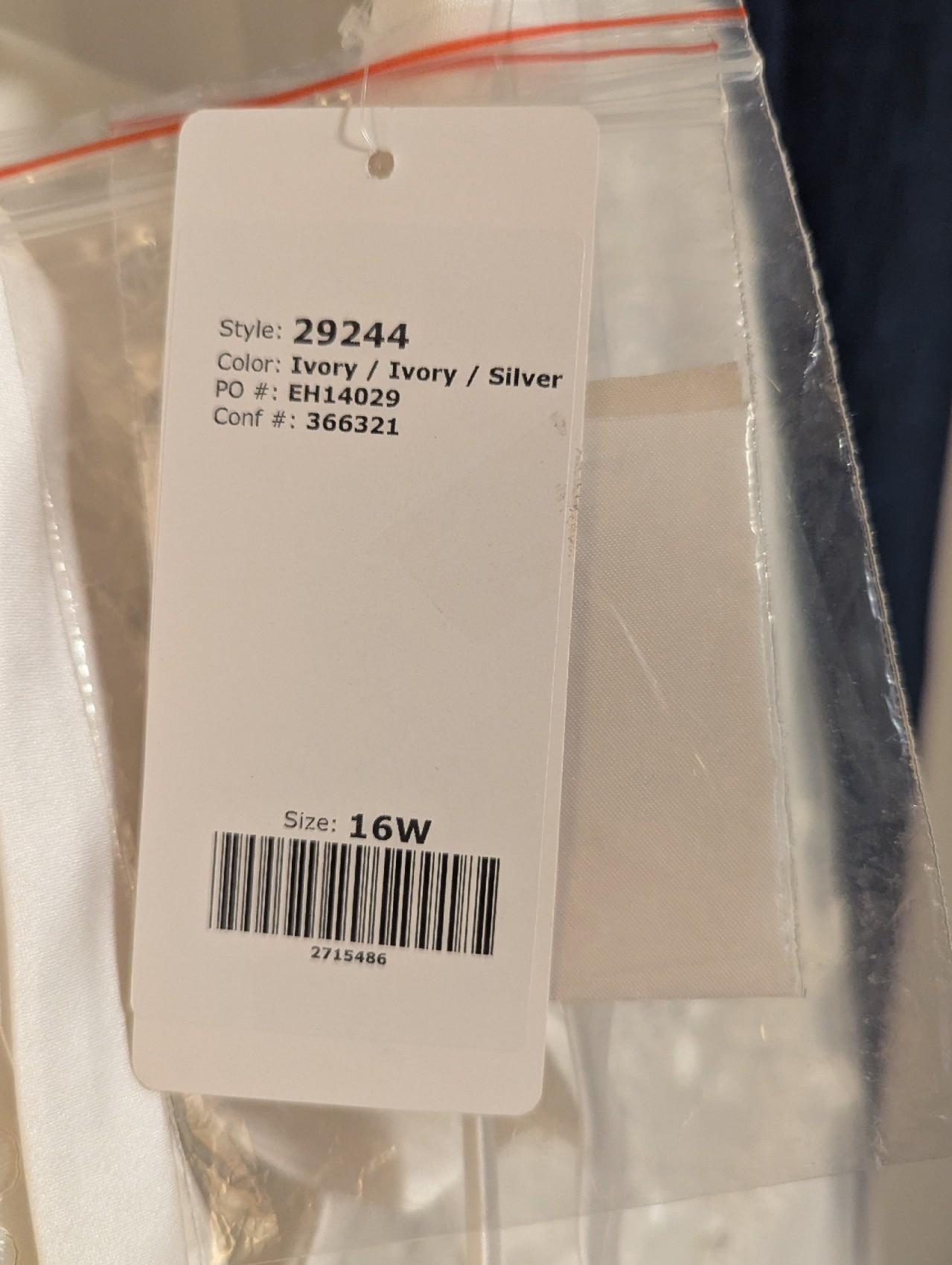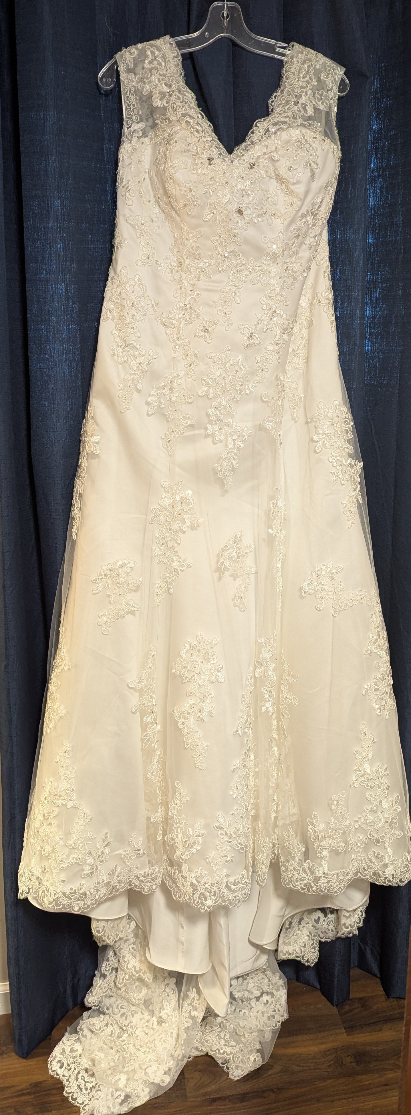 Cara Mia dress (style 29244) in ivory colour, size 16W. This dress has not been used or altered. Still has the tags on and has been stored in the garment bag since purchase. Comes with a matching veil on a hair comb.