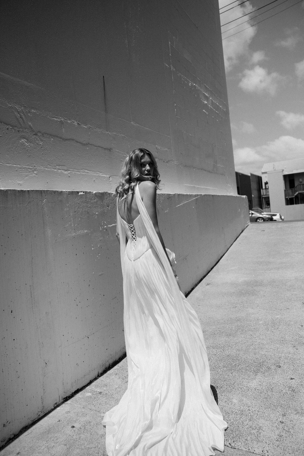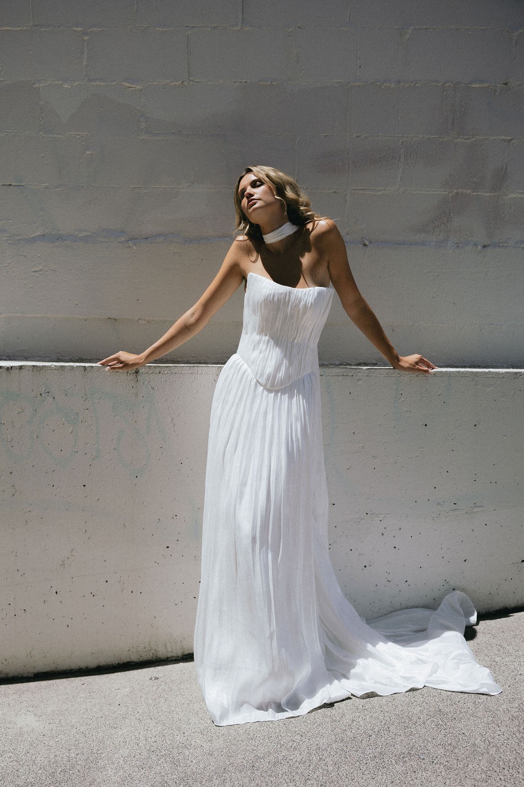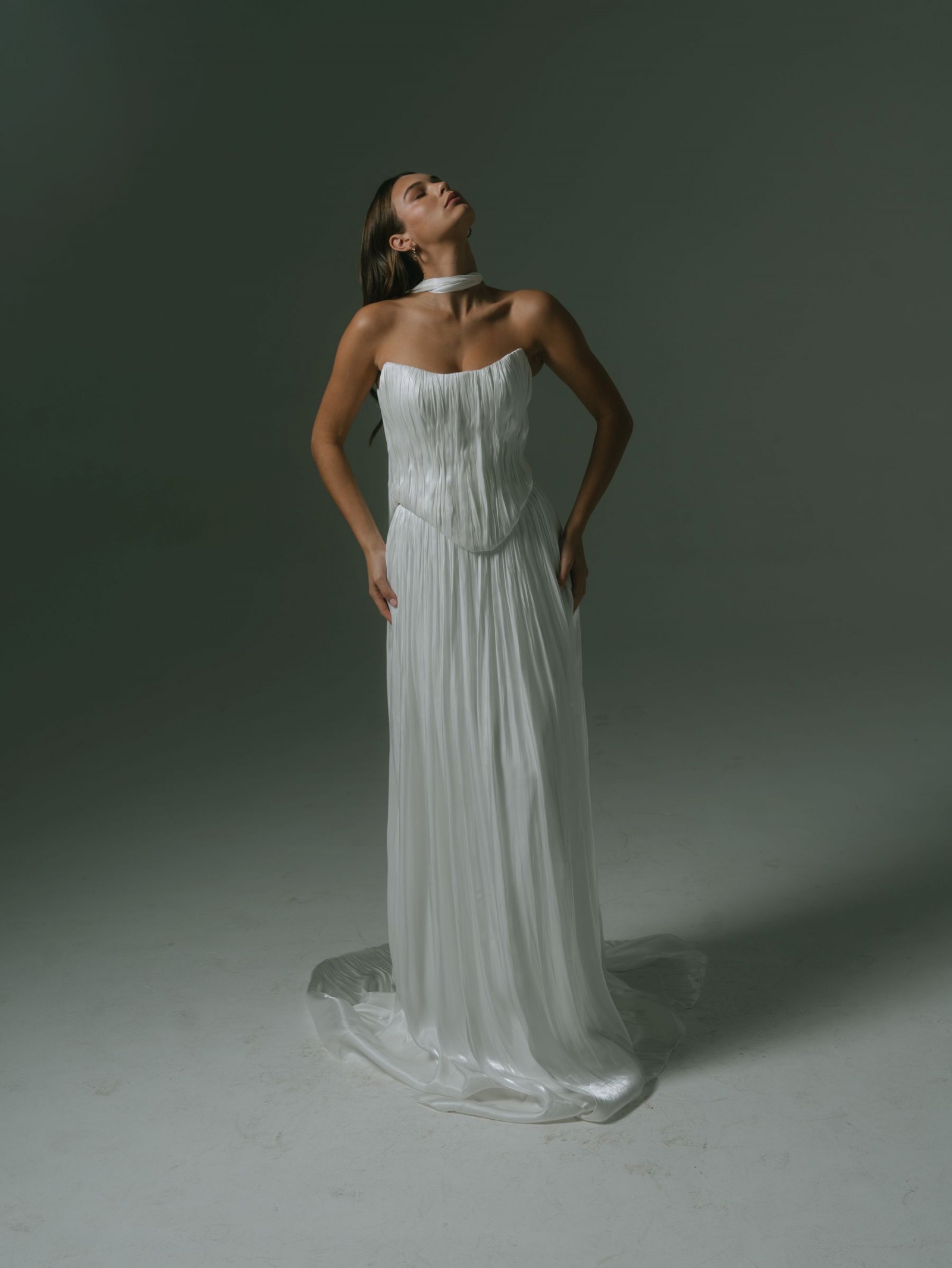 Simple and oh-so pretty, Rouge is our take on Parisian chic. Constructed in micro-tucked pleated satin, this gown feels relaxed and confident, effortlessly falling in lustrous ripples. The strapless neckline showcases the décolletage, while the corseted bodice nips in at the waist and is finished with a basque waist. The back laces up with a satin tie while the skirt falls like liquid for ease of movement without the volume. Rouge is perfect for brides who love a contemporary vibe with a touch of French glamour.