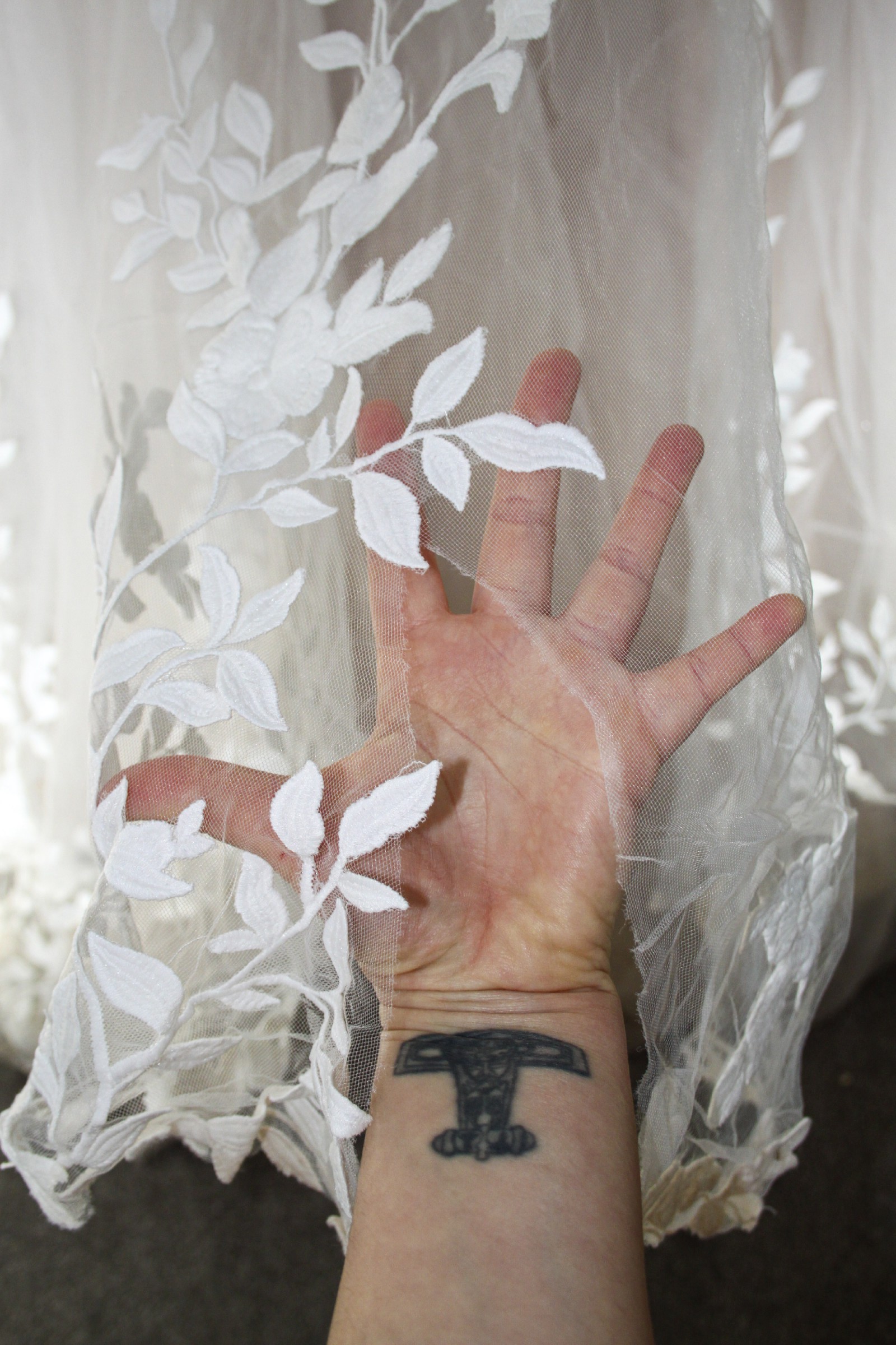 What truly sets this gown apart are the lovely vine-like 3D embroided motifs, the layer of glitters and the sweetheart corset slyle bodyce. The skirt is a mix of tulle and organza that make the dress lightweight Originally it had detachable off-the-shoulder tulle straps, however these have been altered and attached to the dress.