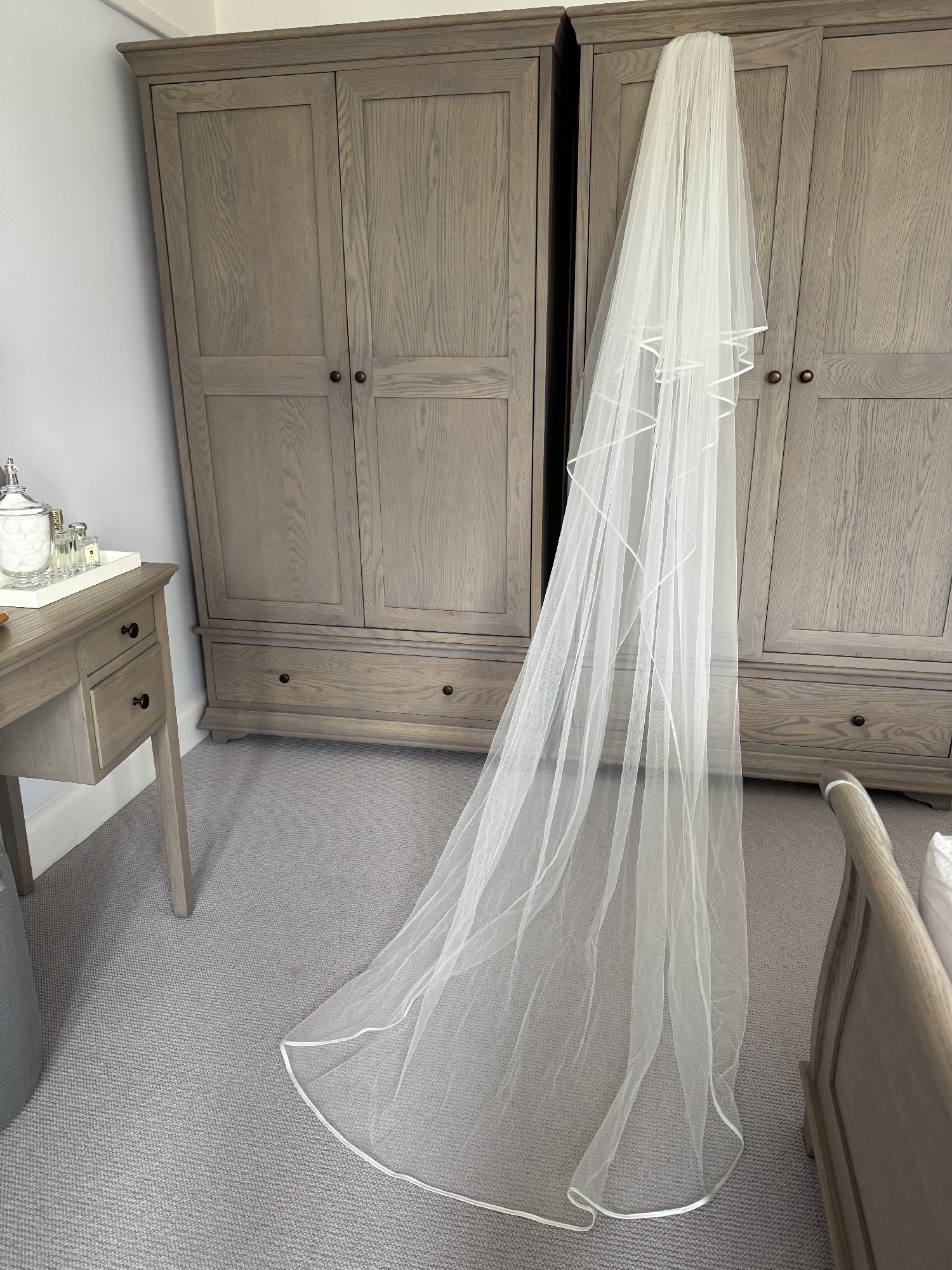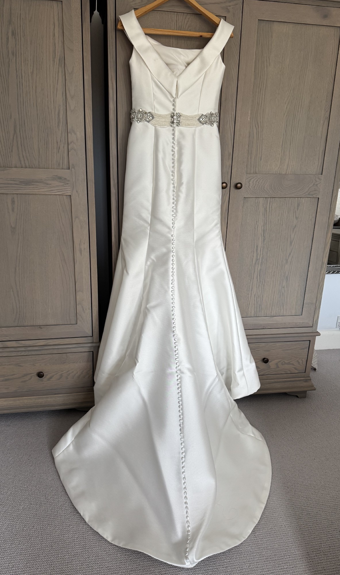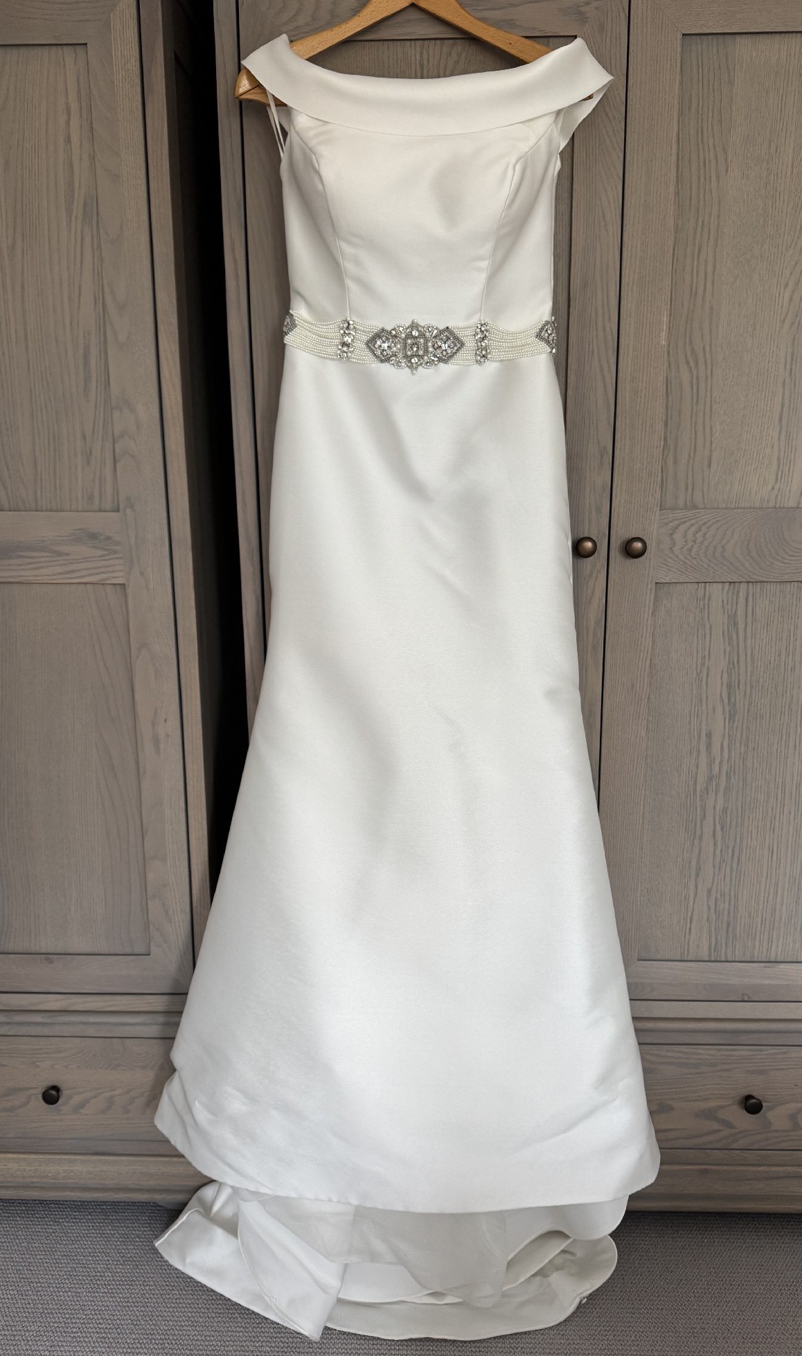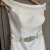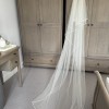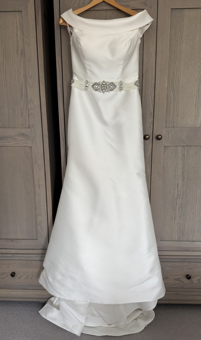 A beautiful ivory wedding dress and 8ft wedding veil. It was very comfortable to wear. The train is able to be tucked up for dancing. The belt was not part of the original dress.