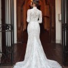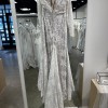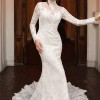 Style D4294 blends modern bridal design with vintage-inspired elegance. The sheer all-lace bodice begins with a high mock neckline, adorned with delicate eyelash lace trim, and wraps the torso and arms in intricate beaded Chantilly lace. Elegant fabric-covered buttons trace the spine, ending at the fitted hop of the column sheath silhouette. Set against a garden of lace, the form-fitting gown finishes with a sweeping, shimmering train for a stunning and sophisticated bridal look.