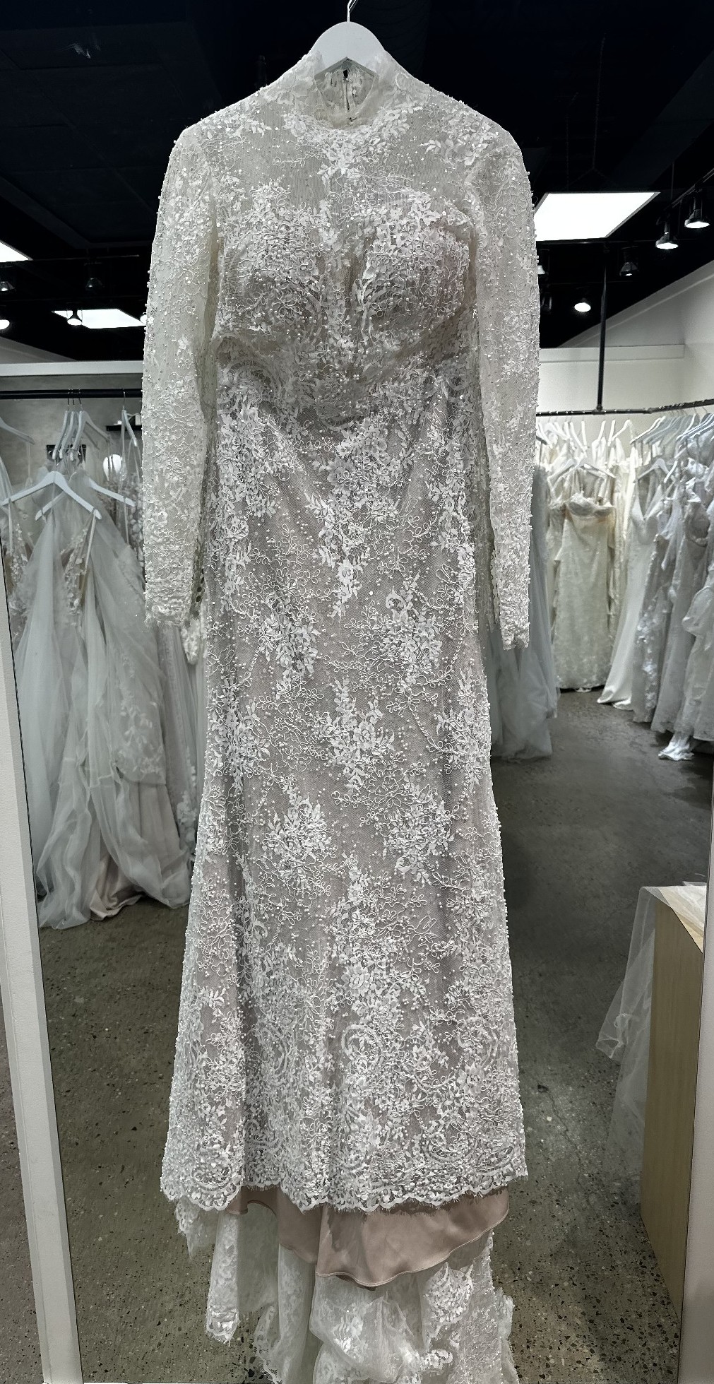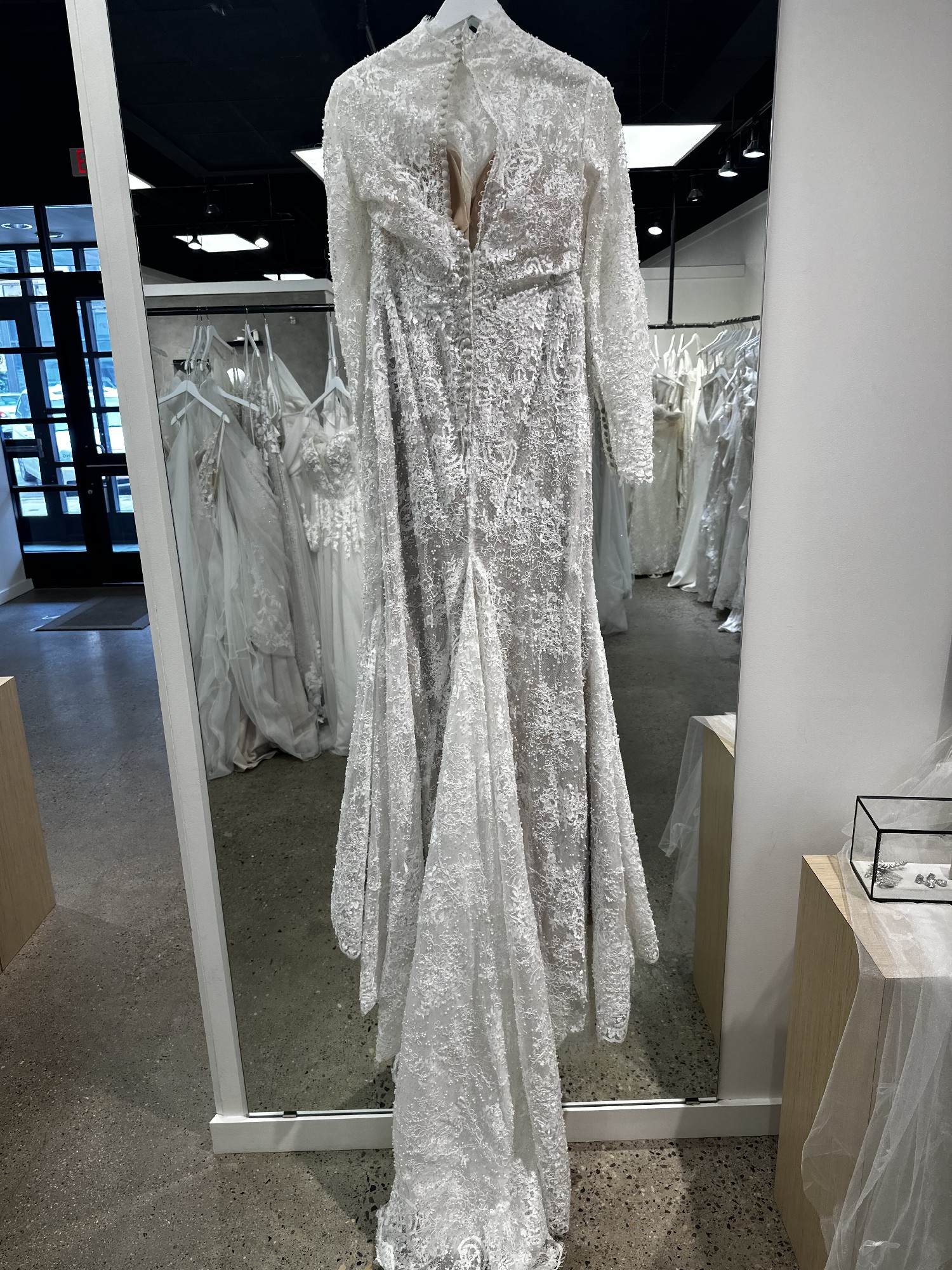 We’re a bridal store so this gown is our floor model/sample meaning we paid full price for this gown but it is our investment dress we bought for brides to try on and order off of in their desired size and color.