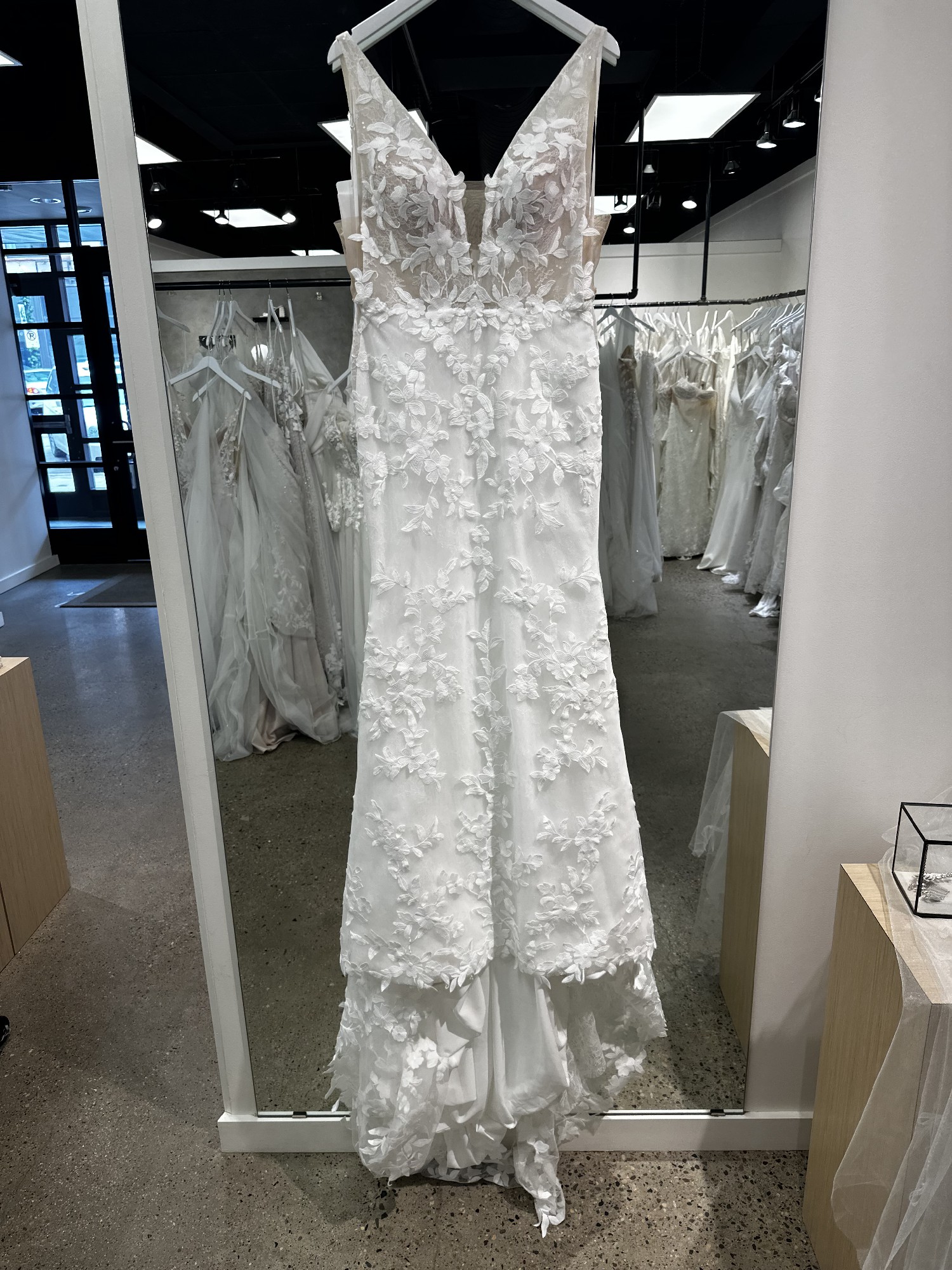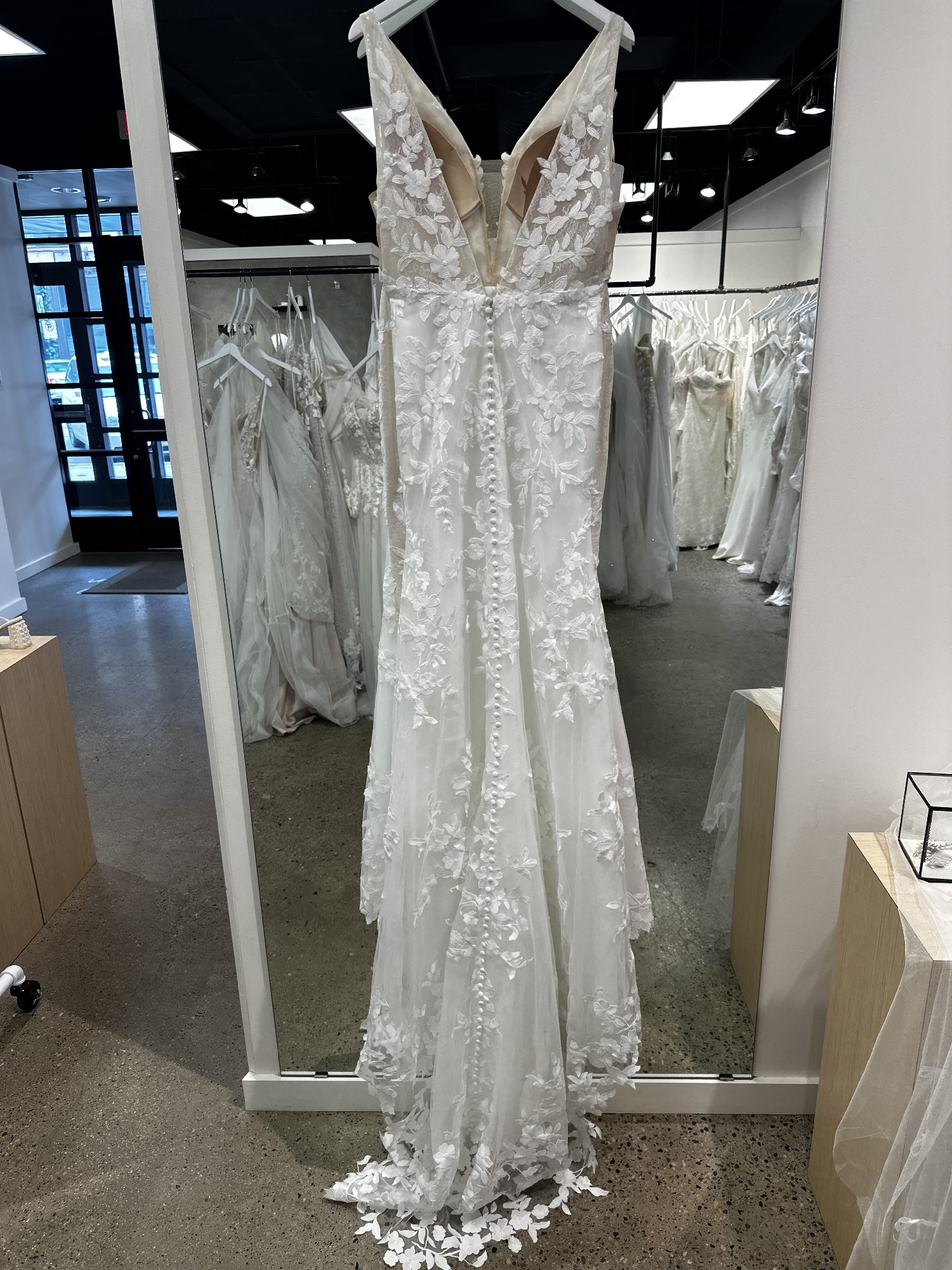 We’re a bridal store so this gown is our floor model/sample meaning we paid full price for this gown but it is our investment dress we bought for brides to try on and order off of in their desired size and color.