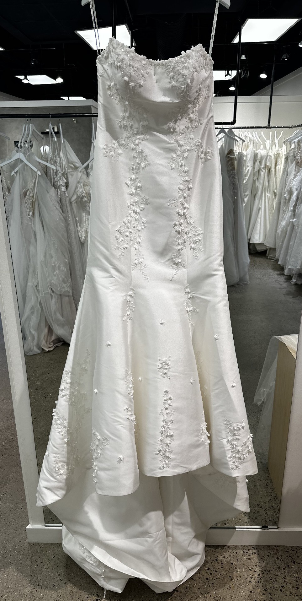 We’re a bridal store so this gown is our floor model/sample meaning we paid full price for this gown but it is our investment dress we bought for brides to try on and order off of in their desired size and color.