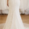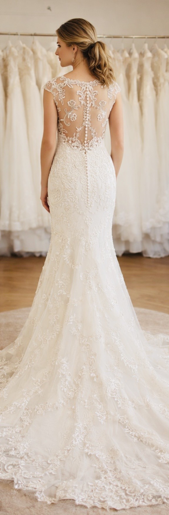 The back is fully illusion lace with button detailing down the spine, leading into a stunning lace-edged train that photographs beautifully.