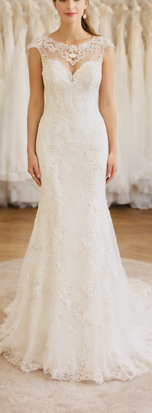 The dress features an elegant illusion lace neckline with delicate cap sleeves and a sweetheart lining beneath. Intricate lace appliqué flows throughout the entire gown, creating a flattering, sculpted silhouette.