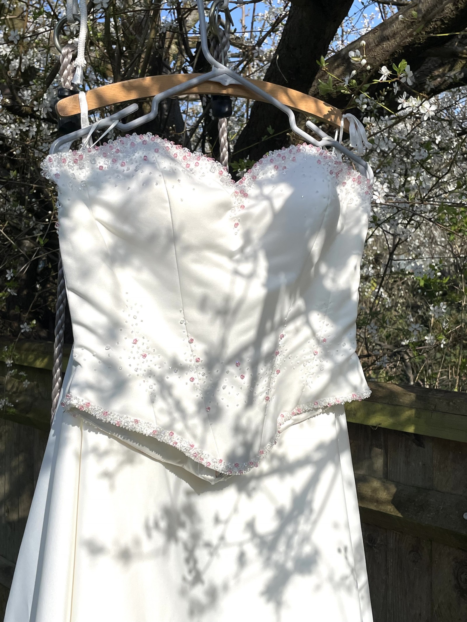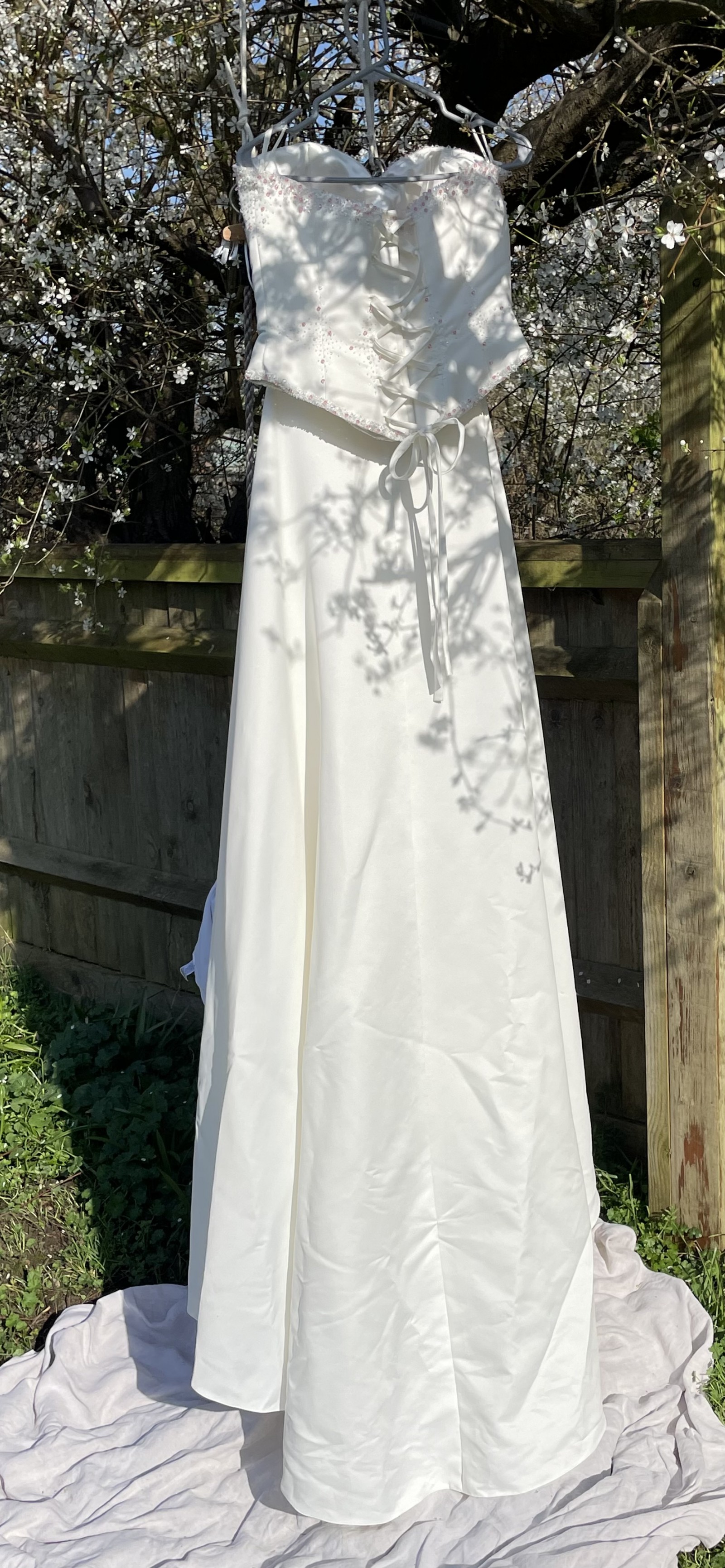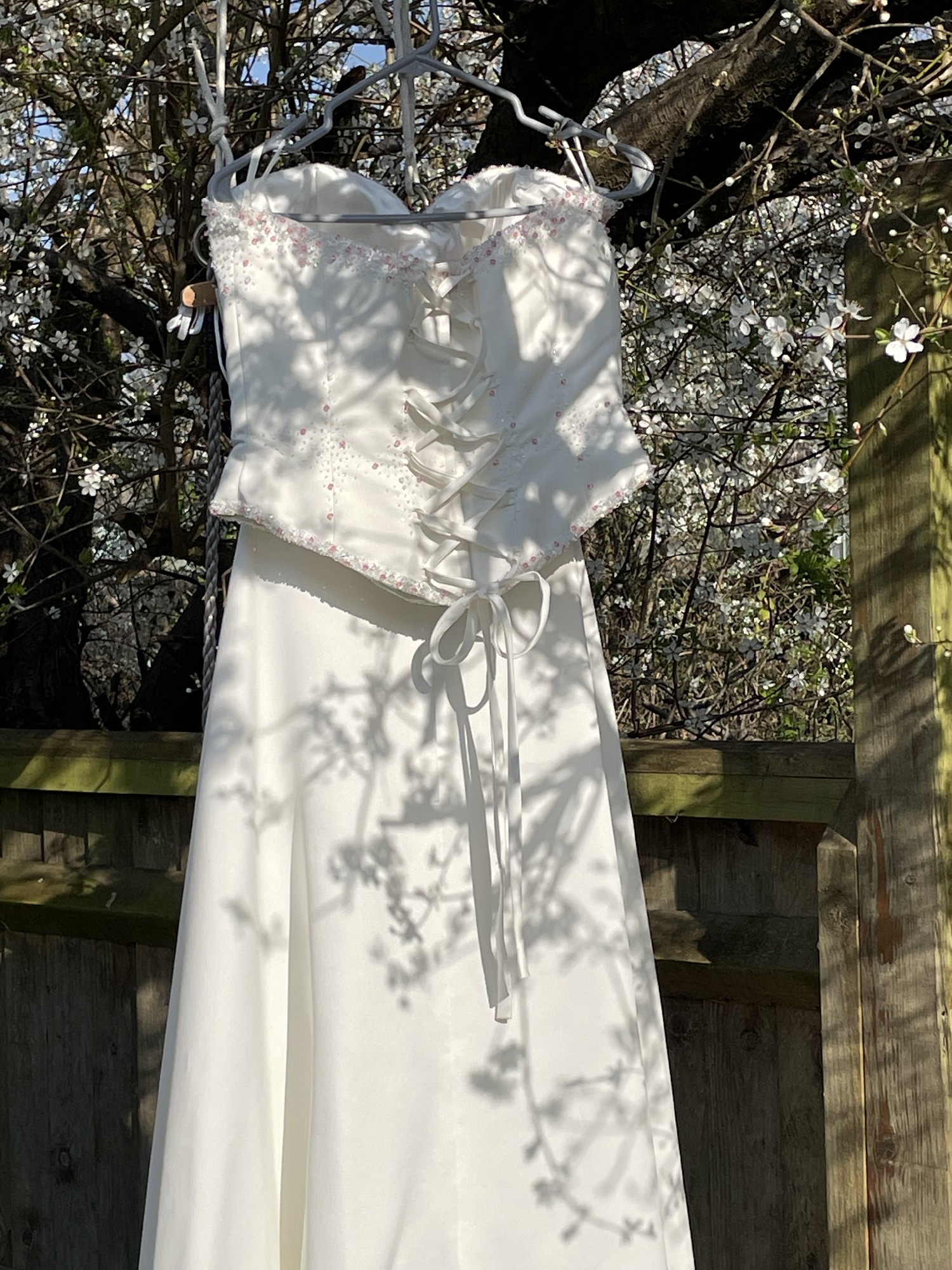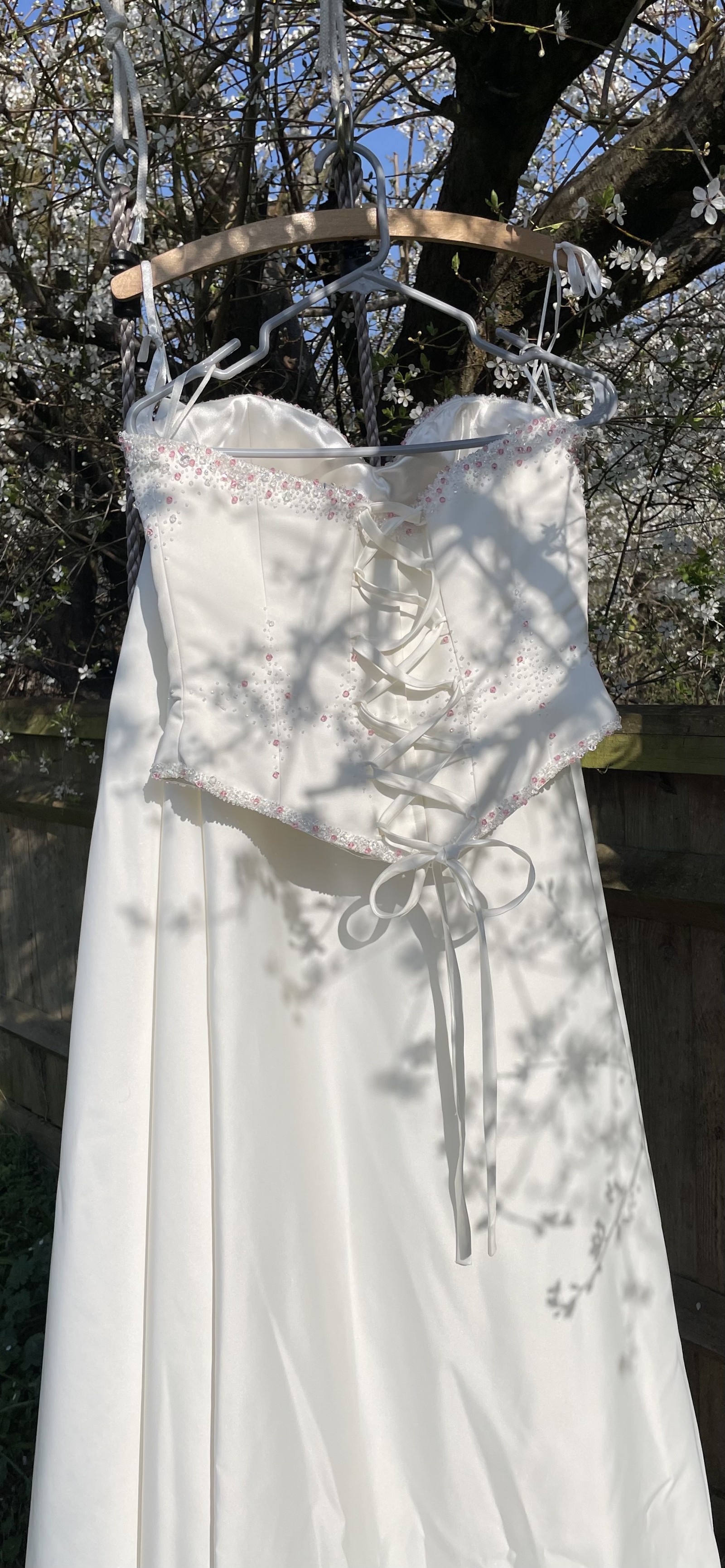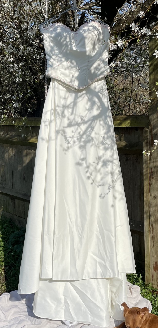 This stunning Romantica of Devon wedding dress was my dream gown, and now it can be yours. Made in a size 14, it features a flattering silhouette that beautifully showcases the female form. The sweetheart neckline adds an element of romance, while the strapless style ensures you feel elegant and confident on your special day.