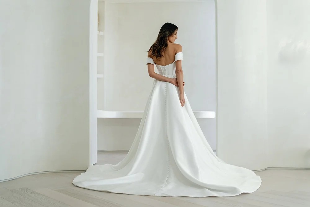 The Elena gown by Trish Peng is the epitome of modern bridal elegance. Crafted from beautifully structured fabric, the gown features clean lines and a sculpted silhouette that skims the body for a chic, contemporary look.