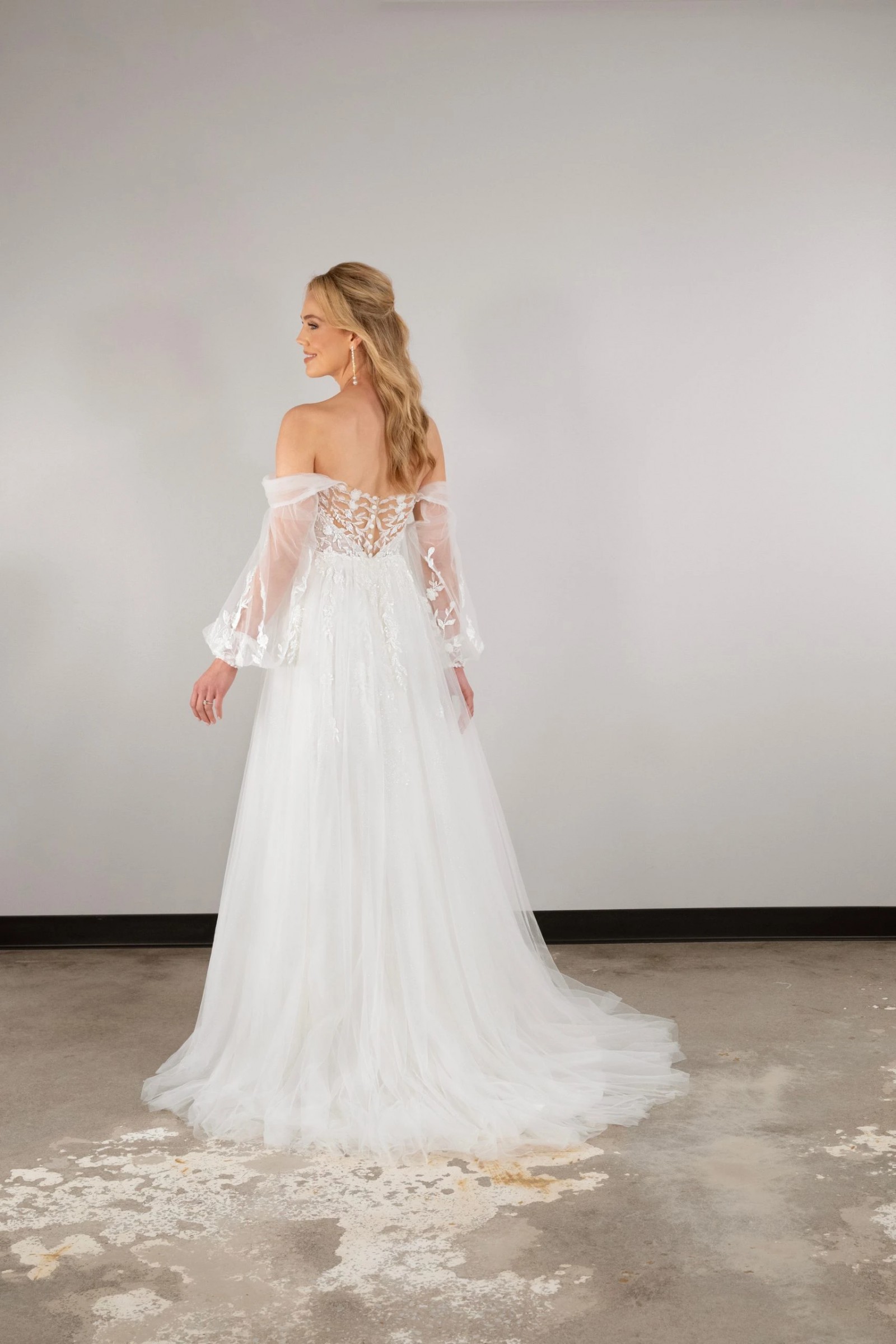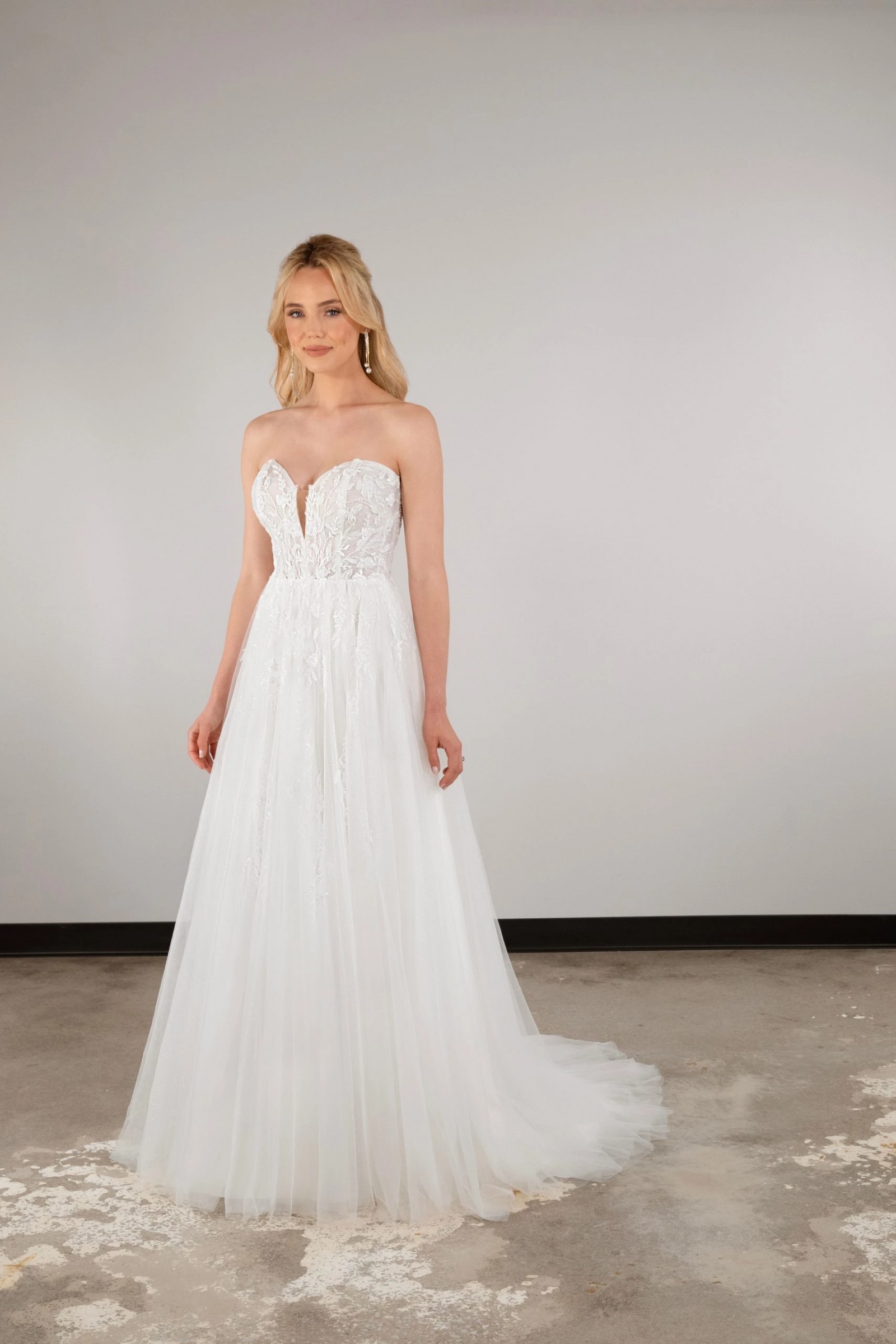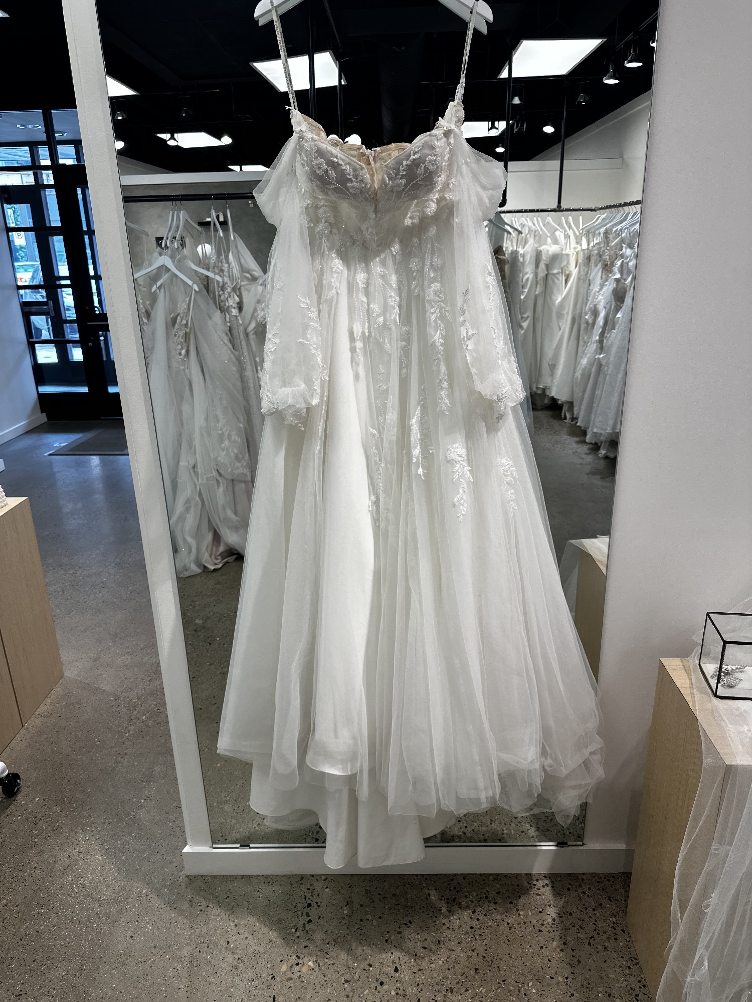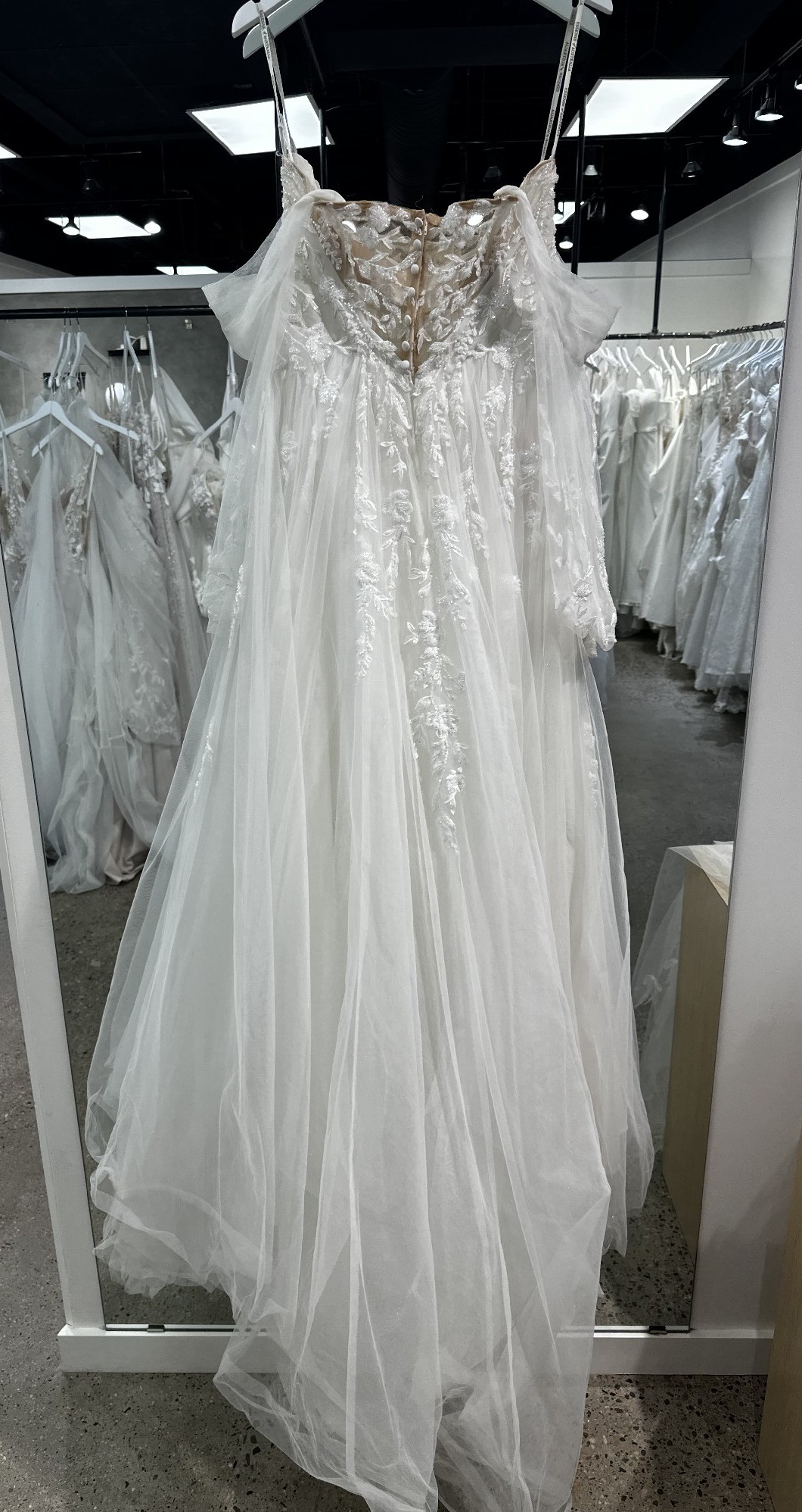 We’re a bridal store so this gown is our floor model/sample meaning we paid full price for this gown but it is our investment dress we bought for brides to try on and order off of in their desired size and color.