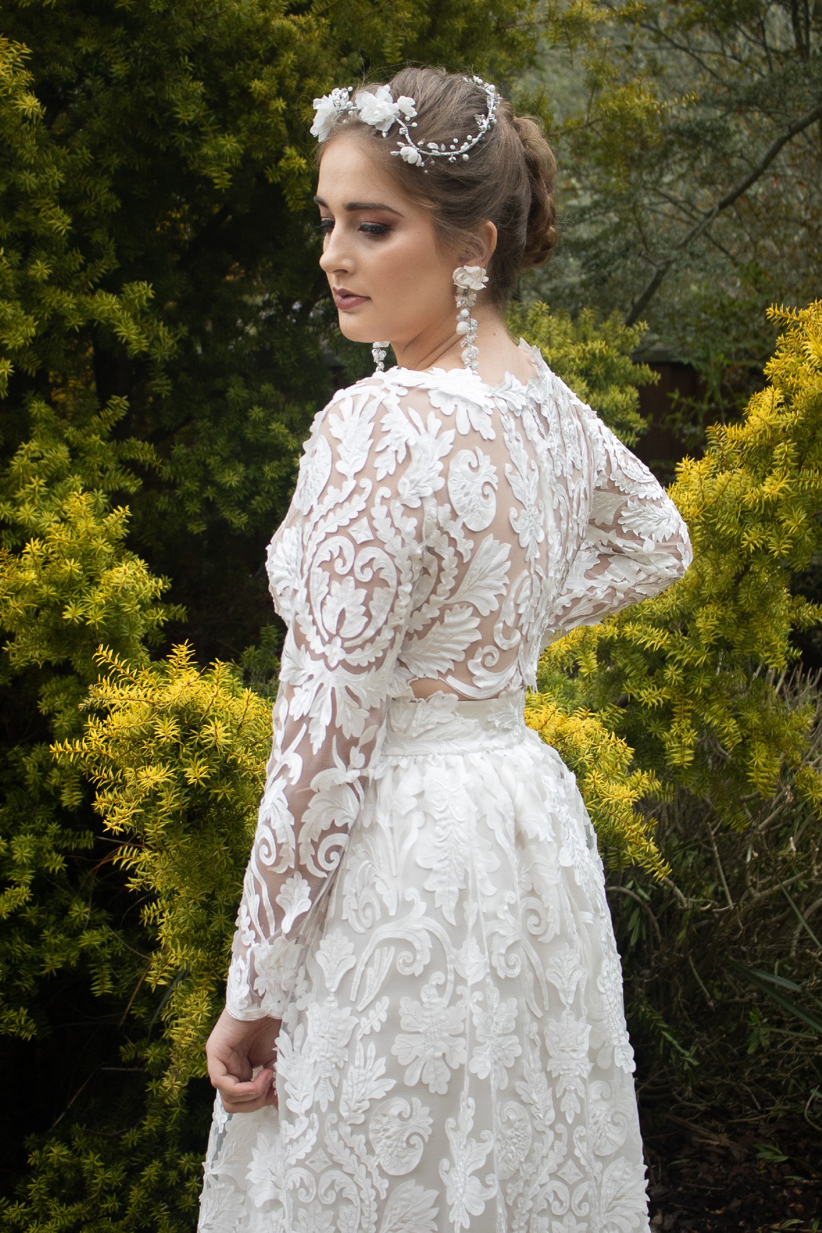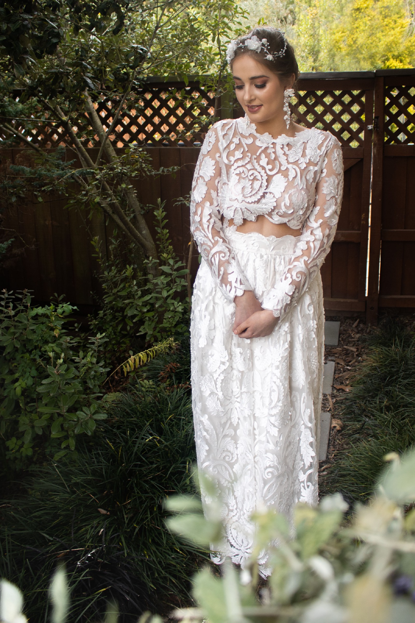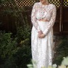 The unique separates silhouette allows for a customizable look that perfectly combines elegance and comfort, making it versatile for both the ceremony and reception. The high neck and long sleeves add a touch of timeless sophistication, while the floor-length design creates an ethereal presence that is nothing short of breathtaking.