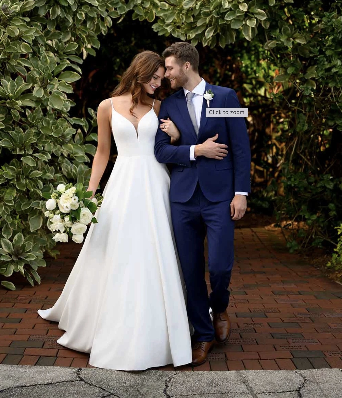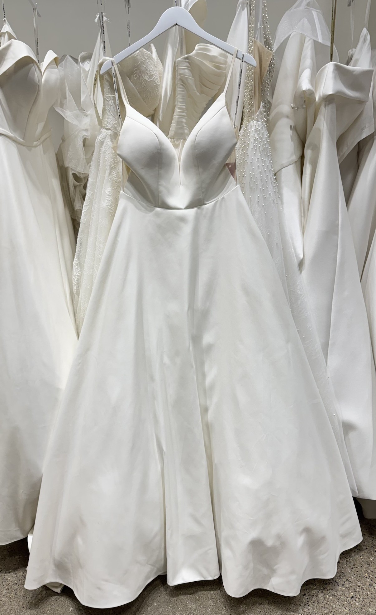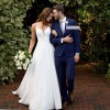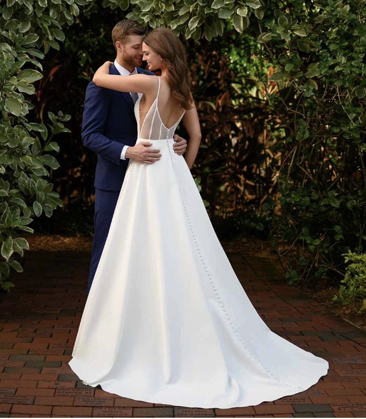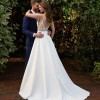 This simple and utterly chic ballgown from Essense of Australia is the statement of every modern bride's dreams! A seemingly simple design, there's more to it than meets the eye when you make your grand entrance. The curved V-neckline and shoestring straps are enough to make any minimalist fall in love, not to mention the hidden skirt pockets to send you completely head over heels. The back detail is the real piece of resistance, as the classic V-back is framed by sheer illusion paneling with exposed boning—making this dress truly fashion-forward and one of its kind.