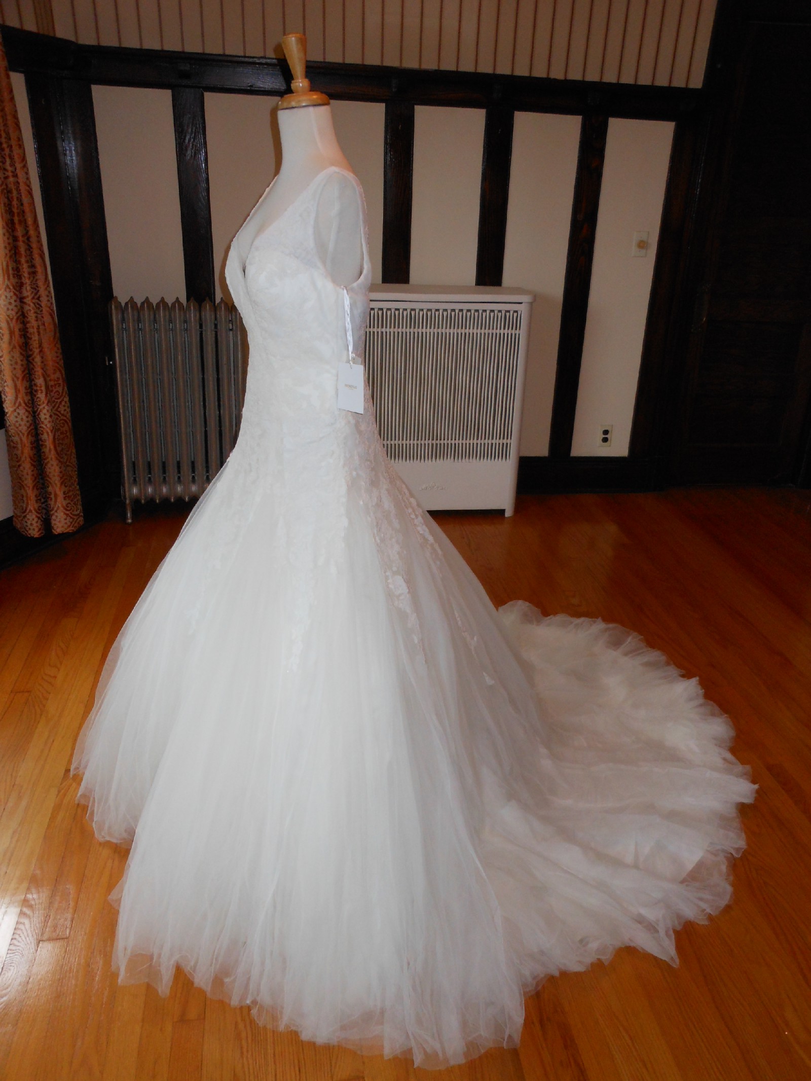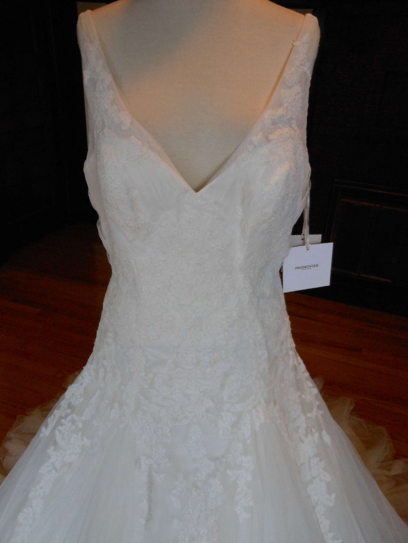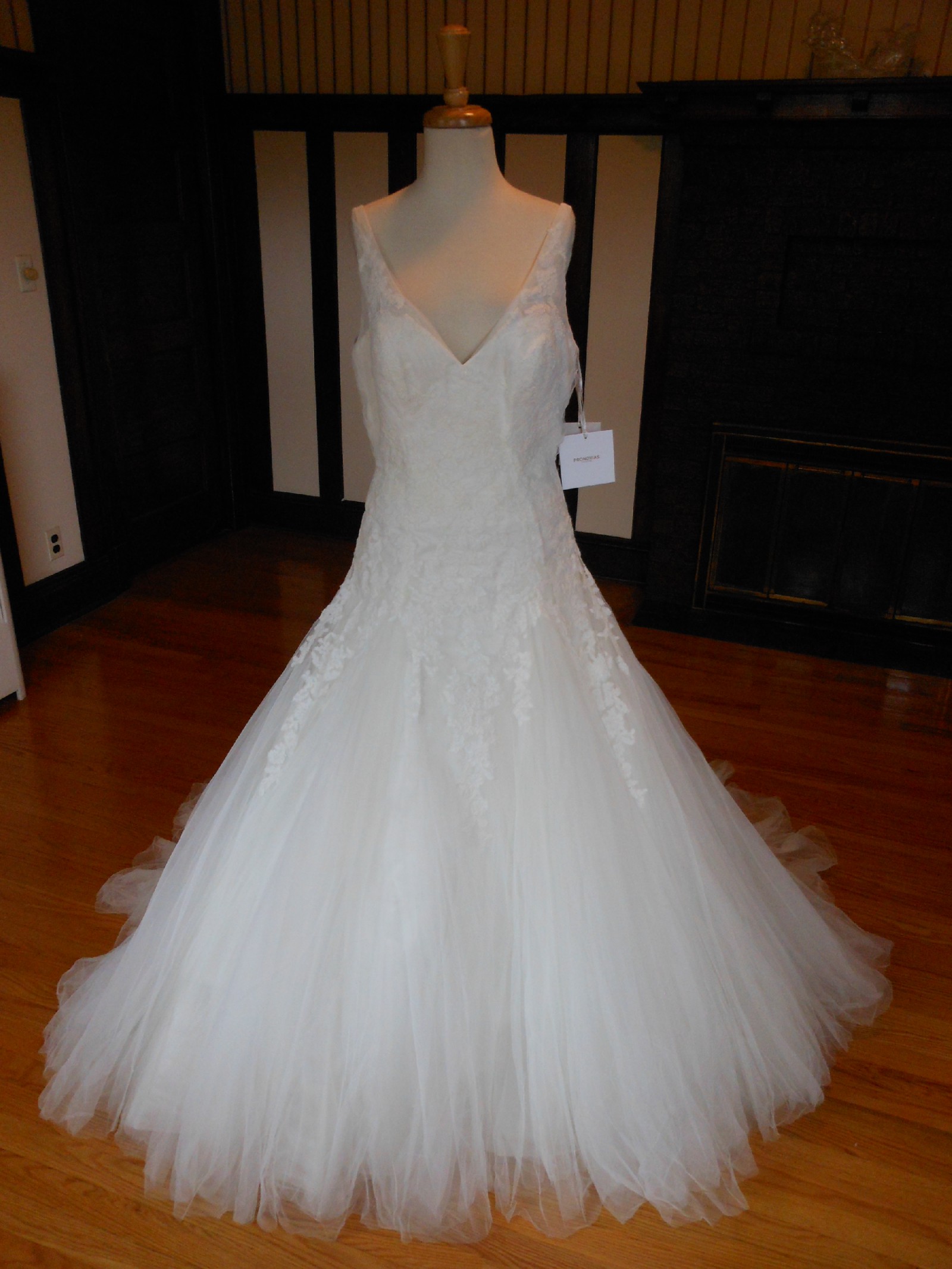 This is an Authentic PRONOVIAS Bridal Wedding Dress Gown. The name of the dress is OLY. It has a gorgeous fit and flare style with a fabulous long train. The entire bodice and upper skirt are embellished with exquisite floral lace, and sparkling beads/sequences on top of the lace. The skirt is made of high grade tulle with netting petticoat inside to support a very full shape. This dress is brand new in great condition with the original label and tags. It was never worn.