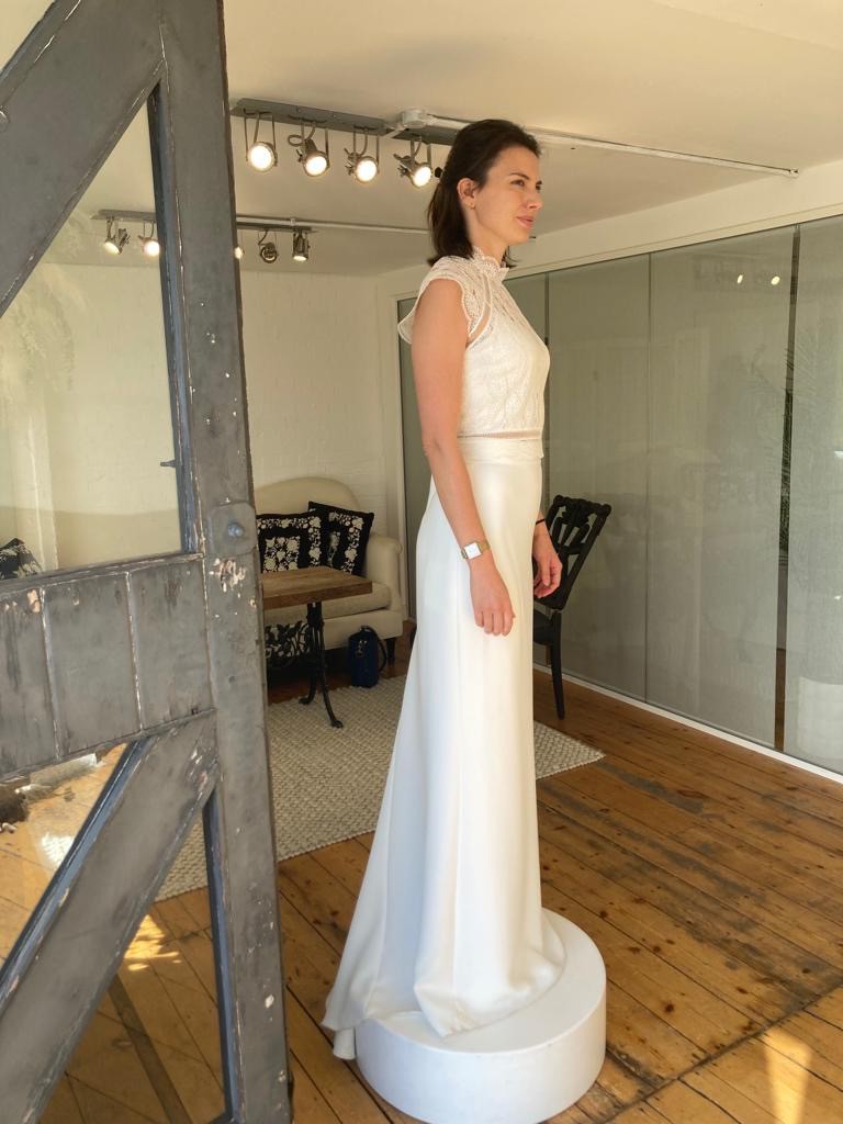 This stunning Catherine Deane wedding dress has captured my heart, and I'm excited to pass it on to another bride who will cherish it as much as I have. It has a skirt, a bustier and a delicate lace top to put on top.