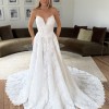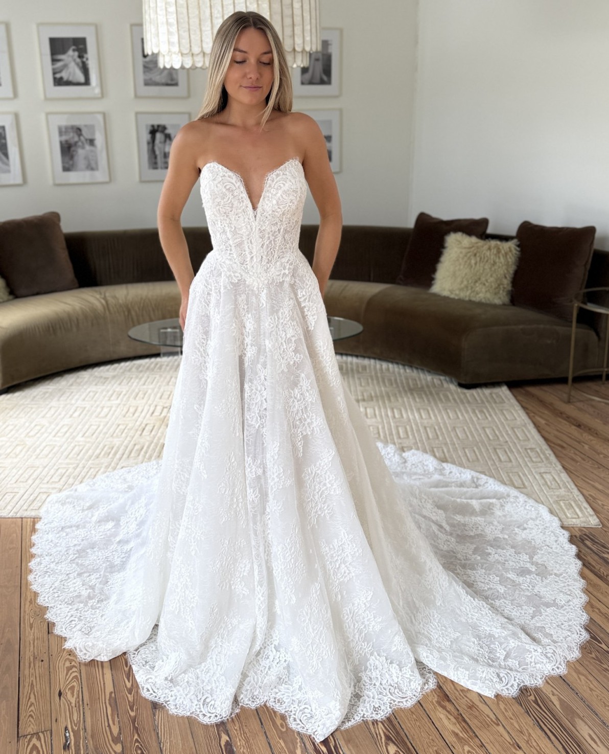The Iberis gown redefines timeless bridal style. Crafted from exquisite Chantilly Lace, it features a dramatic basque waist that flows into a striking A-line skirt, creating a silhouette that's as iconic as it is flattering. An elongated V-neckline adds a sensual, modern touch to this classic design.