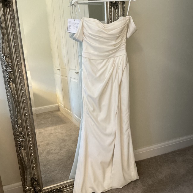IVORY – Crepe strapless bodice with shoulder drapes, wrap over skirt & built in full over train & button back