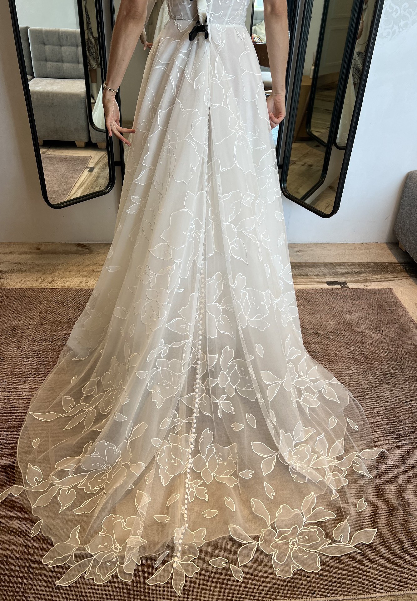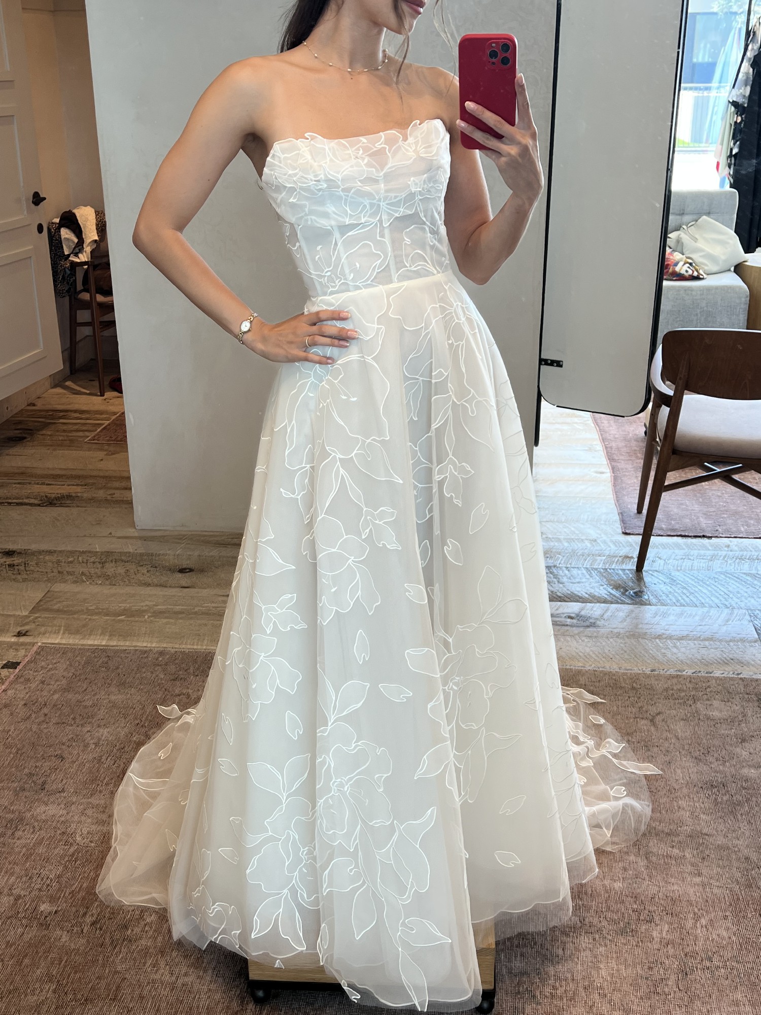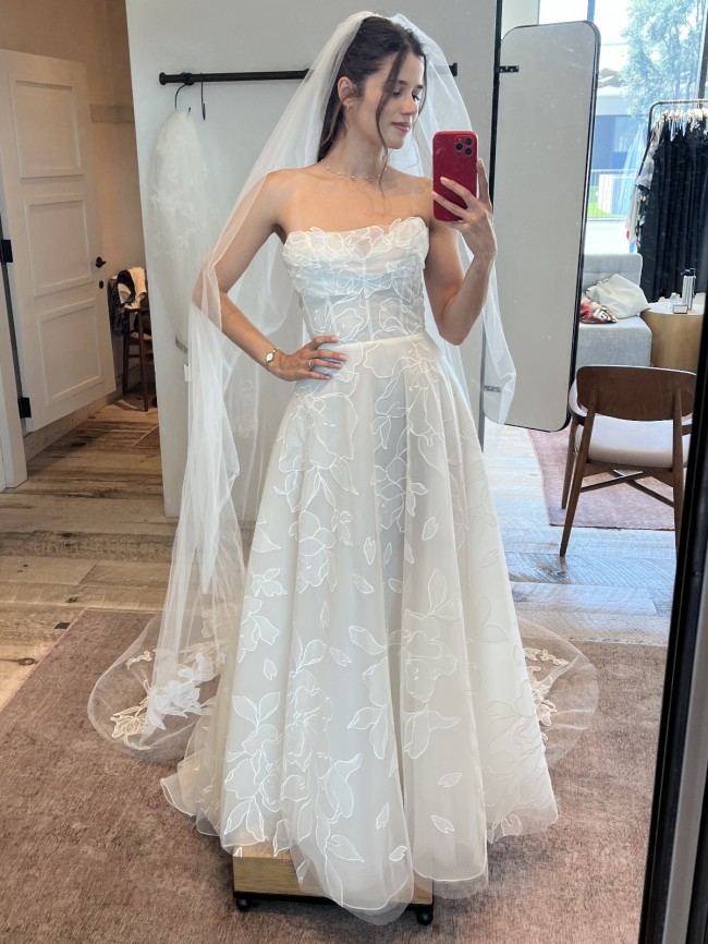 Airy organza with intricate floral appliqués, Lorelai Wedding Gown is light as a feather, but features a fully boned corset for a sculpted silhouette and a full skirt (with pockets!).