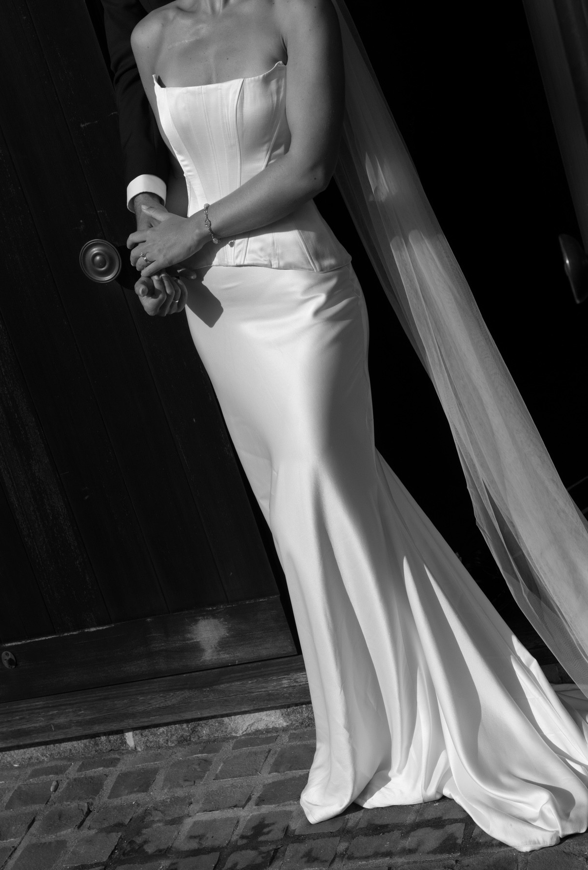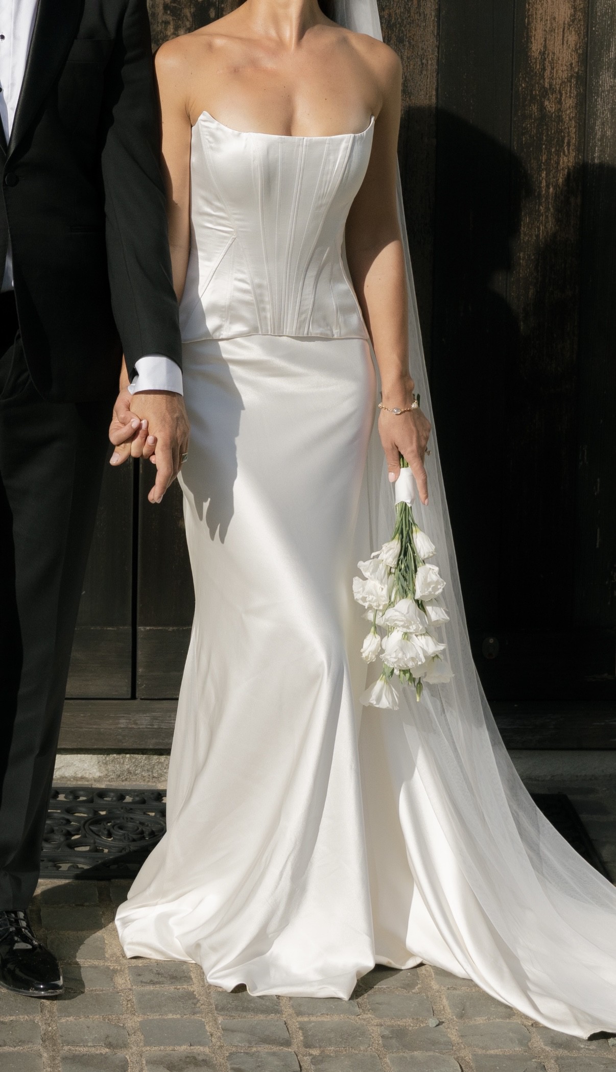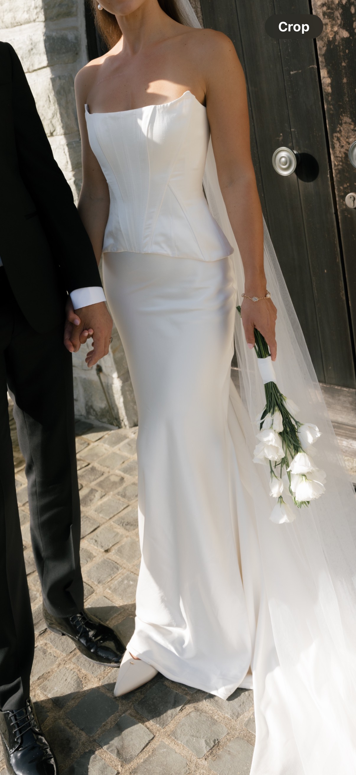 Stunning Prea James set! Prea James Penelope Corset & Sadie Skirt – Silk Satin, Modern Two-Piece Selling my stunning Prea James Penelope Corset and Sadie Skirt! I was obsessed with this set, would love to keep it but I hope this is my only wedding and won’t need it again :) Prea James two piece set - Australian designer. Fit details: - Corset a size 7. More of an 8 at the bust. - Skirt was originally a 12 at the hips and 8 waist, then taken in at the hips to a 10 for more of a flare fabric at the bottom waist stayed the same. - I am usually a size 8, with slightly smaller waist and wider hips. - Colour: Pale ivory silk satin. Bodice outer is not silk but lining is, and skirt is silk. - Note that the fit on some others and the Prea James website has the bodice sitting away from the body at the bottom. I preferred the sleek look and this one was fitted on me all the way through as shown in my pictures. - I am 175cm tall with no shoes - most of the photos pictured I was wearing flats which is why it looks a little longer at the front. Then changed into 5cm heels later. There are some small marks on the bottom and on the underside of the bottom of the skirt and other minor signs of wear. These shouldn’t be easily seen/noticed when wearing. Or if you are shorter you could hem. Photos can be shared of the minor wear signs. From the Prea James website: Penelope Corset: A beautifully structured, fully boned corset with a modern scoop neckline and contoured panelling. It creates a flattering, feminine silhouette with a firm fit through the bust and waist, while still allowing you to sit and move comfortably throughout the day. Sadie Skirt: A fit-and-flare silhouette that hugs in all the right places, with godets through the seams to create a soft, dramatic flare. The waistband sits just above the natural waist for a flattering hourglass shape. The 100% silk satin has a stunning lustre that photographs beautifully. Optional add-ons: - Neck scarf/sheer wrap - I did not wear it in the end but can send photos - Plain satin mini skirt which I changed into later on and wore with the bodice seen in the last photo. Message me for further details, additional photos, or if you’re interested in purchasing any of the accessories. Sydney-based.
