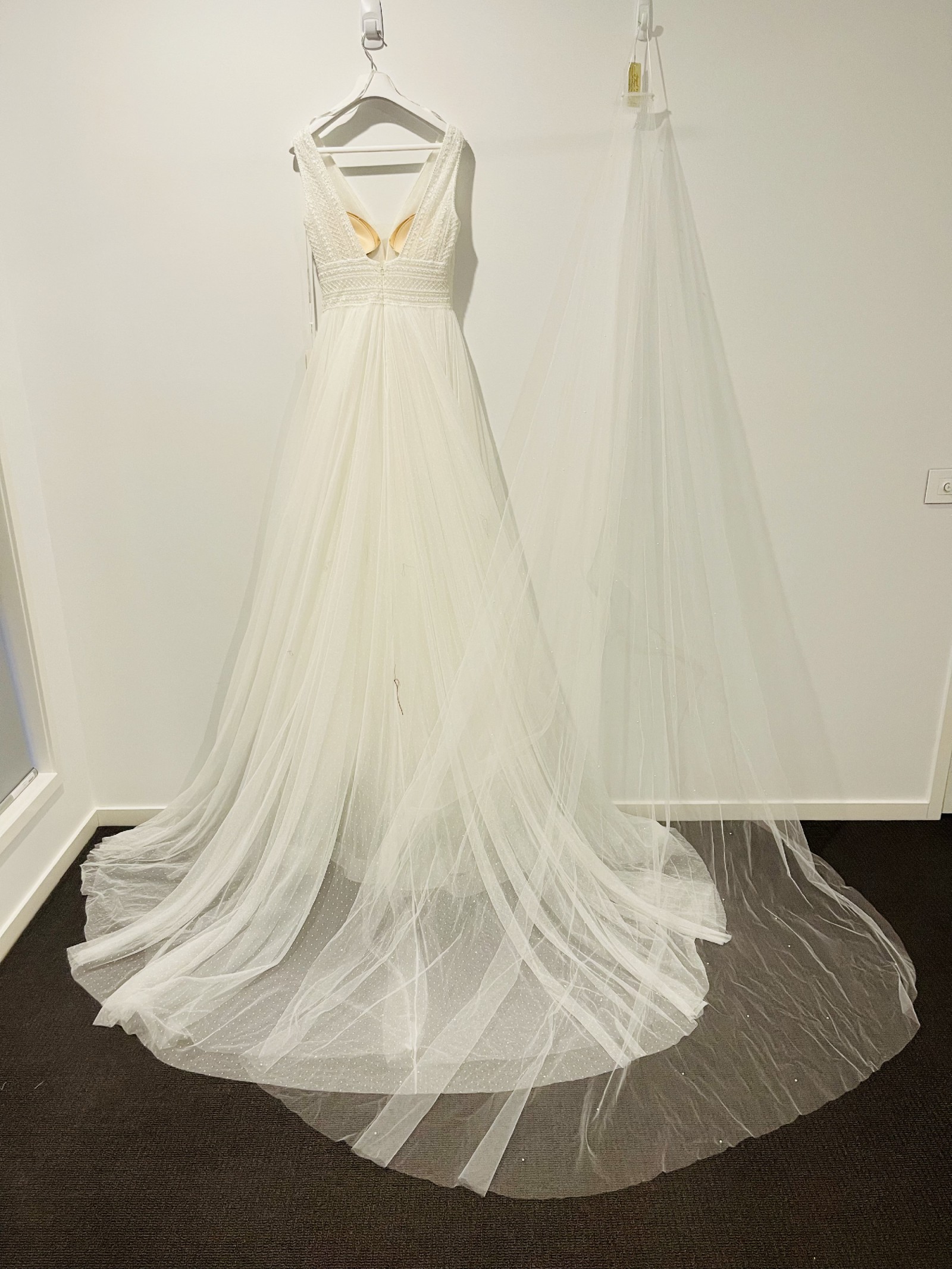 This is Rosa Clara ball gown dress with the top having all beading done by hand and the skirt being 6 layers of dot tulle
