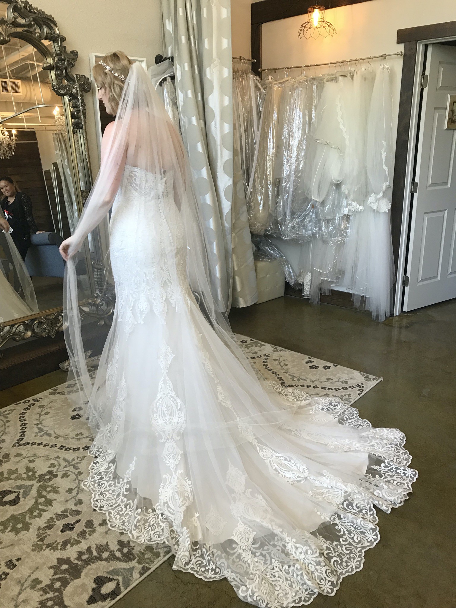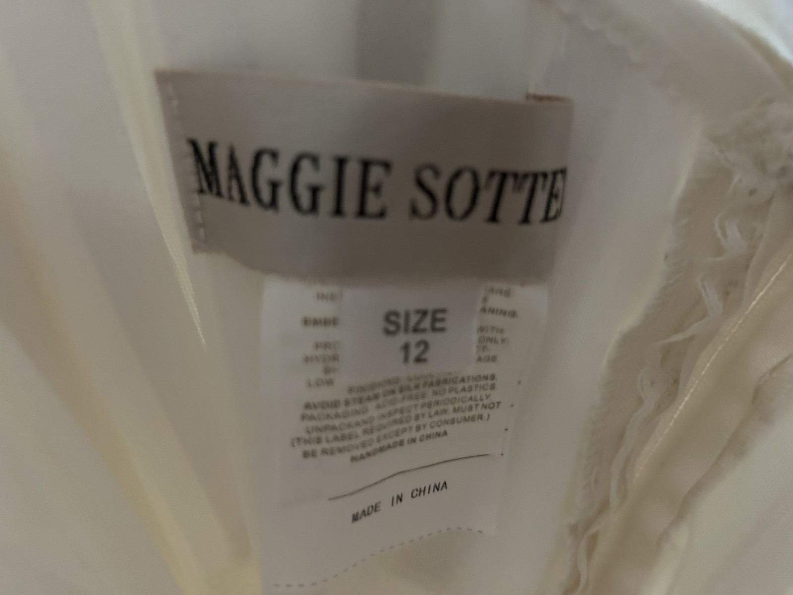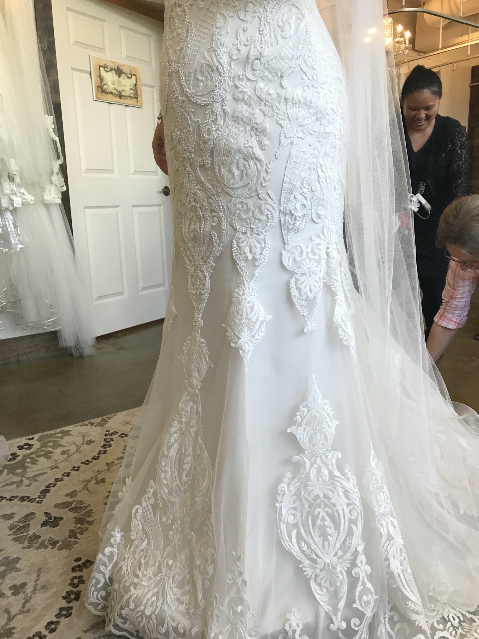 This dress has never been worn. Kept pristine in a wedding dress storage box, complete with handling gloves, hanger and dress bag.