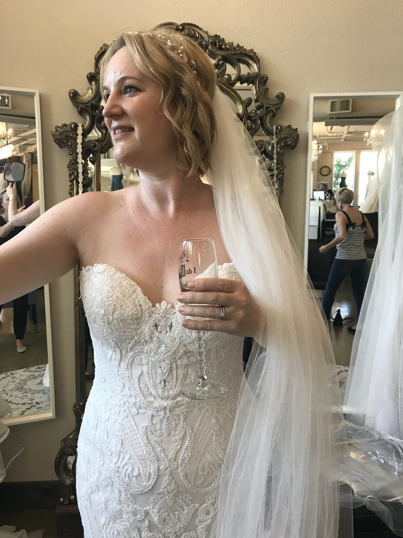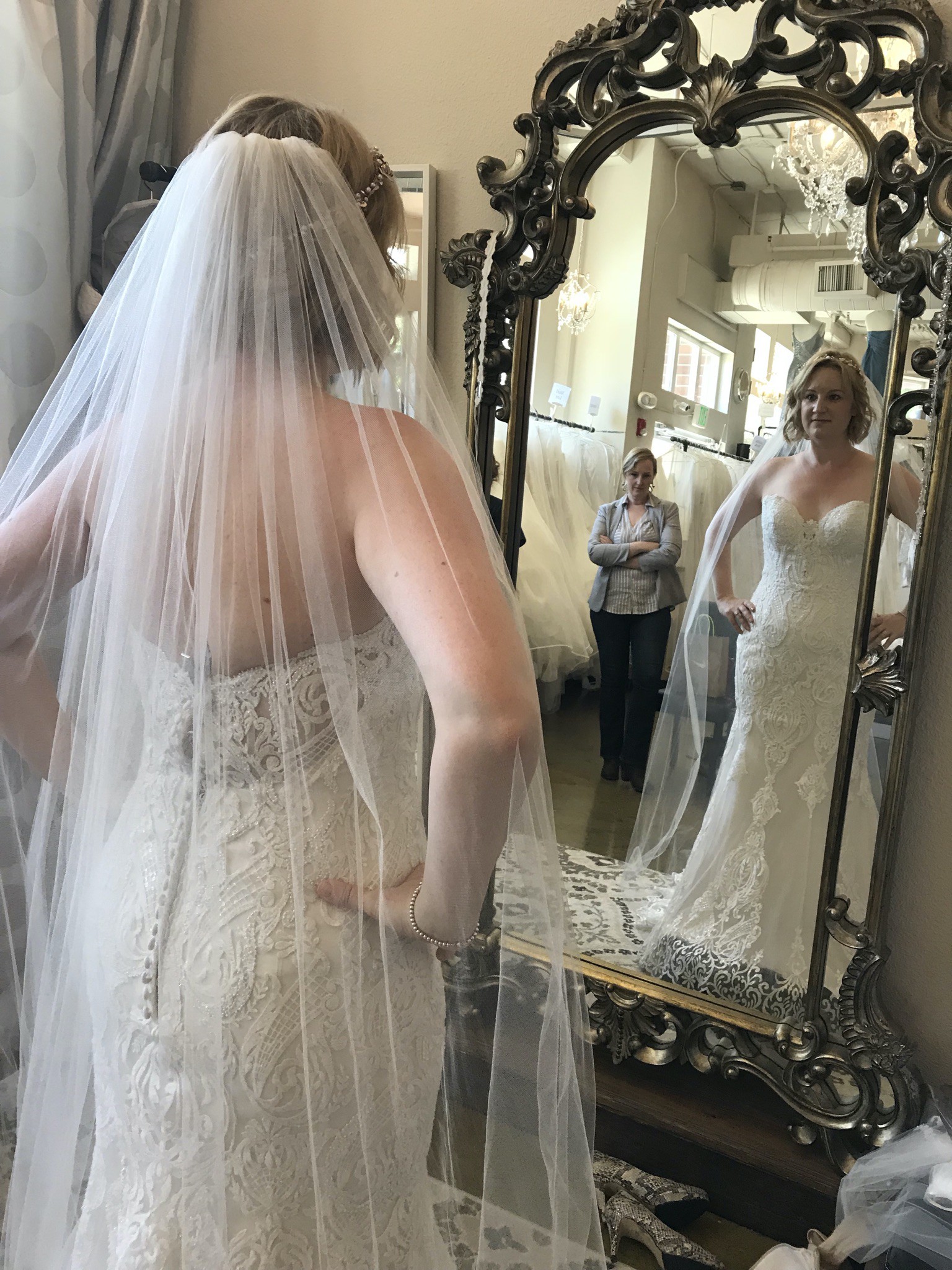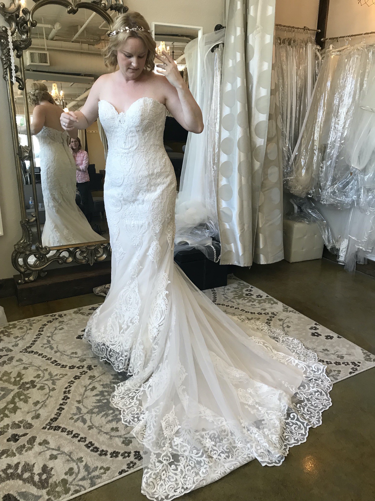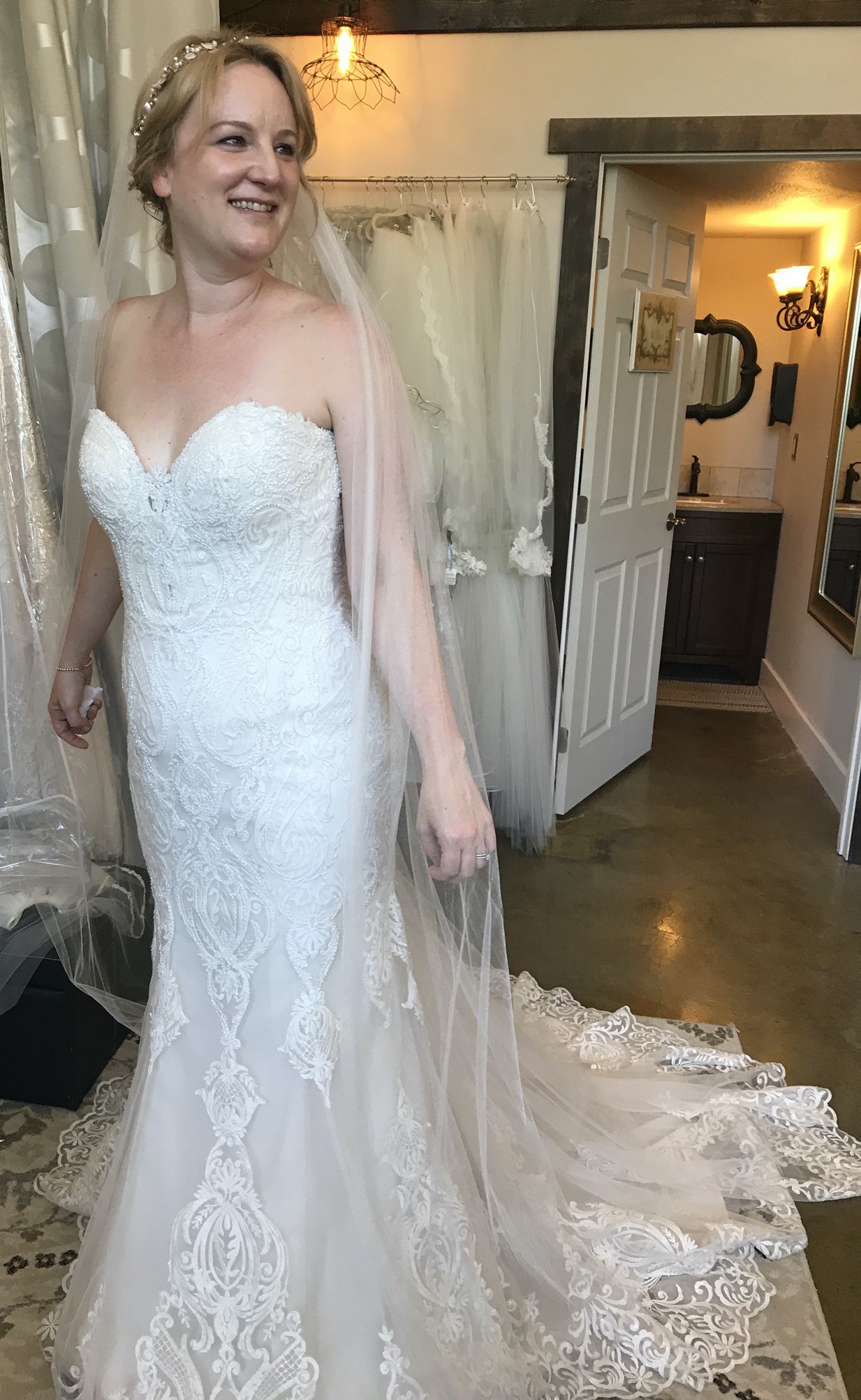 This dress has never been worn. Kept pristine in a wedding dress storage box, complete with handling gloves, hanger and dress bag.