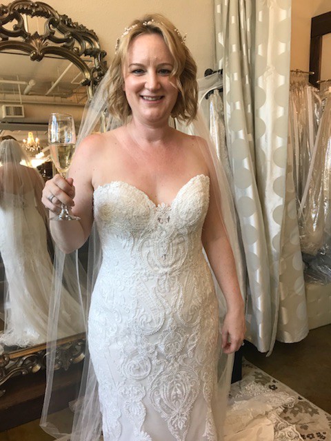 Beaded lace motifs cascade over tulle in this fit-and-flare wedding dress, accenting the illusion plunging-sweetheart neckline and illusion scoop back. Lined with shapewear for a figure-flattering fit. Finished with covered buttons over zipper closure.
