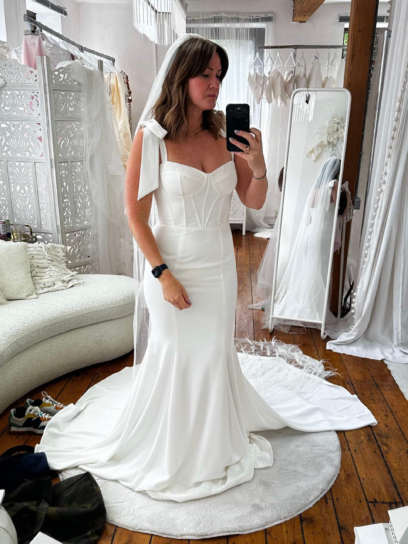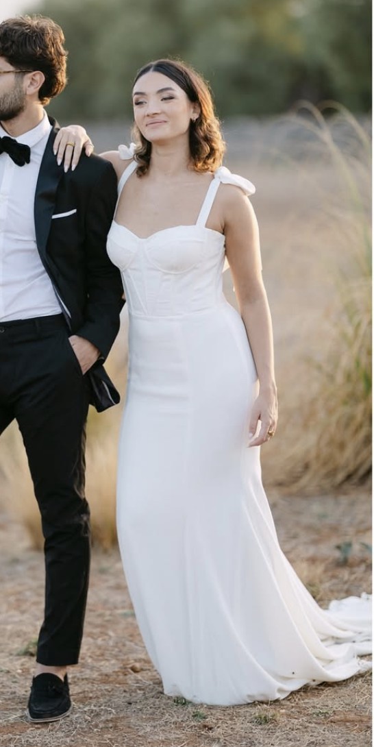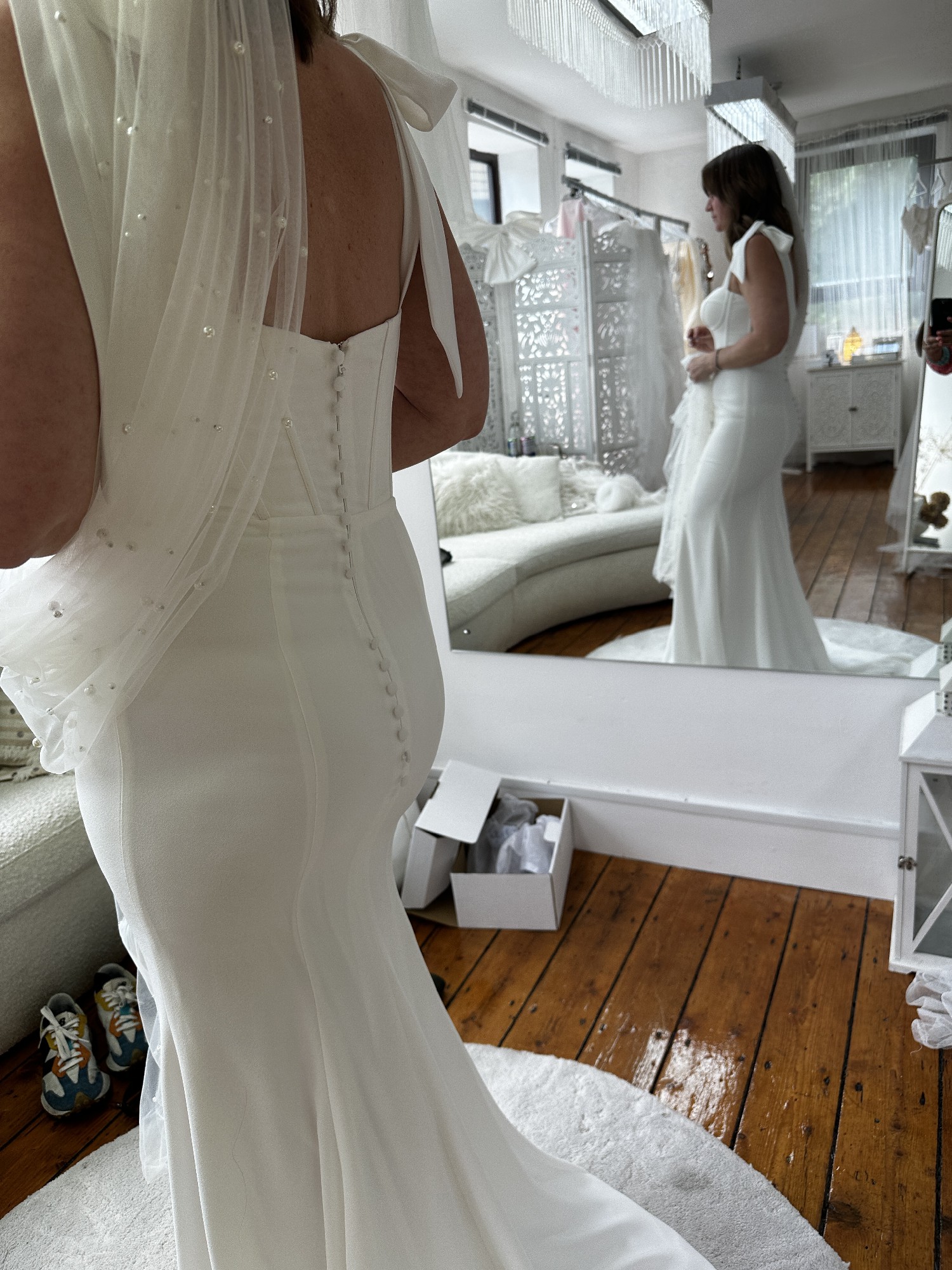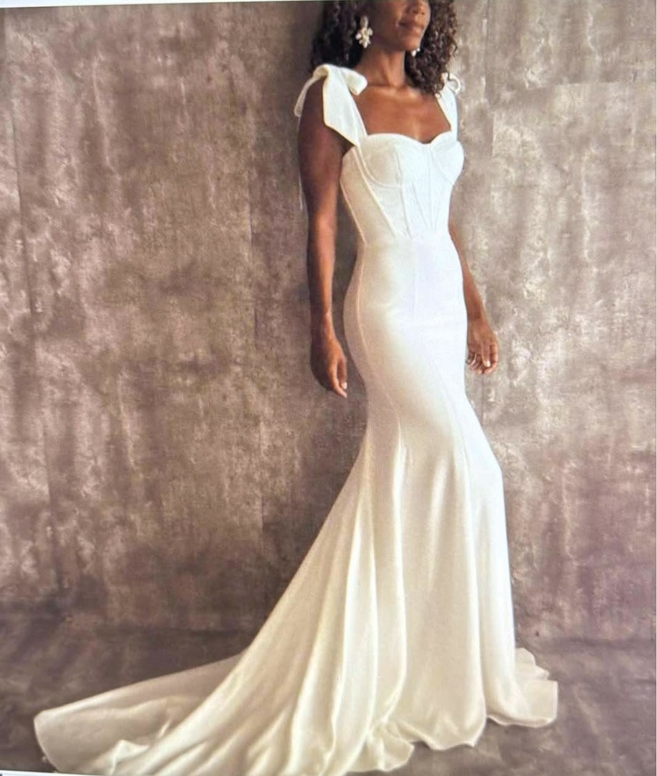 Stunning dress. Simple but some detail. Classy, elegant. Straps that tie in a bow so can be adjusted. Bows are 2026 trend. Bust Cups for support. Comes with pearl veil.