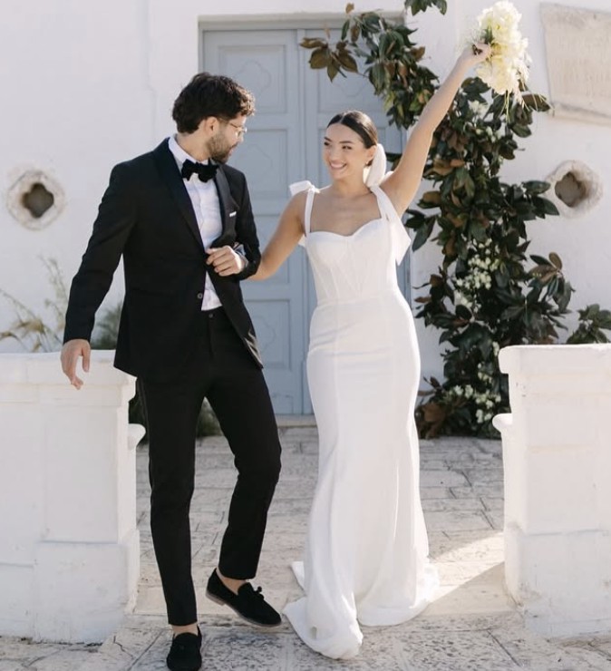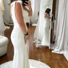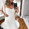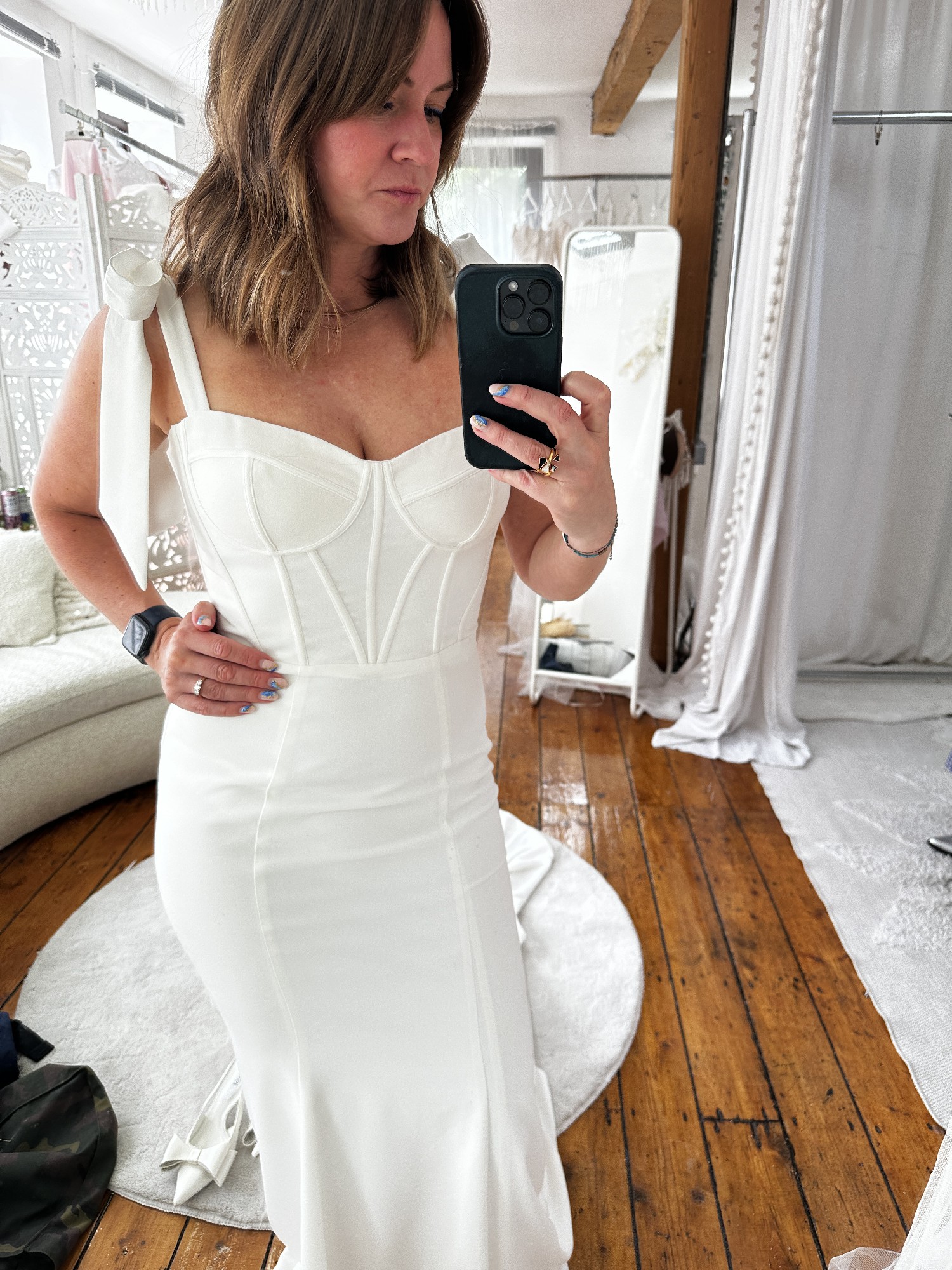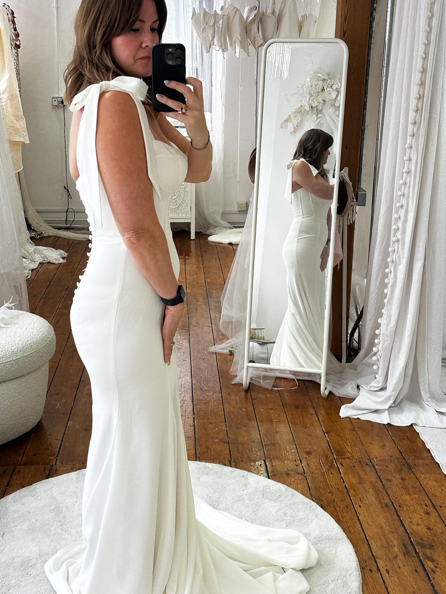 Stunning dress. Simple but some detail. Classy, elegant. Straps that tie in a bow so can be adjusted. Bows are 2026 trend. Bust Cups for support. Comes with pearl veil.